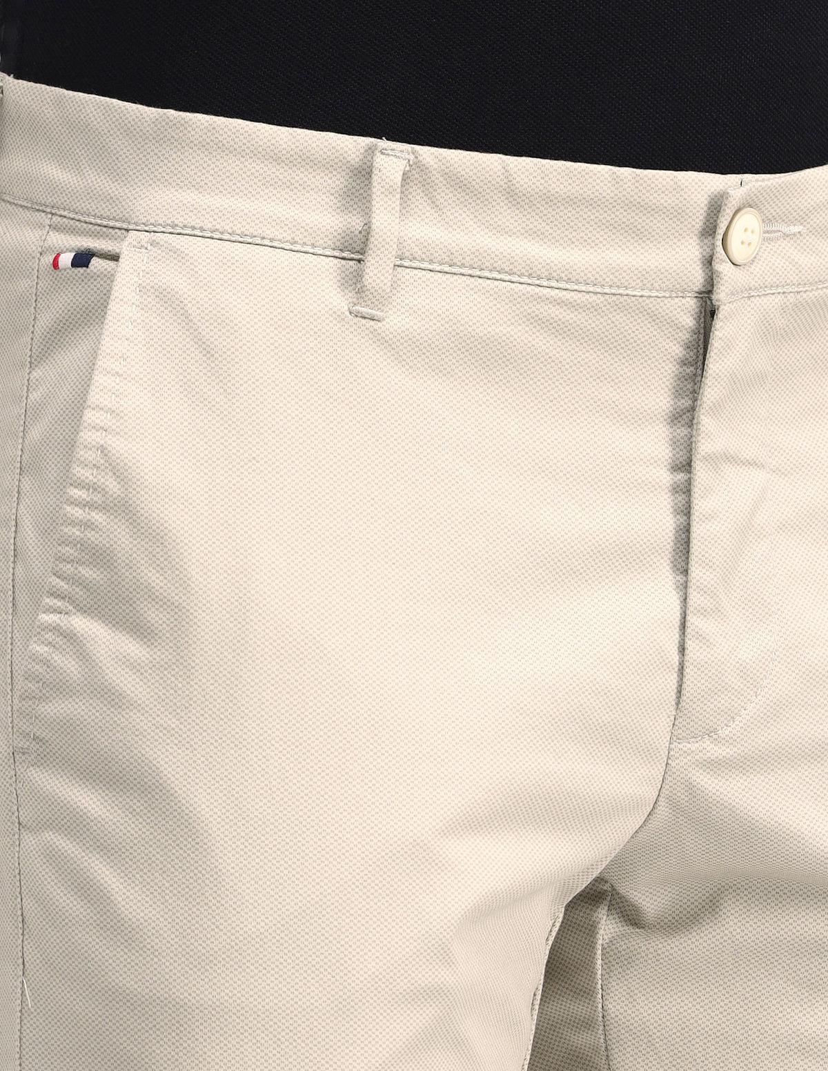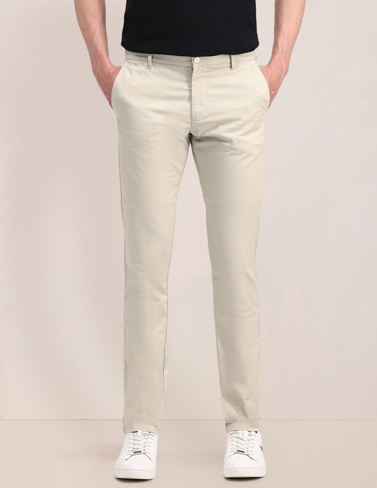 | Mid-rise waist | Button and zip fly closure | Four pockets | Flat front | Solid pattern | Regular fit