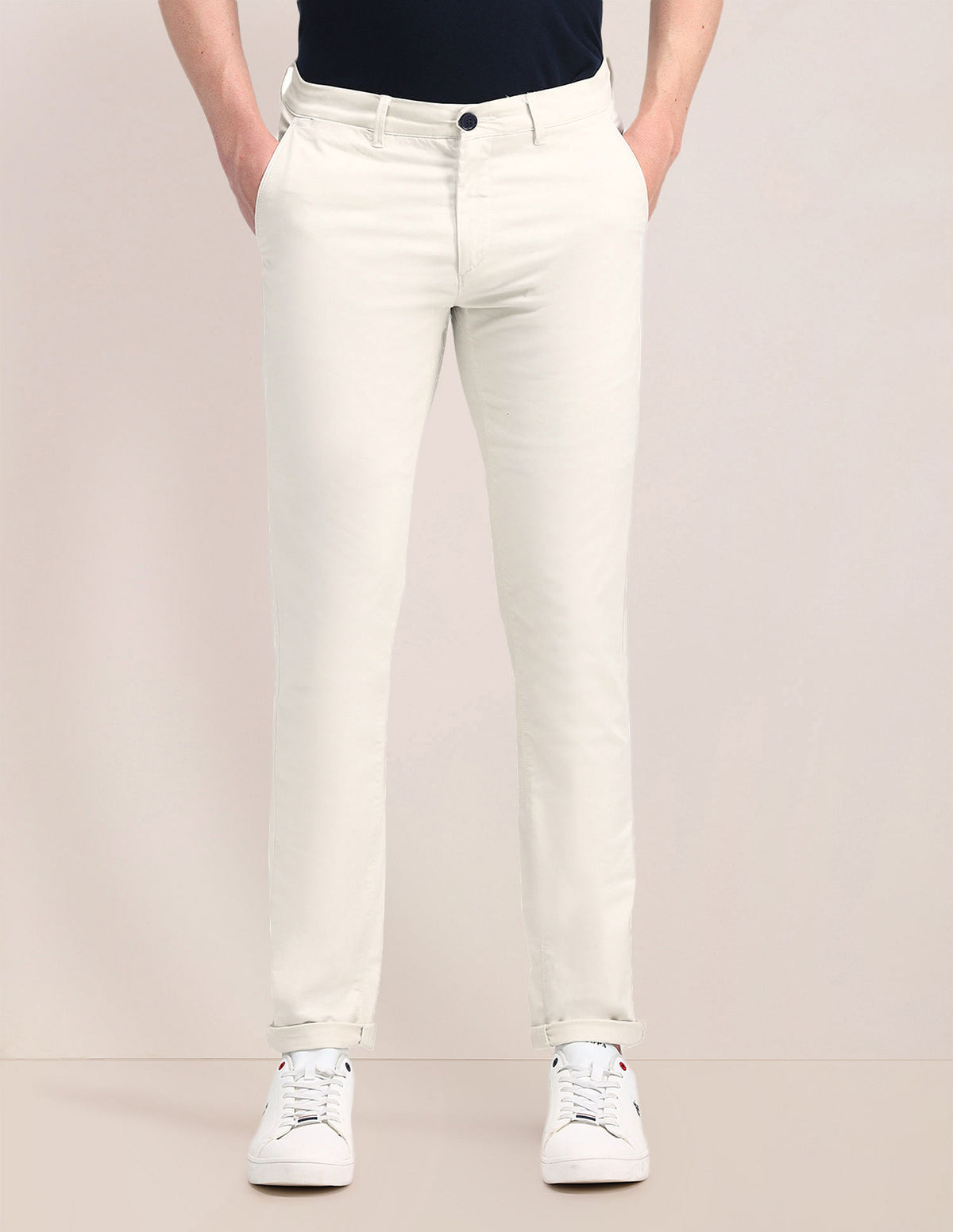 | Mid-rise waist | Button and zip fly closure | Four pockets | Flat front | Solid pattern | Regular fit