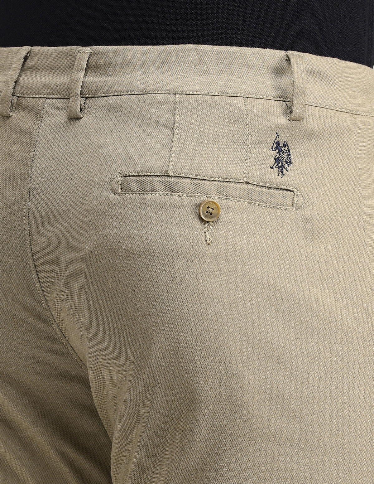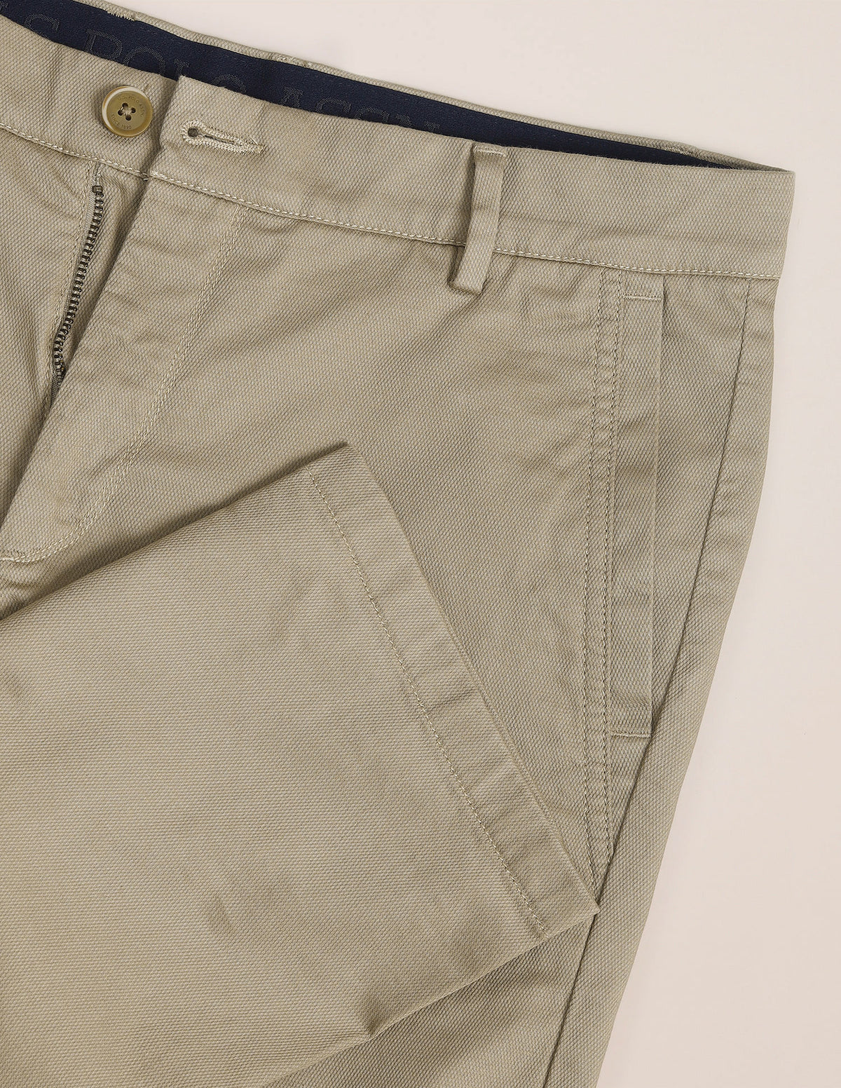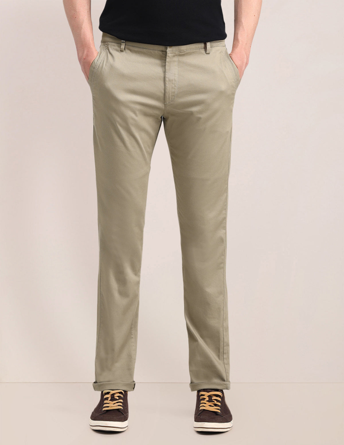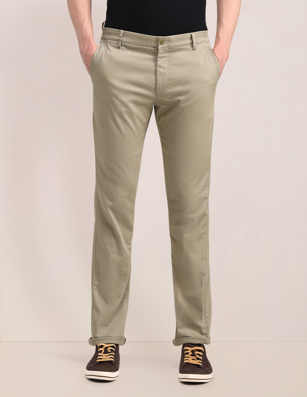 | Mid-rise waist | Button and zip fly closure | Four pockets | Flat front | Solid pattern | Slim fit