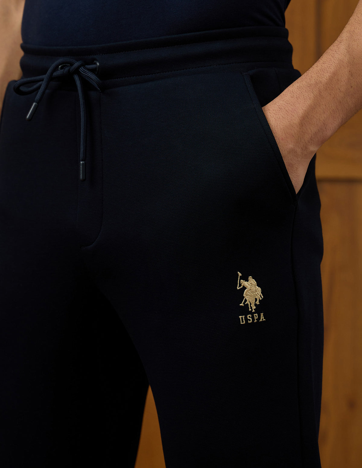 - Logo at left leg
