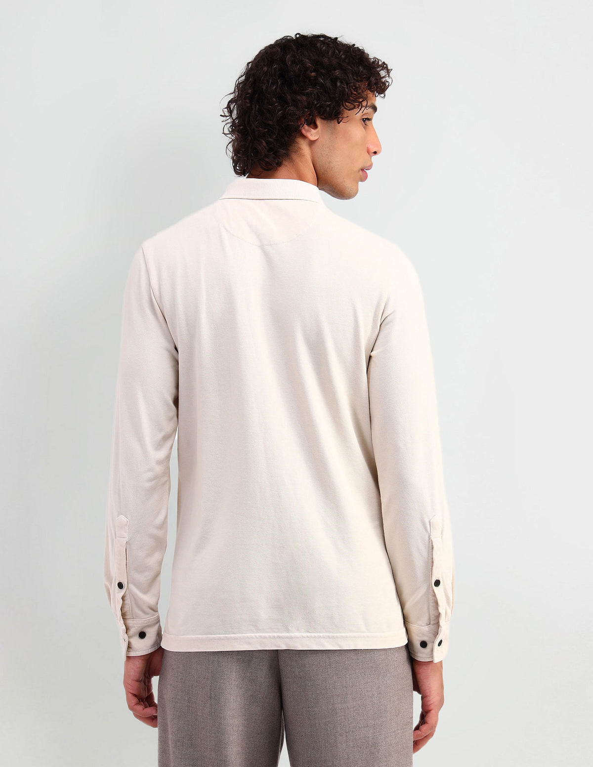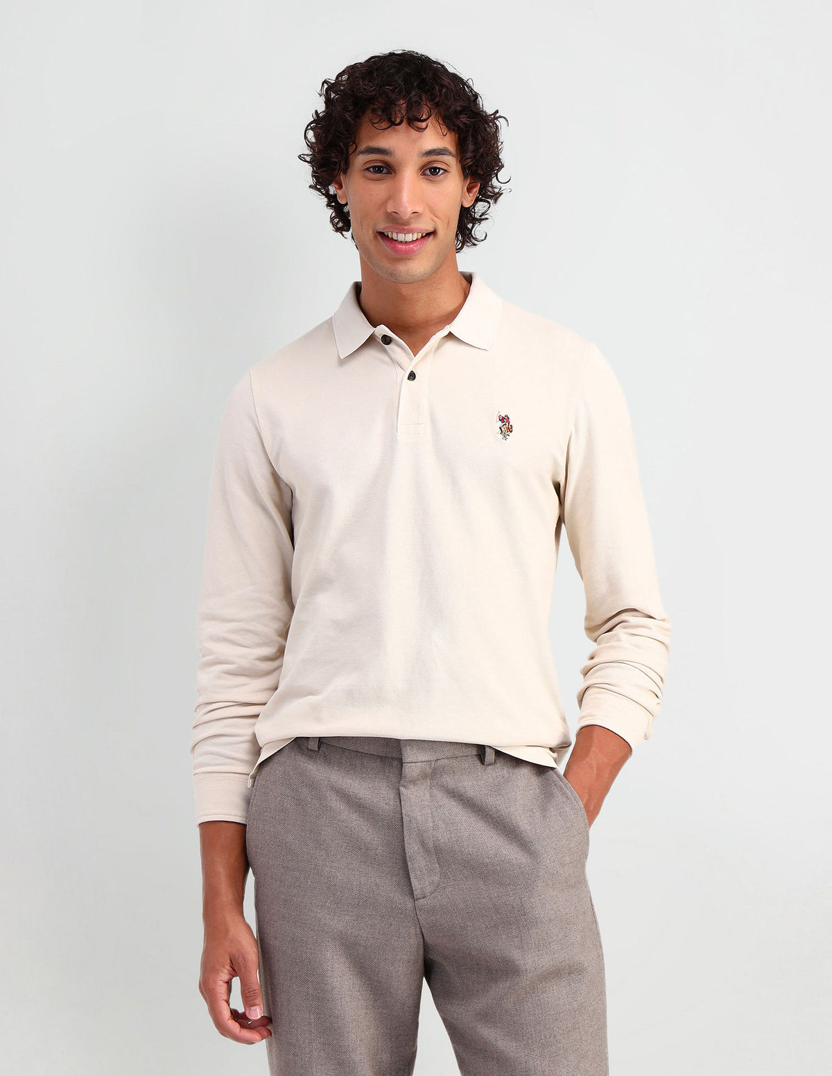 | Polo collar | Logo at chest | Short button placket | Long sleeves with buttoned cuffs | Ribbed collar and sleeve hems | Uneven vented hem | Solid pattern | Pique knit | Muscle fit |