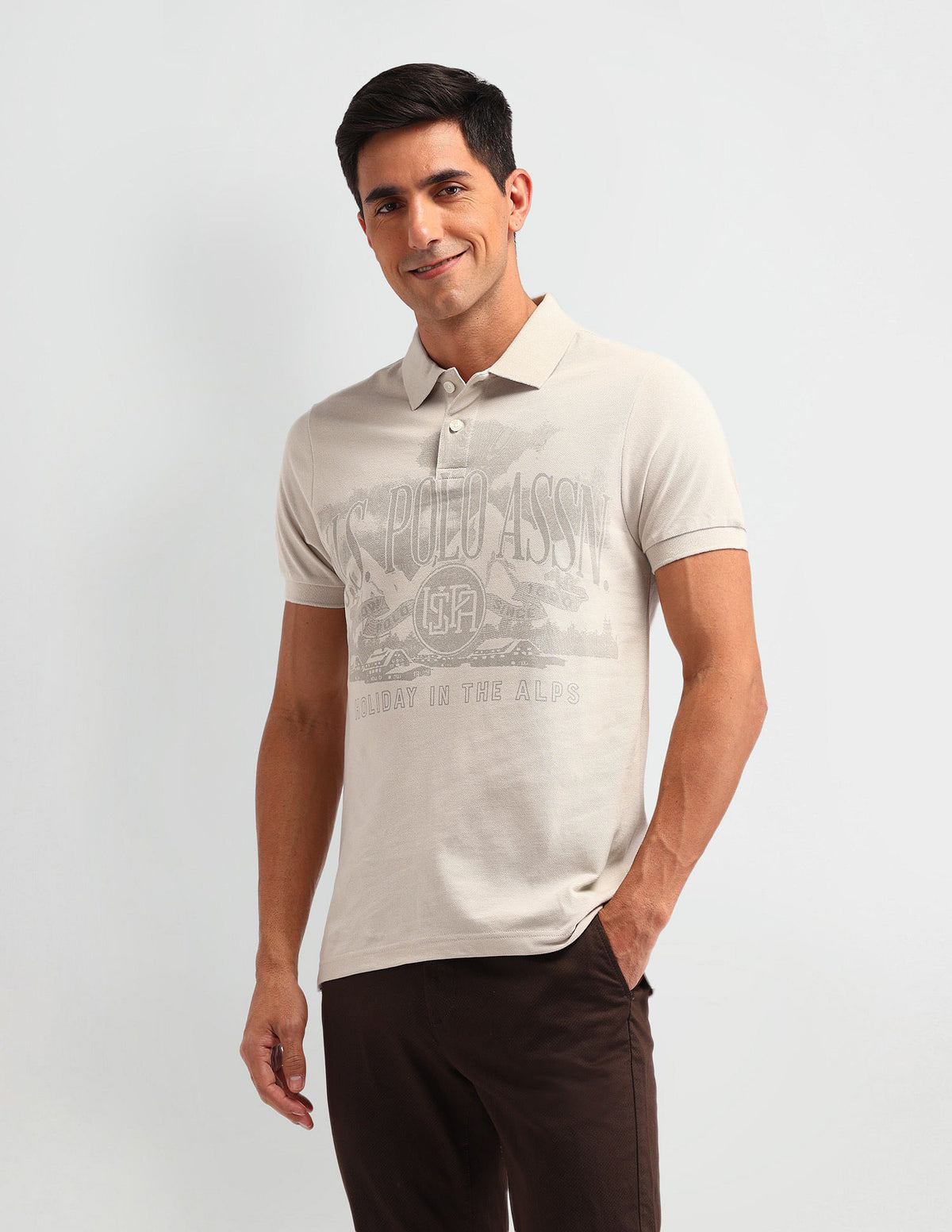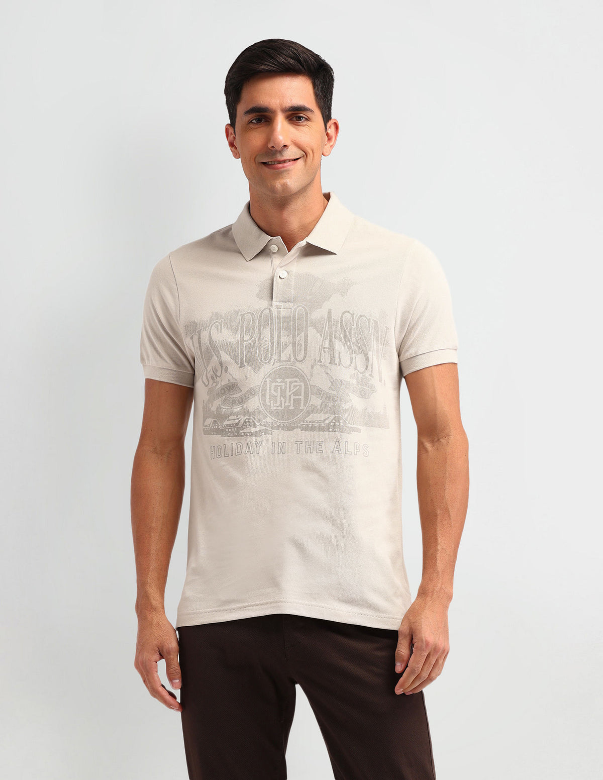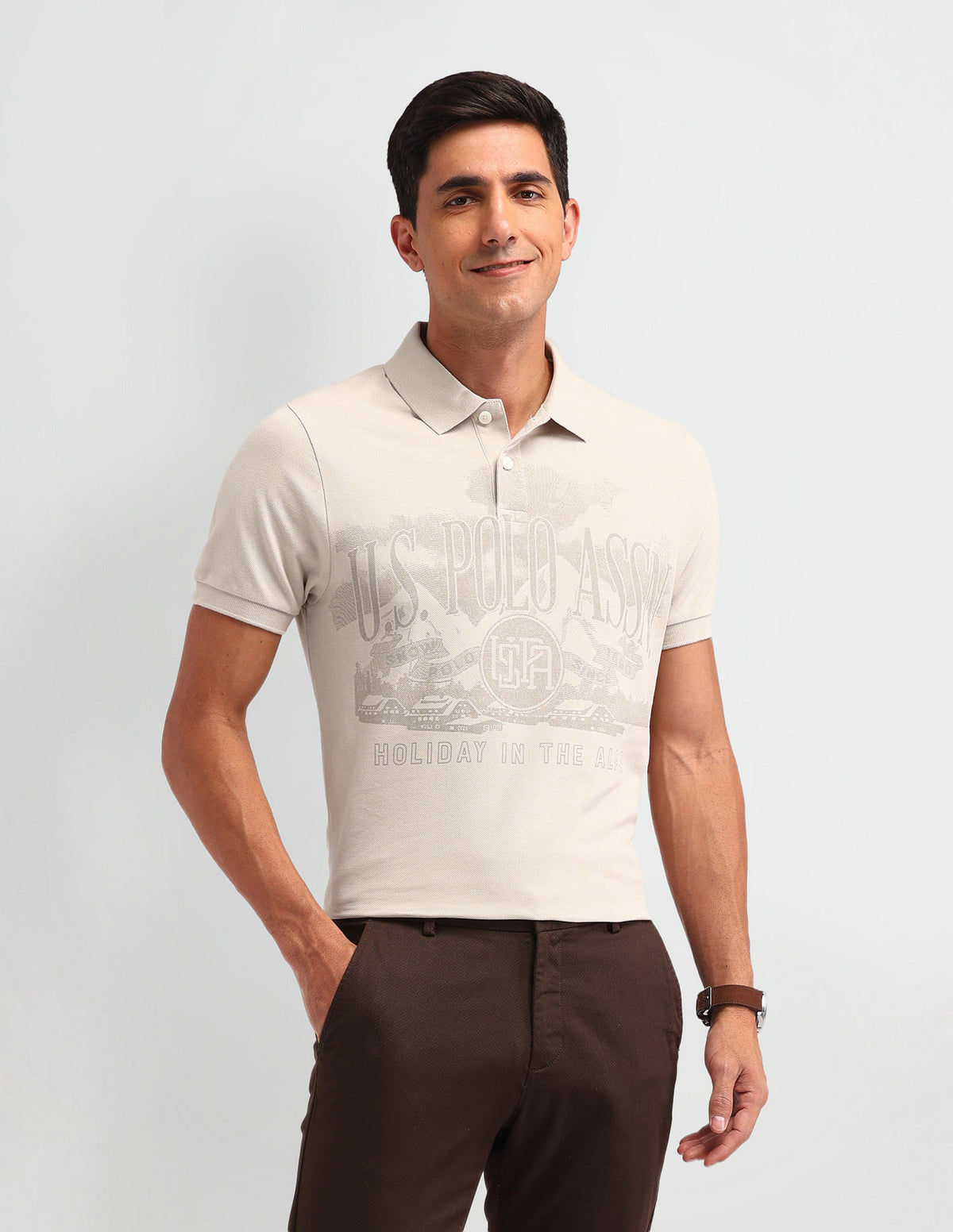 | Polo collar | Short button placket | Short sleeves | Ribbed collar and sleeve hems | Uneven vented hem | Brand printed pattern | Pique knit | Muscle fit |