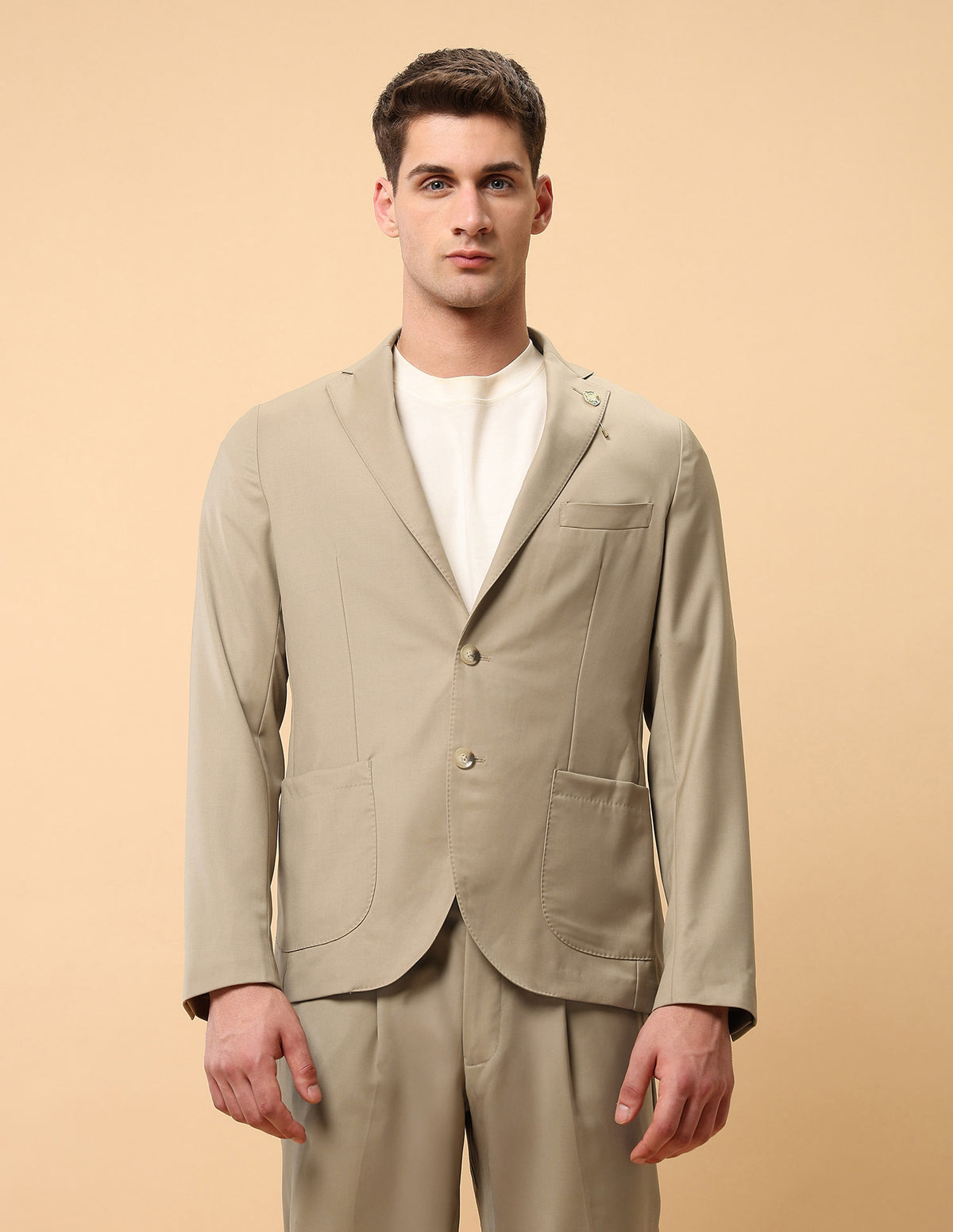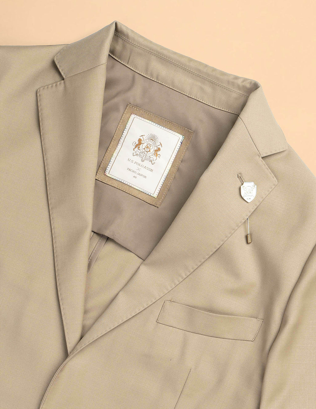 - Notch lapel collar with brand pin