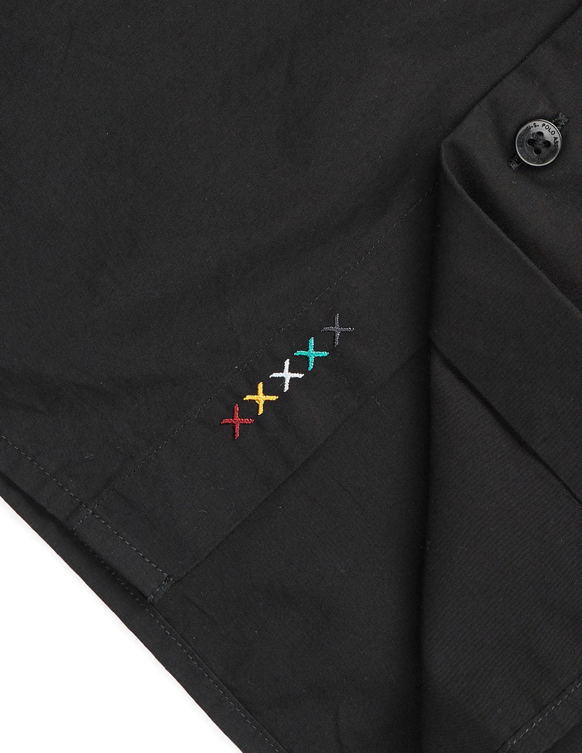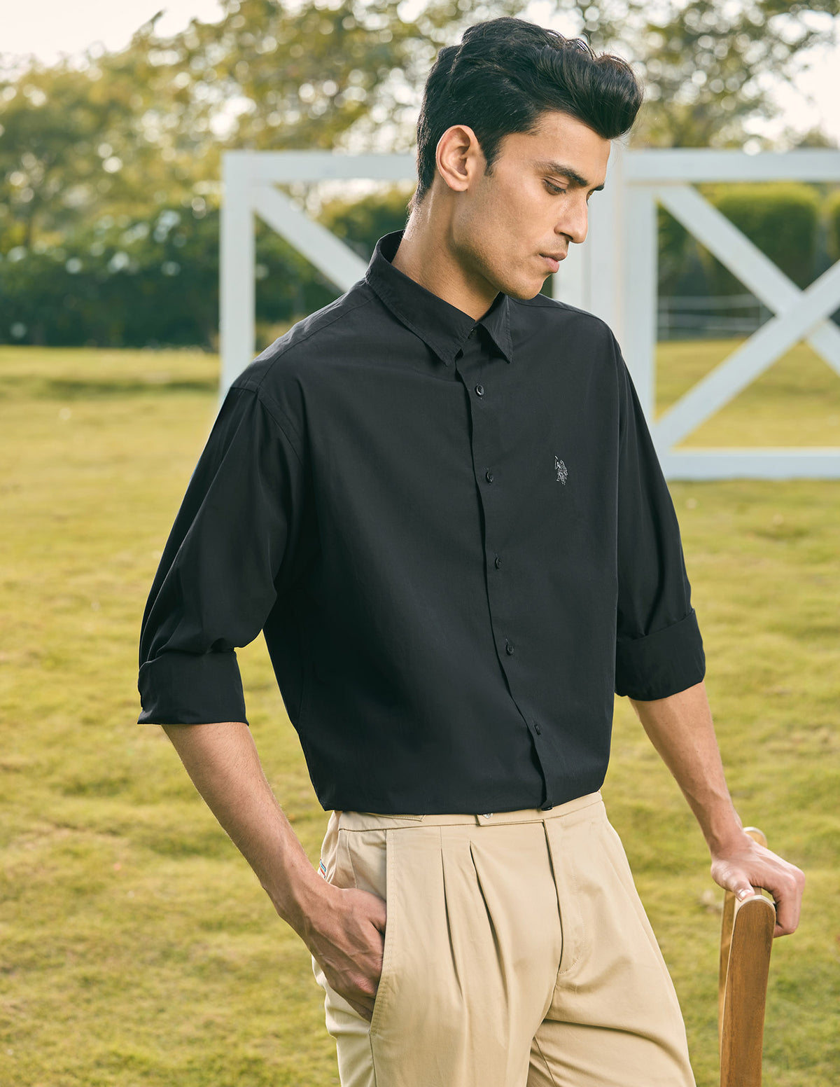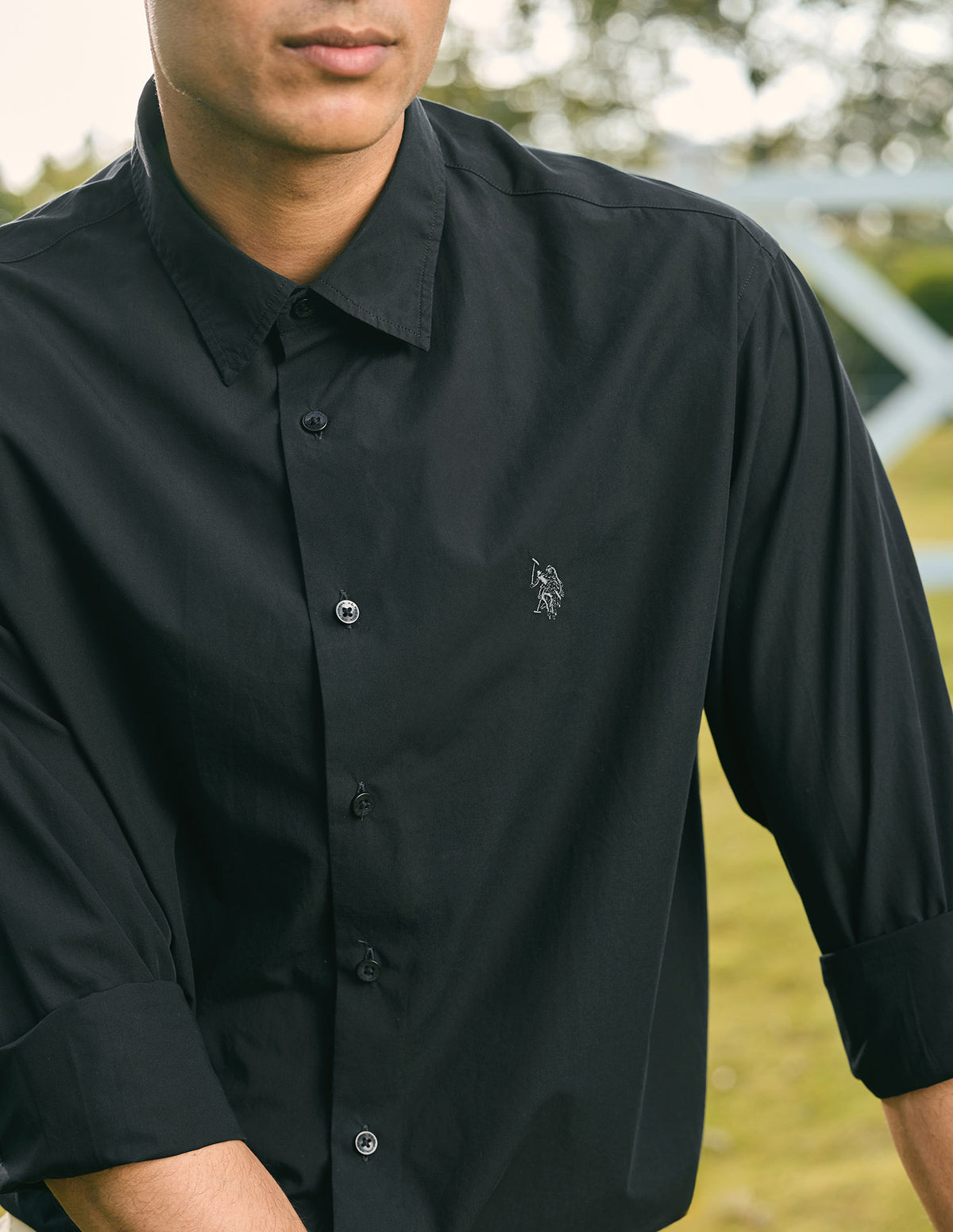 | Spread collar | Embroidered logo at chest | French button placket | Long sleeves with rounded cuffs | Straight vented hemline | Solid pattern | Regular weave | Tailored fit |