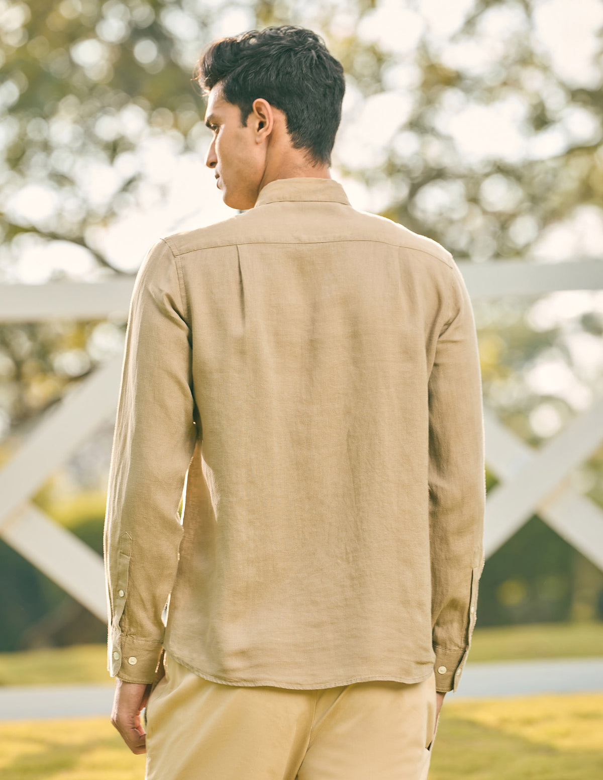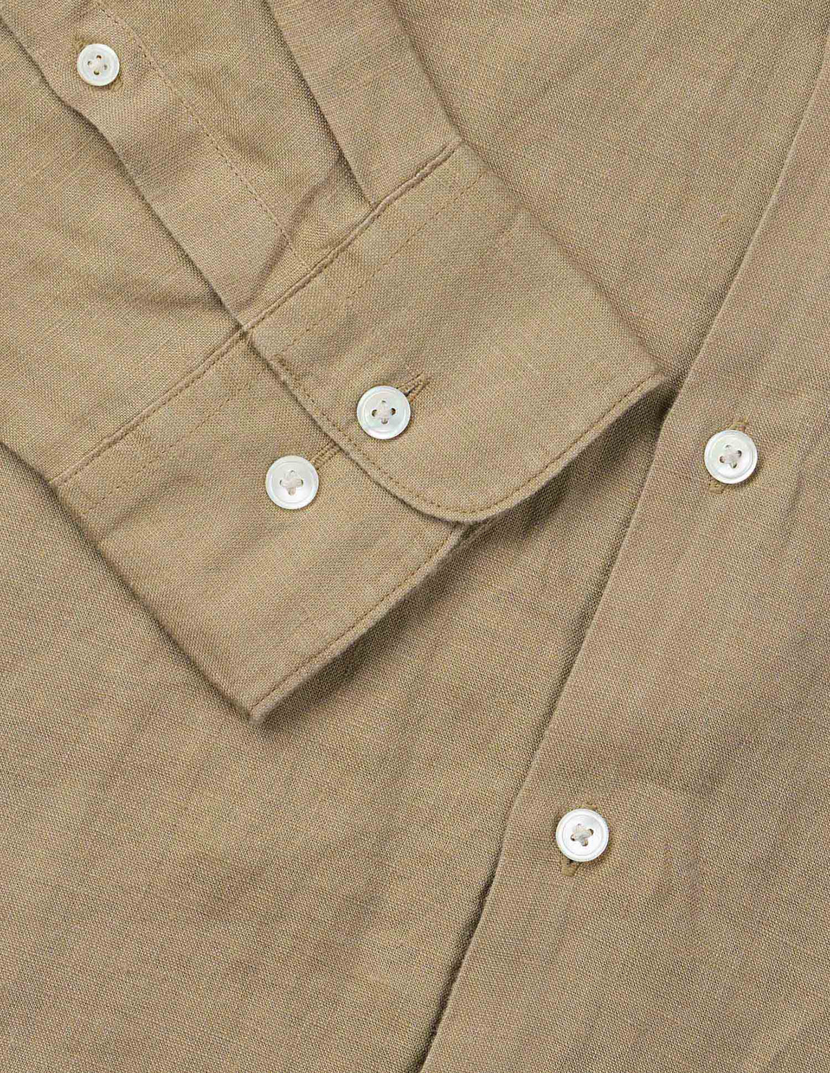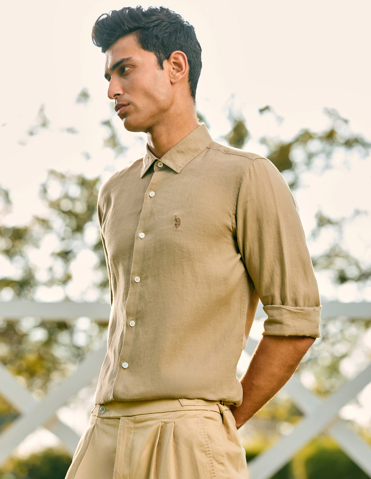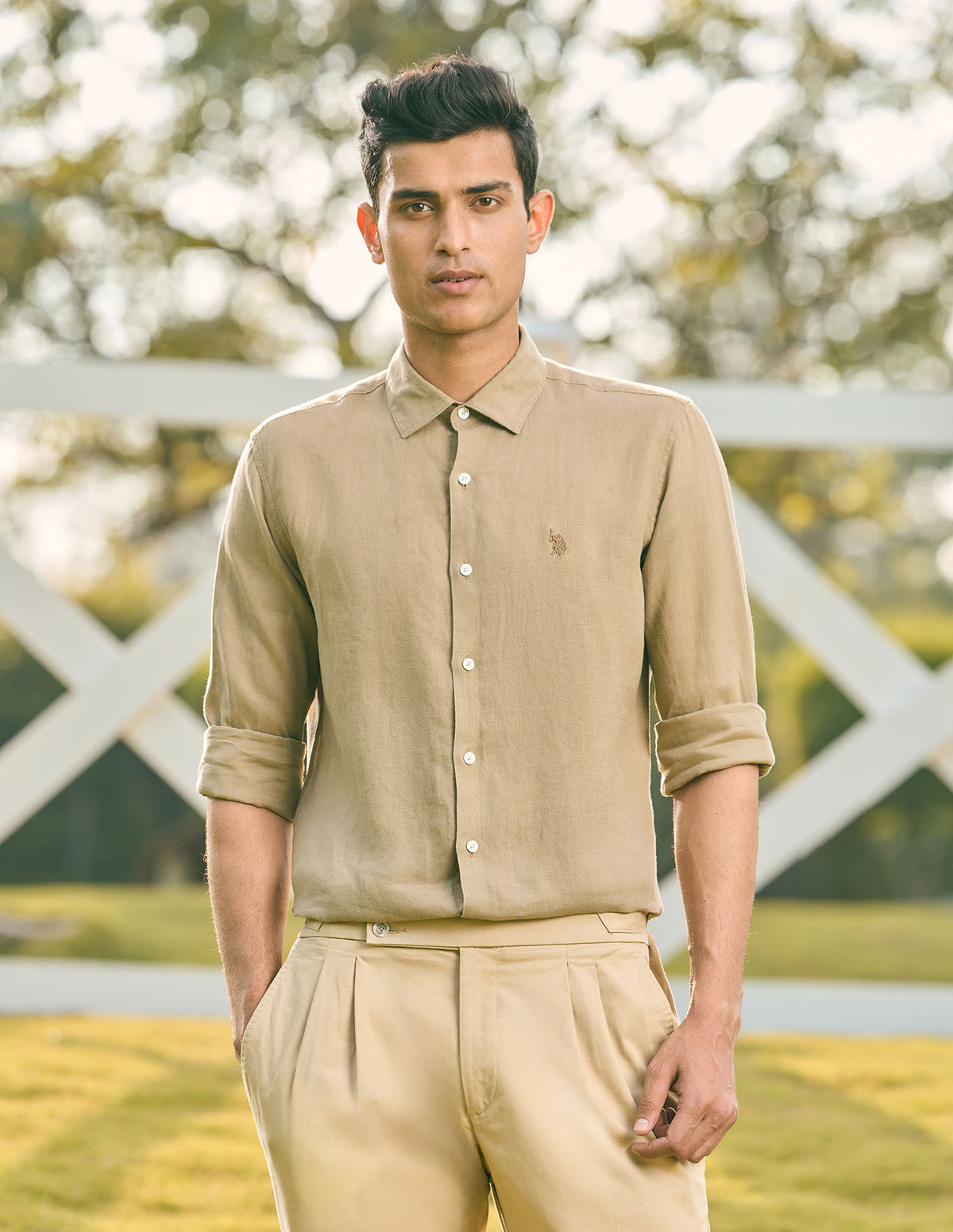| Spread collar | Embroidered logo at chest | French button placket | Long sleeves with rounded cuffs | Curved hemline | Solid pattern | Regular weave | Tailored fit |