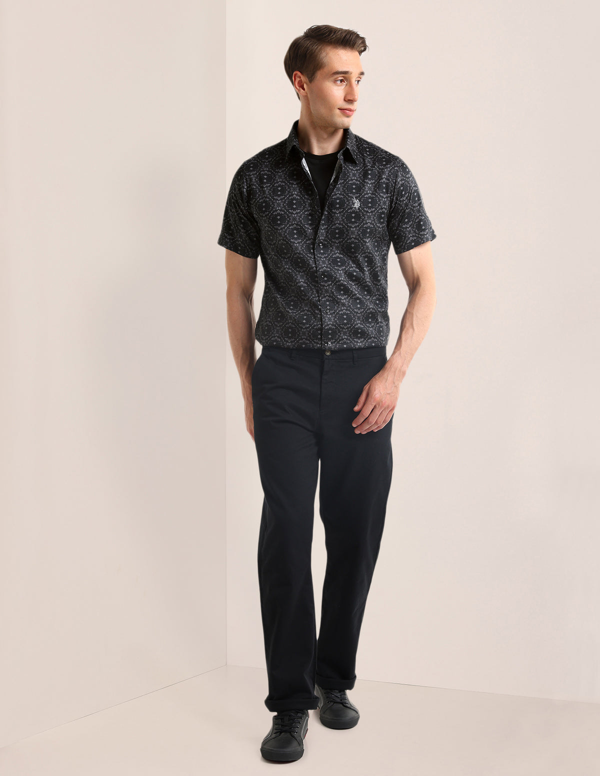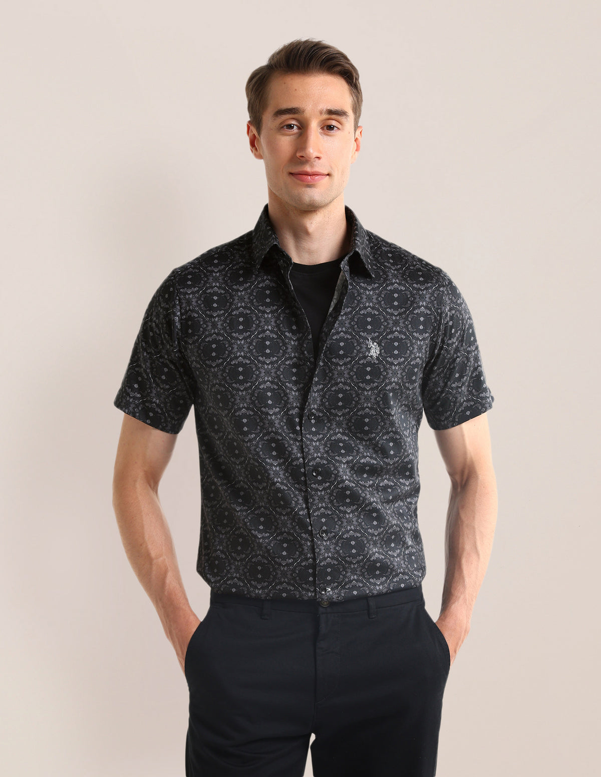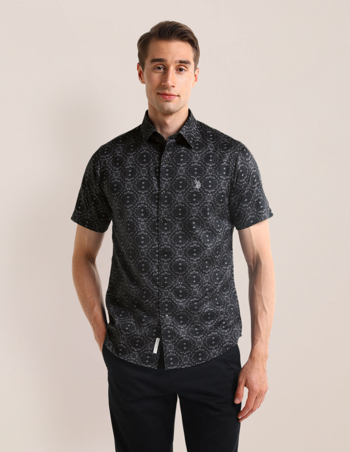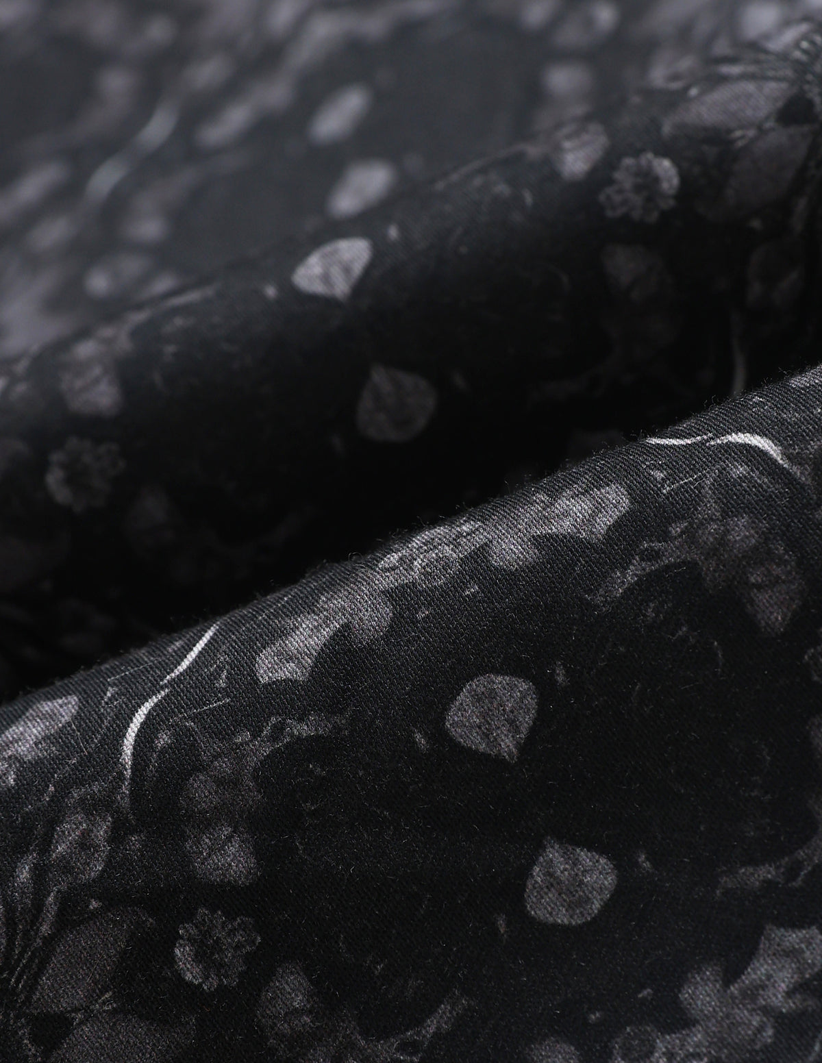 Story: Add a touch of nature to your wardrobe with this striking black floral satin shirt featuring a modern digital print, spread neckline, blending masculinity and boldness for a unique, comfortable style.