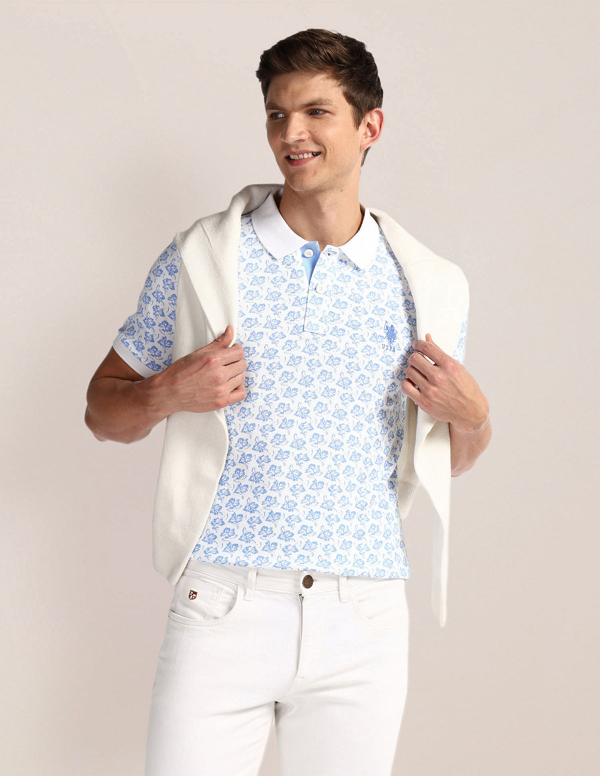 | Polo collar | Logo at chest | Short button placket | Short sleeves | Ribbed collar and sleeve hems | Vented hemline | Floral printed pattern | Knitted | Slim fit