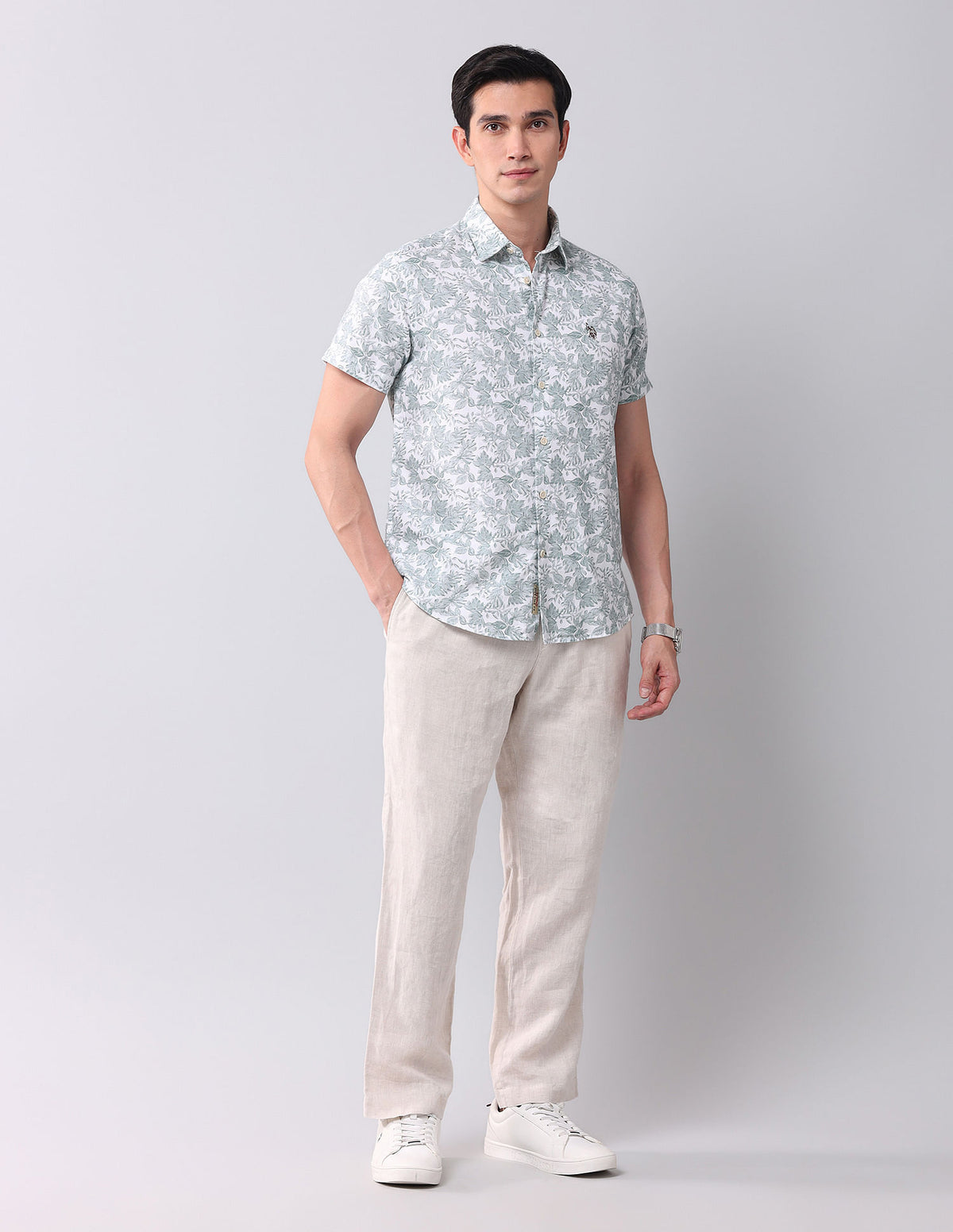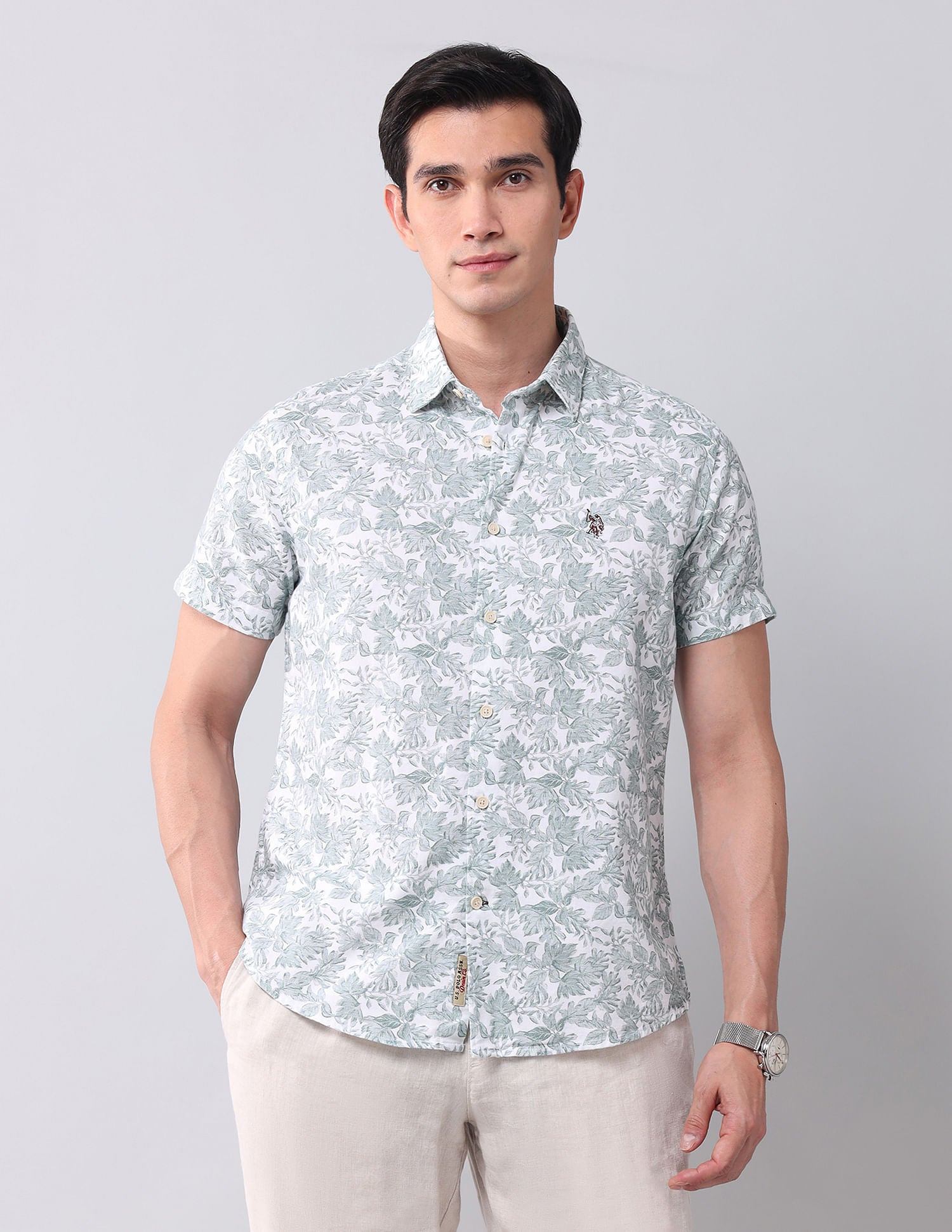 | Spread collar | Logo at chest | Full button placket | Long sleeves with rounded cuffs | Curved hemline | Floral printed pattern | Dobby weave | Regular fit |