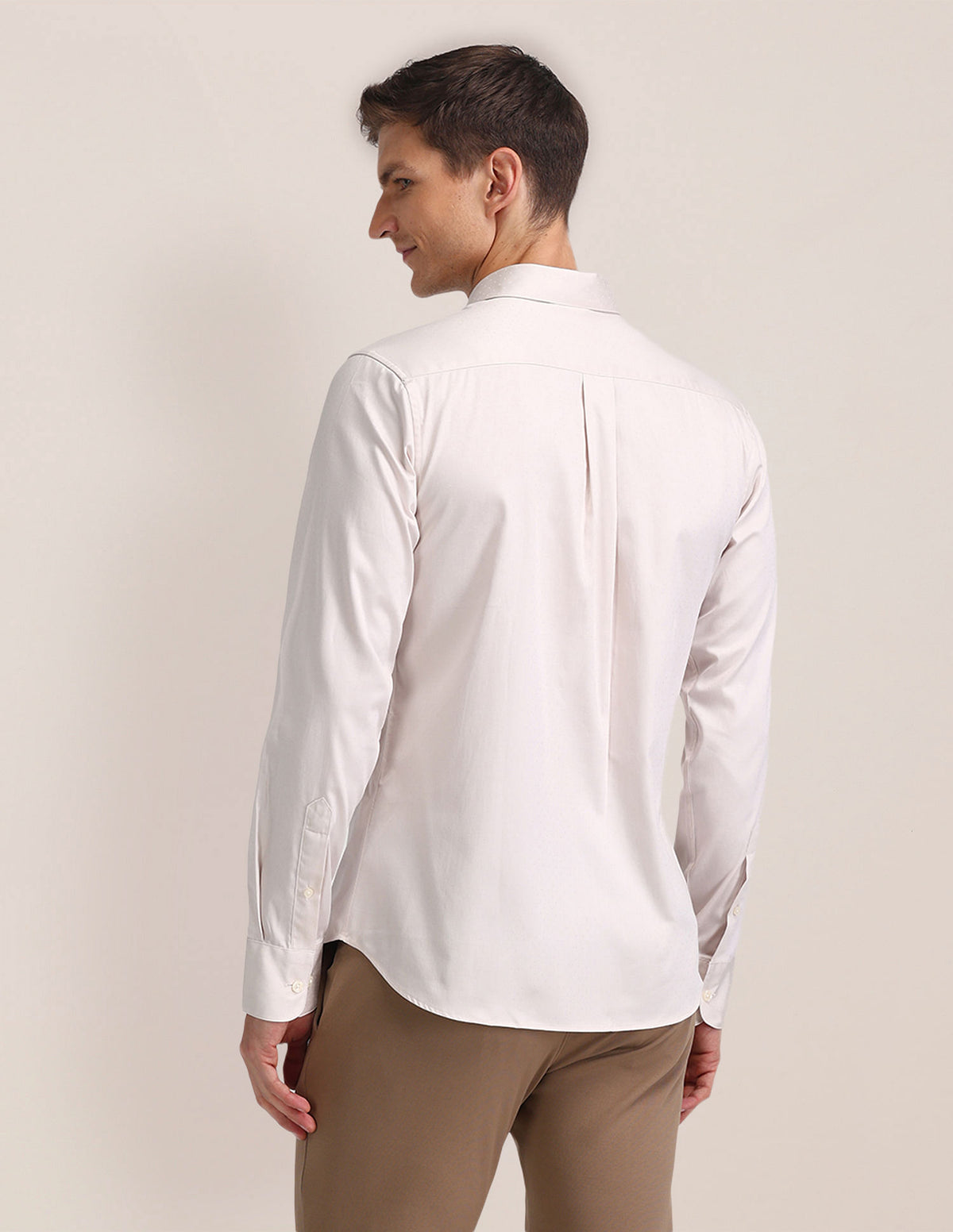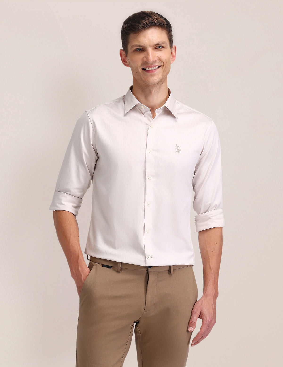 | Semi-cutaway collar | Logo at chest | French button placket | Long sleeves with rounded cuffs | Curved hemline | Solid pattern | Satin weave | Regular fit