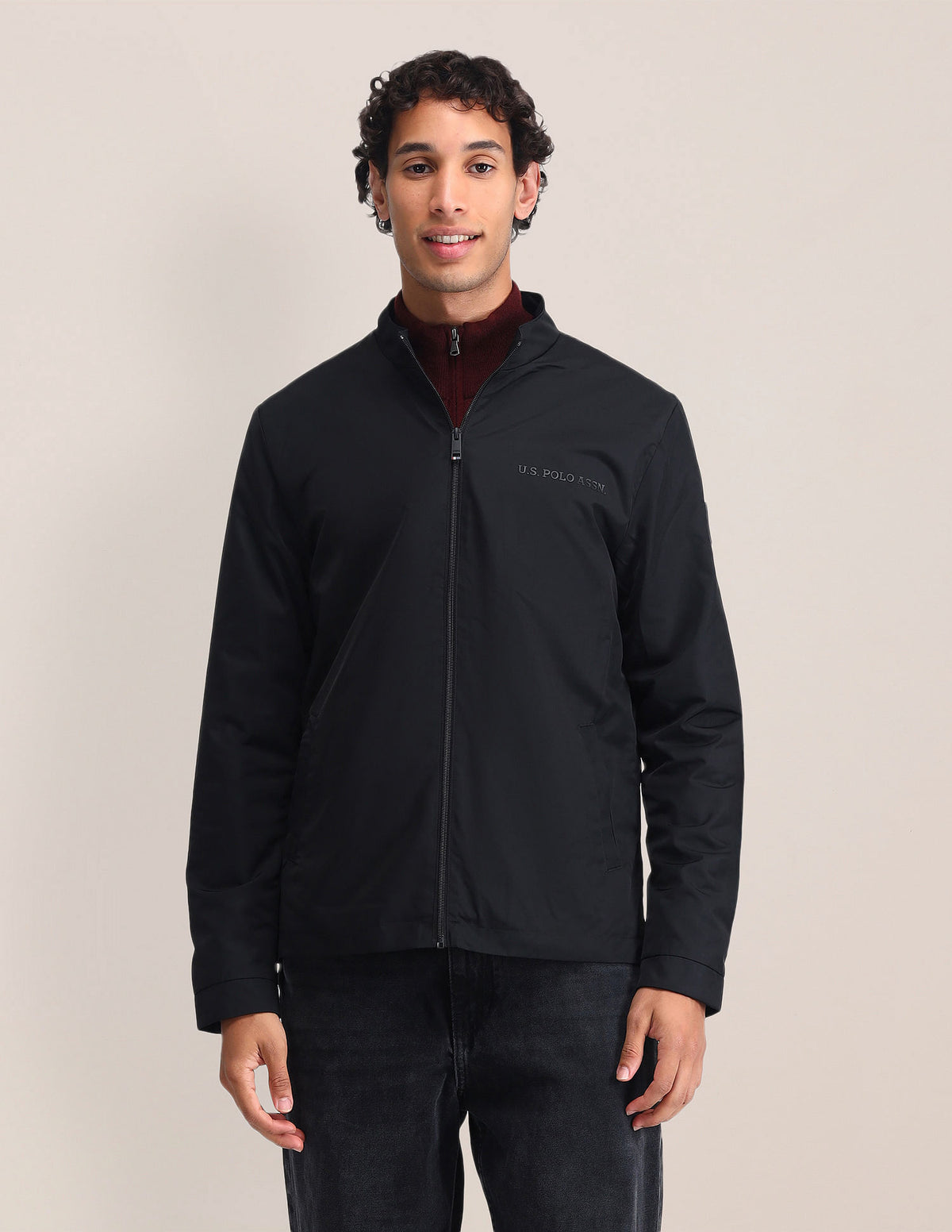 | Stand neck | Full zipper closure | Long sleeves | Logo at left sleeve | Elasticized sleeve hems and hemline | Two pockets | Solid pattern | Regular fit | Country Of Origin - India