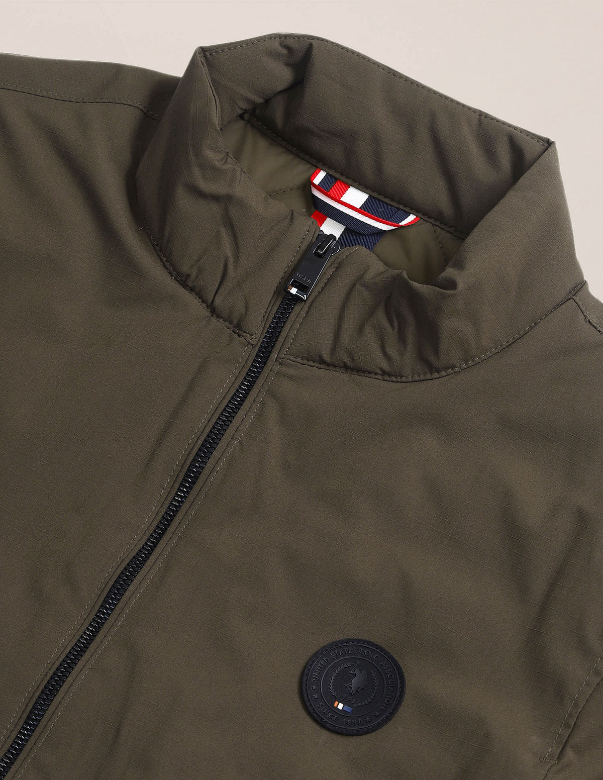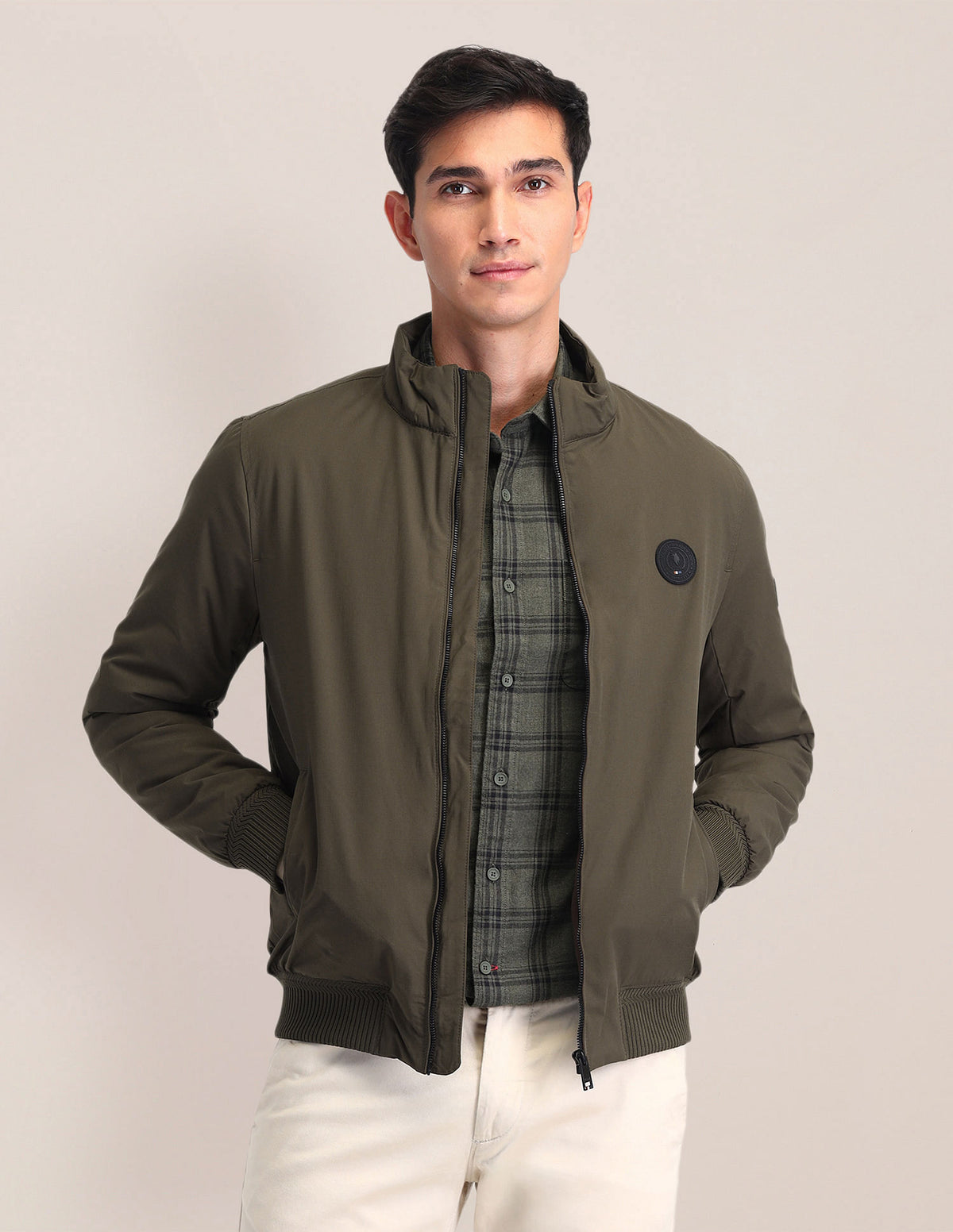 | Stand collar | Full zip placket | Two pockets | Long sleeves | Solid pattern | Regular fit |