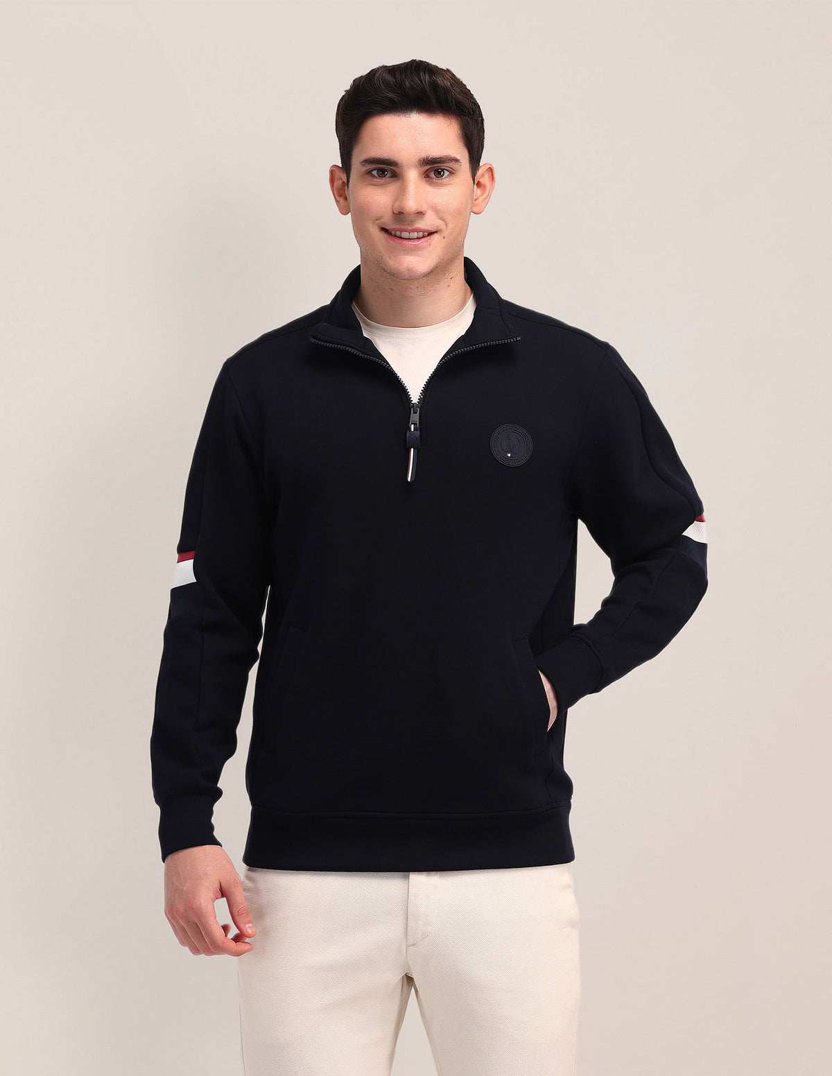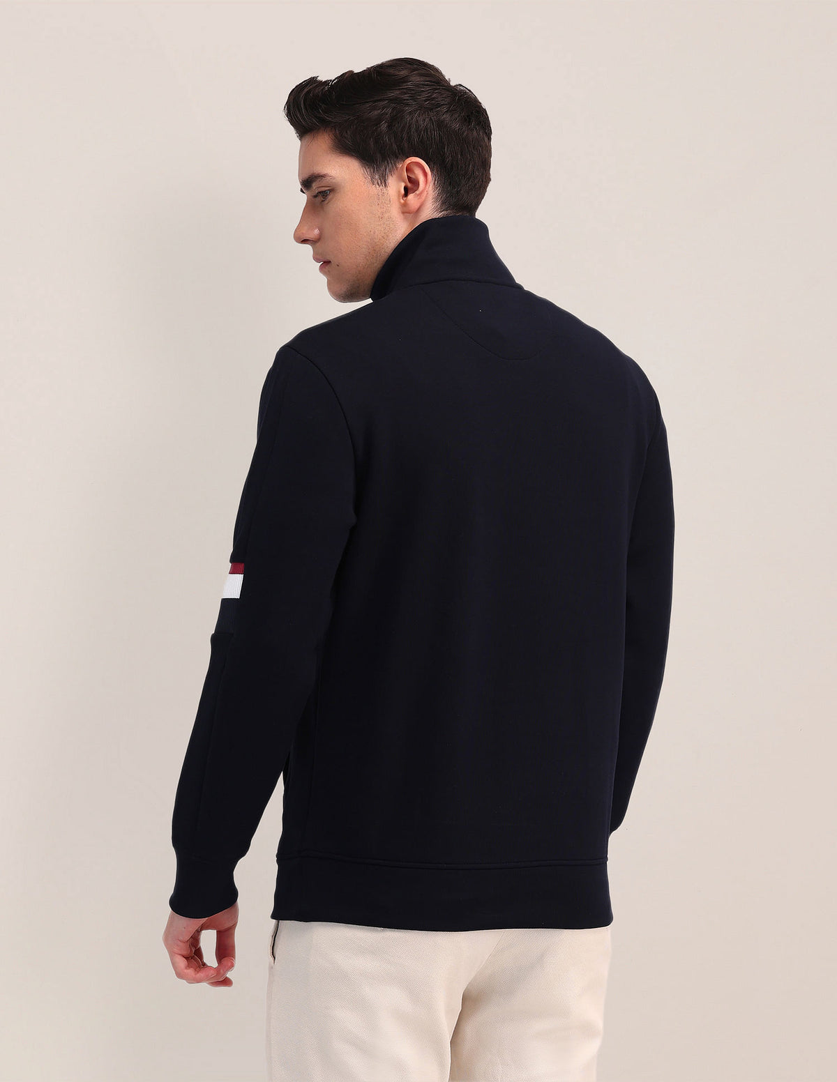 | Stand neck | Zip closure | Long sleeves | Ribbed sleeve hems and hemline | Two pocket | Solid pattern | Knitted | Regular fit | Country Of Origin - Bangladesh