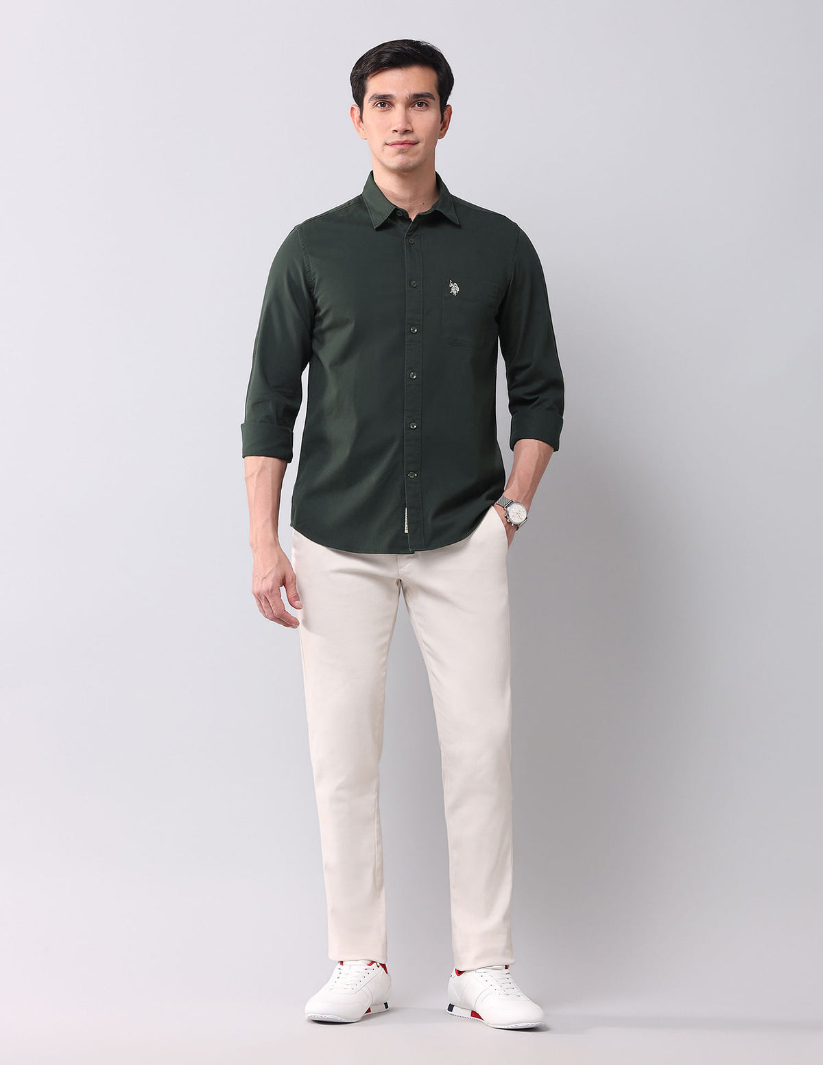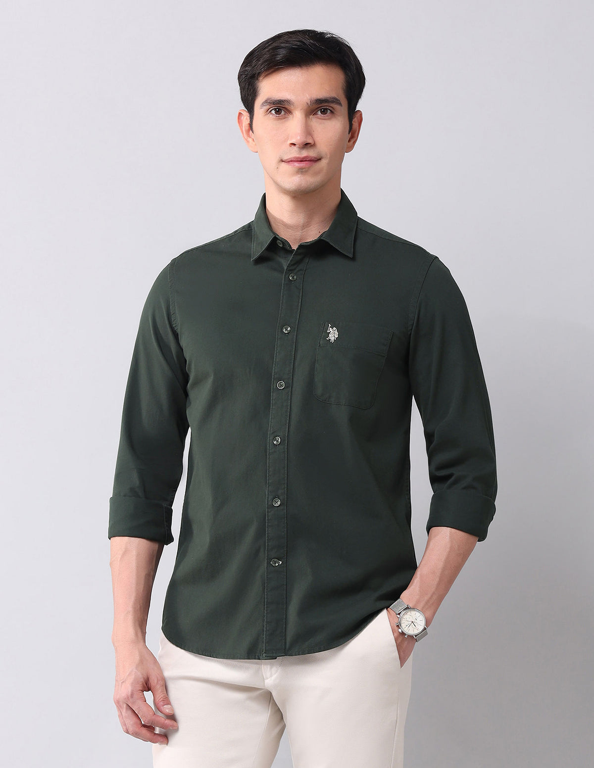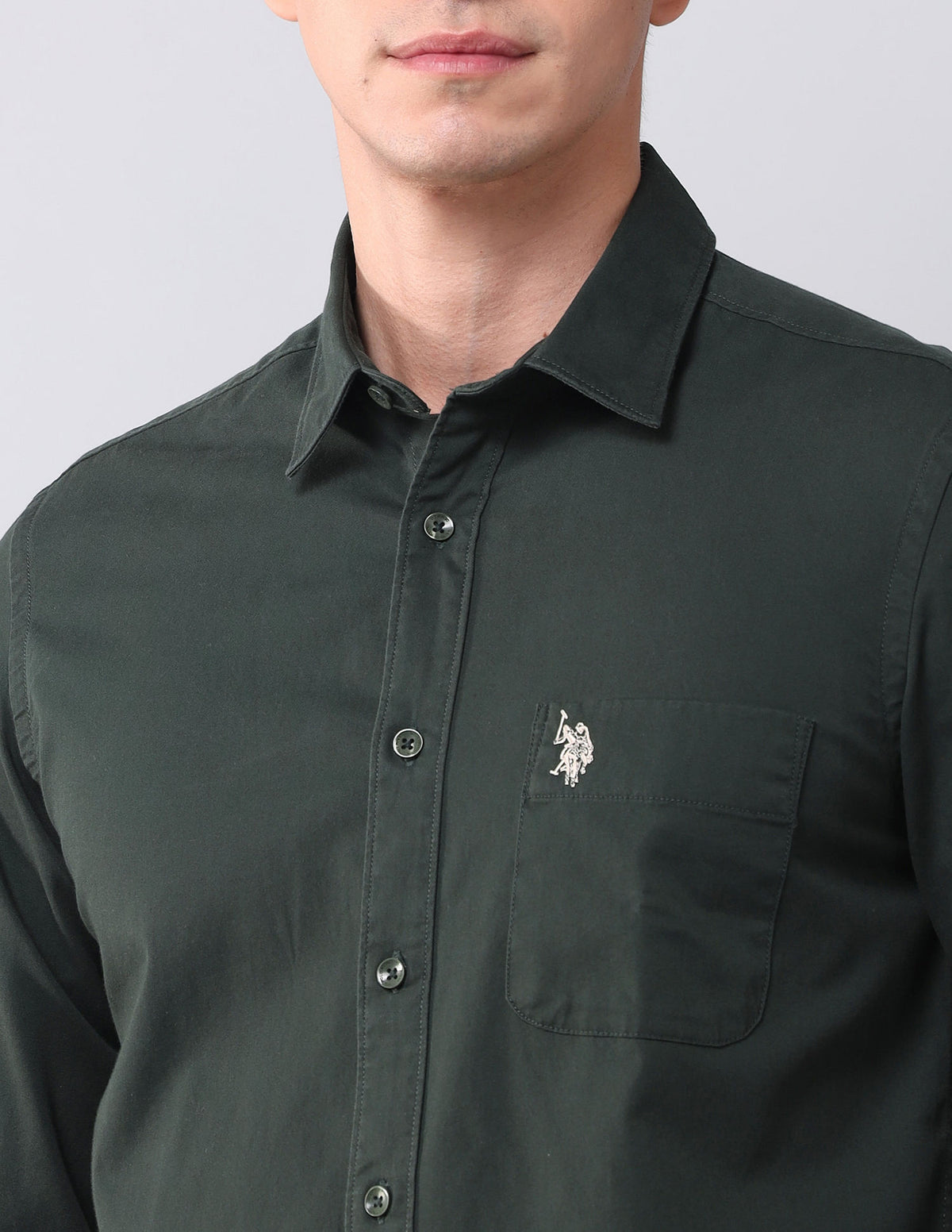 | Spread collar | Logo at chest | Full button placket | Long sleeves with rounded cuffs | Curved hemline | Solid pattern | Twill weave | Regular fit |