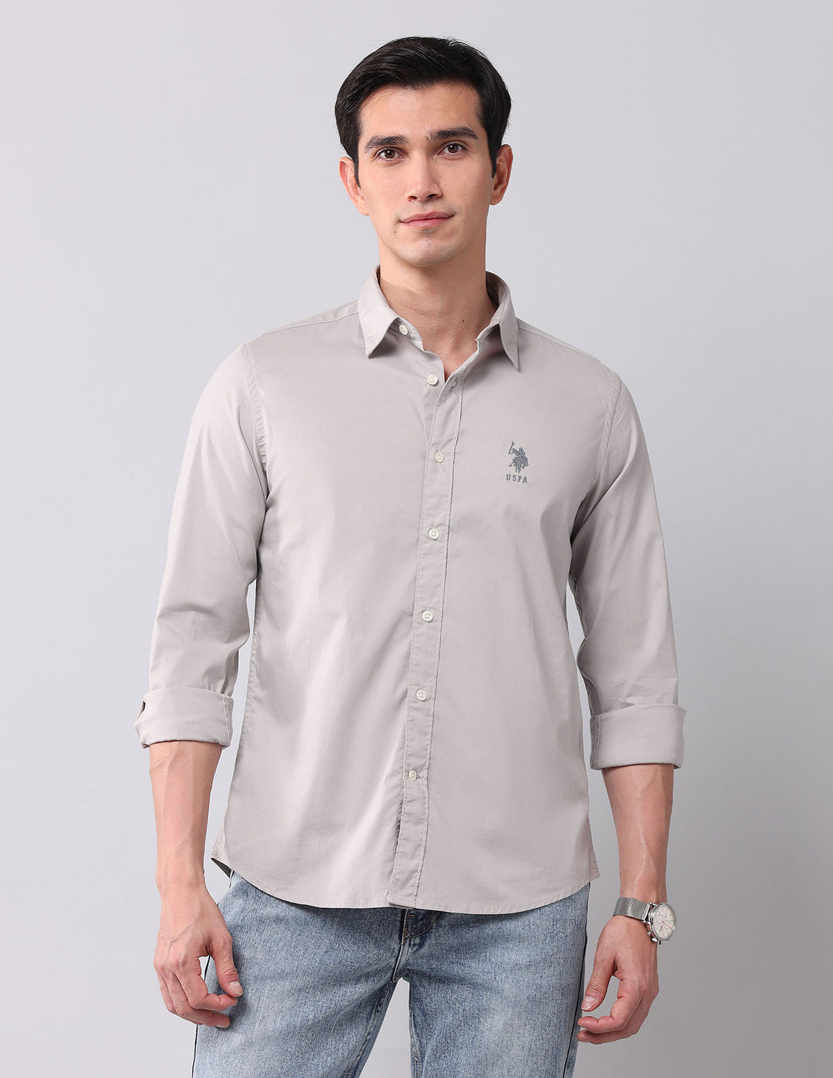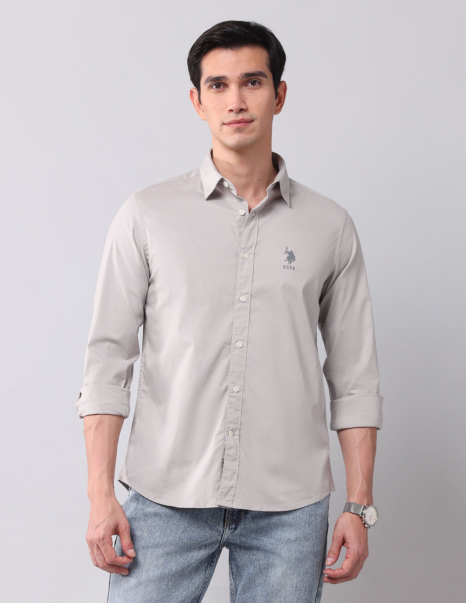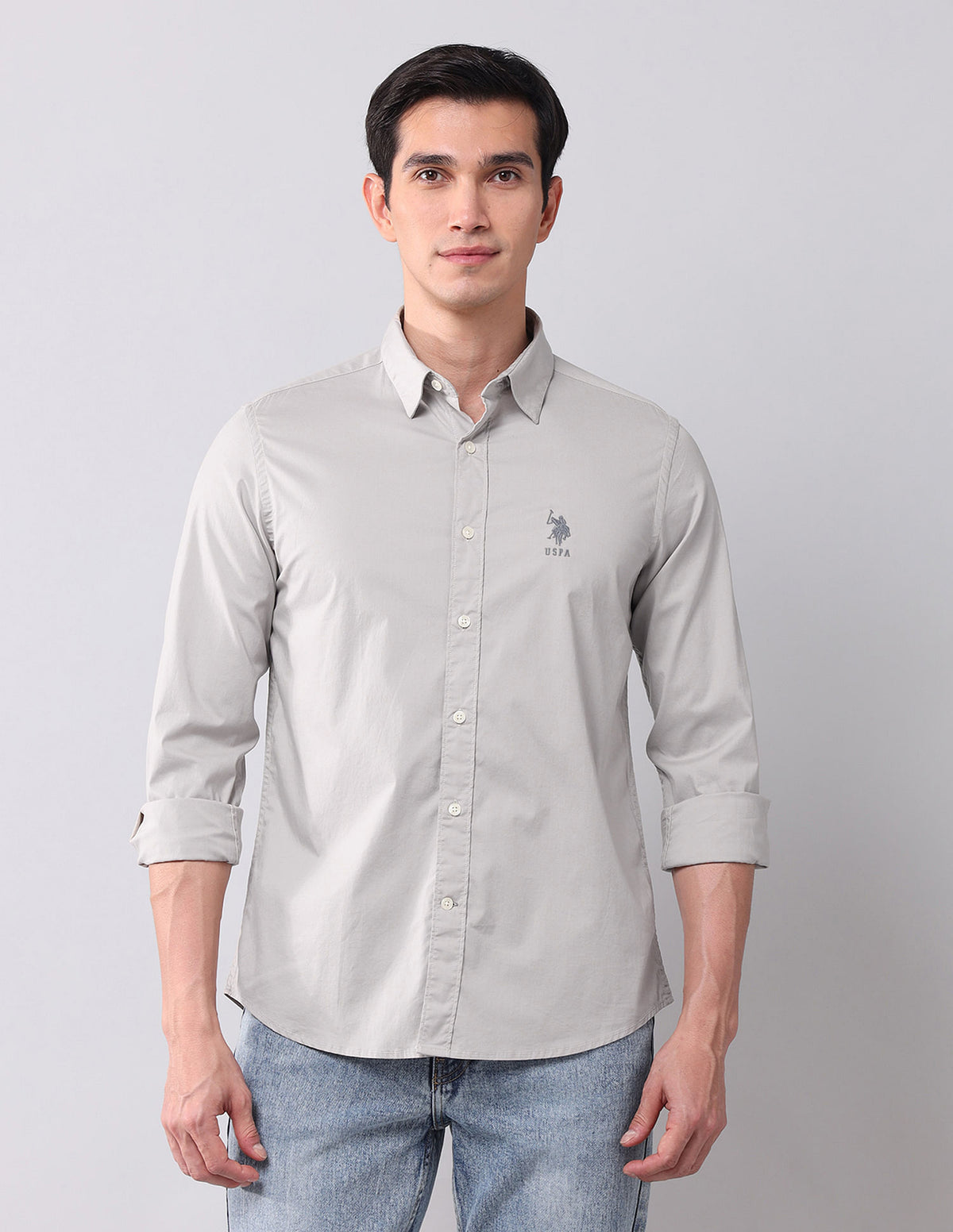| Spread collar | Logo at chest | Full button placket | Long sleeves with rounded cuffs | Curved hemline | Solid pattern | Twill weave | Regular fit |