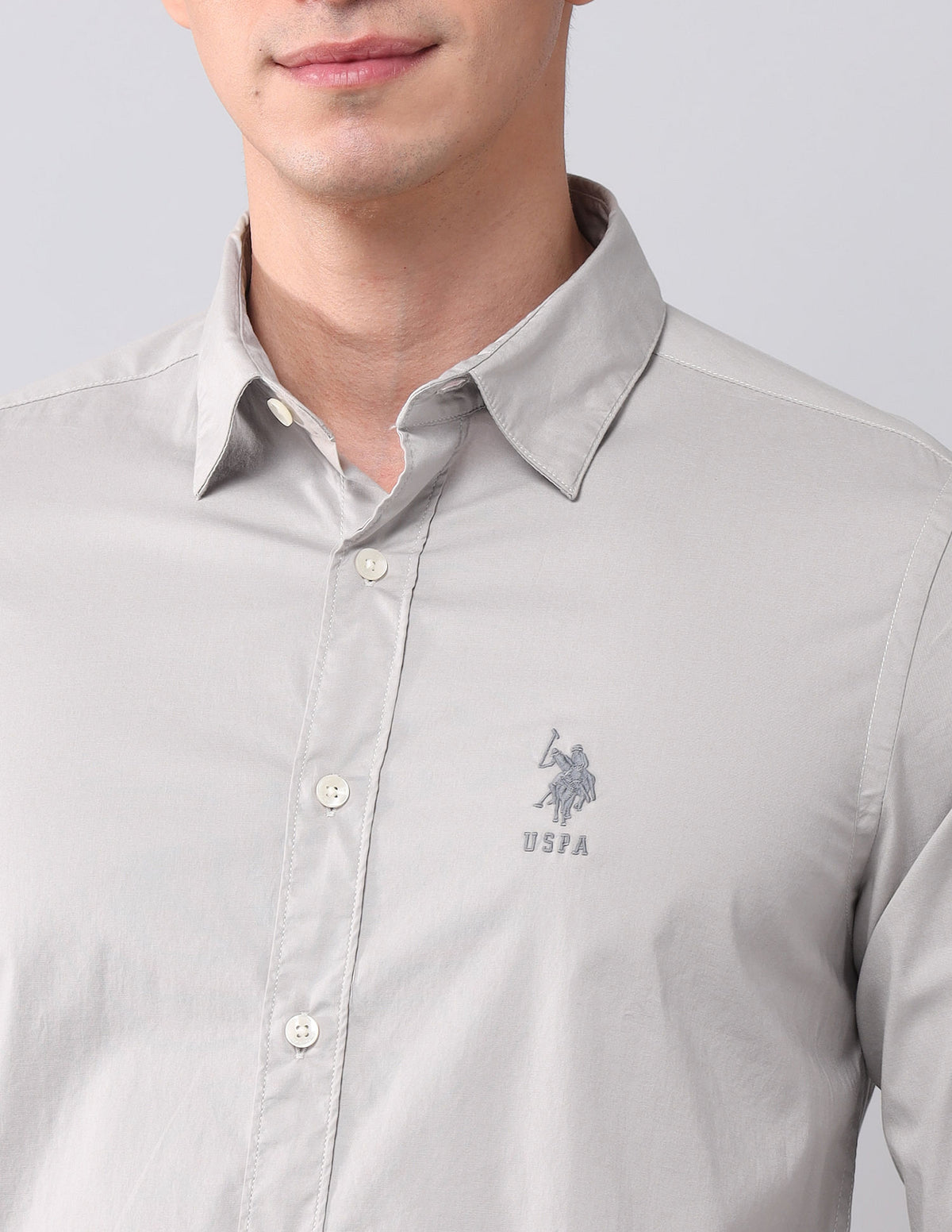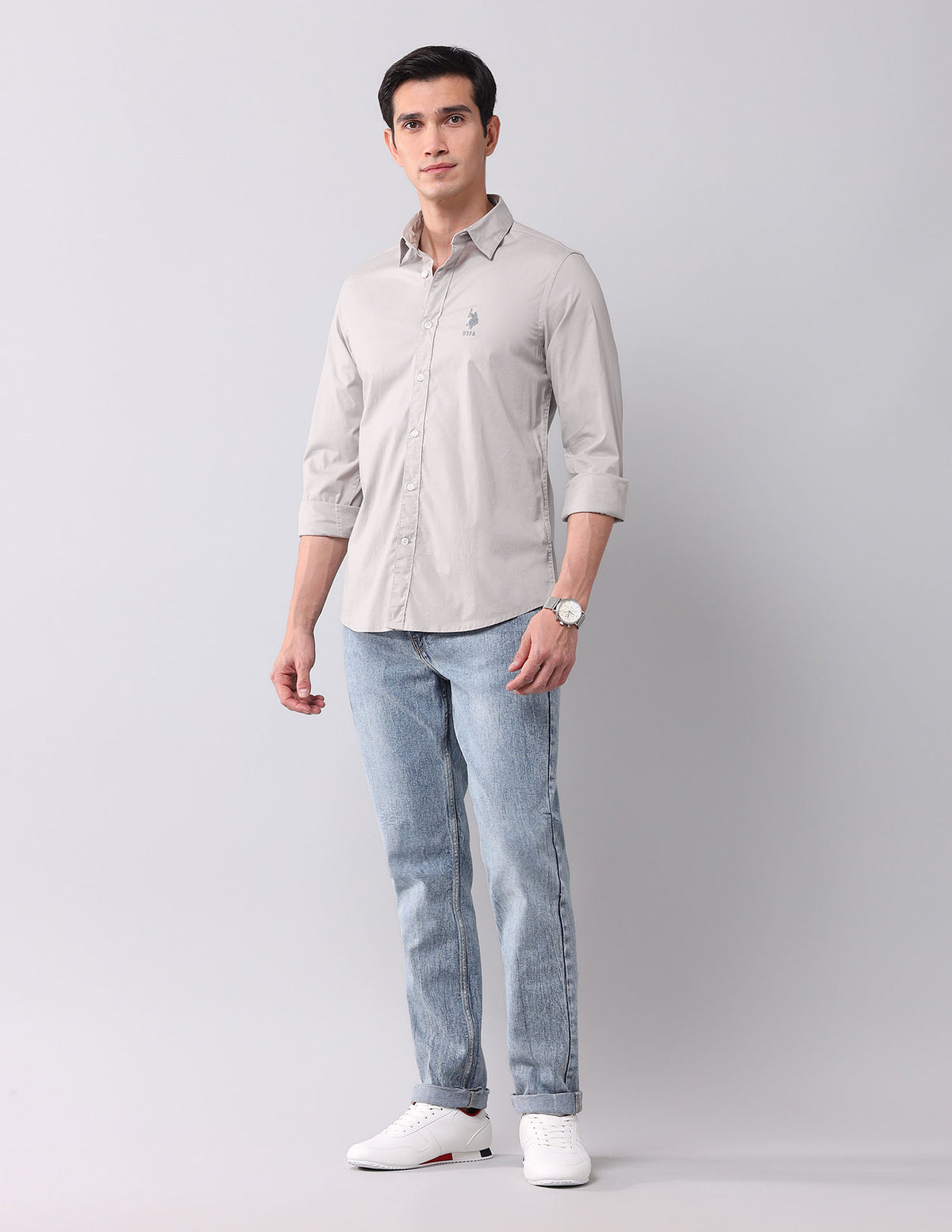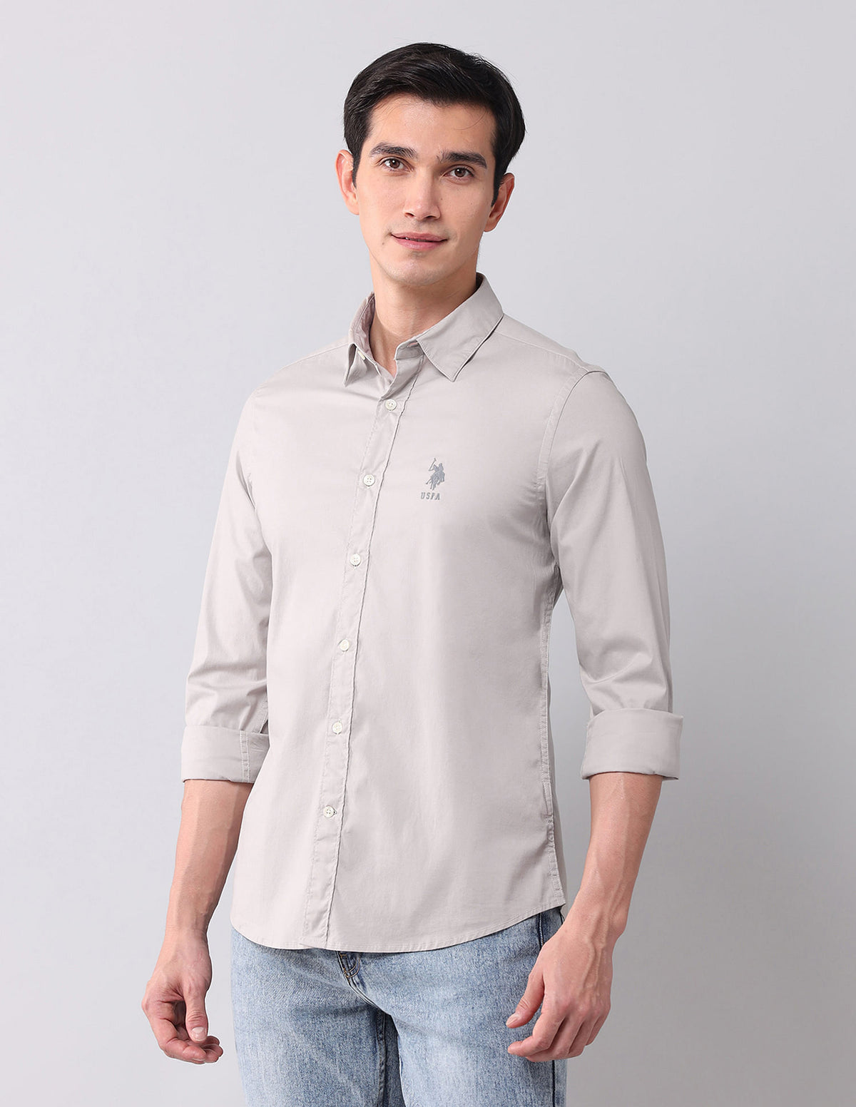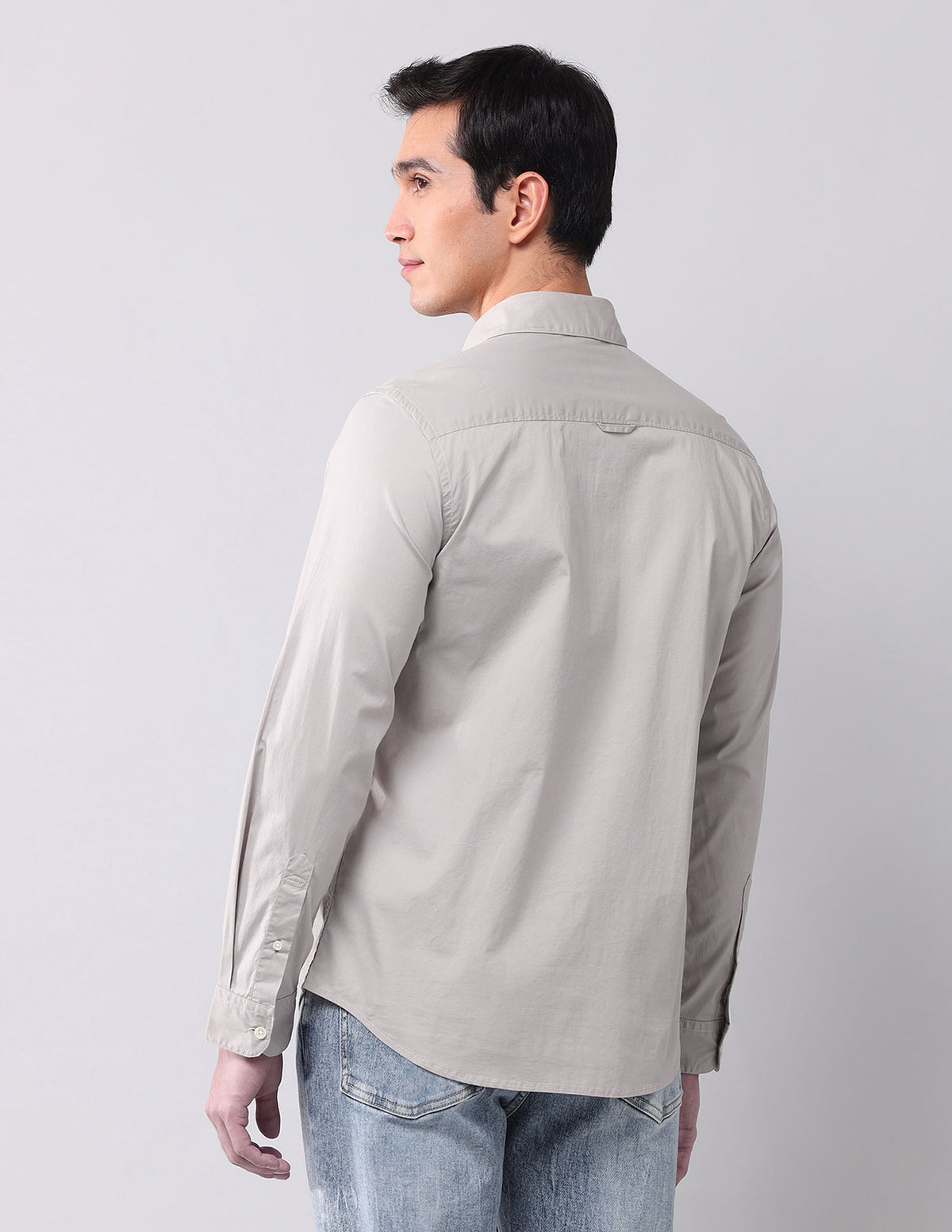 | Spread collar | Logo at chest | Full button placket | Long sleeves with rounded cuffs | Curved hemline | Solid pattern | Twill weave | Regular fit |