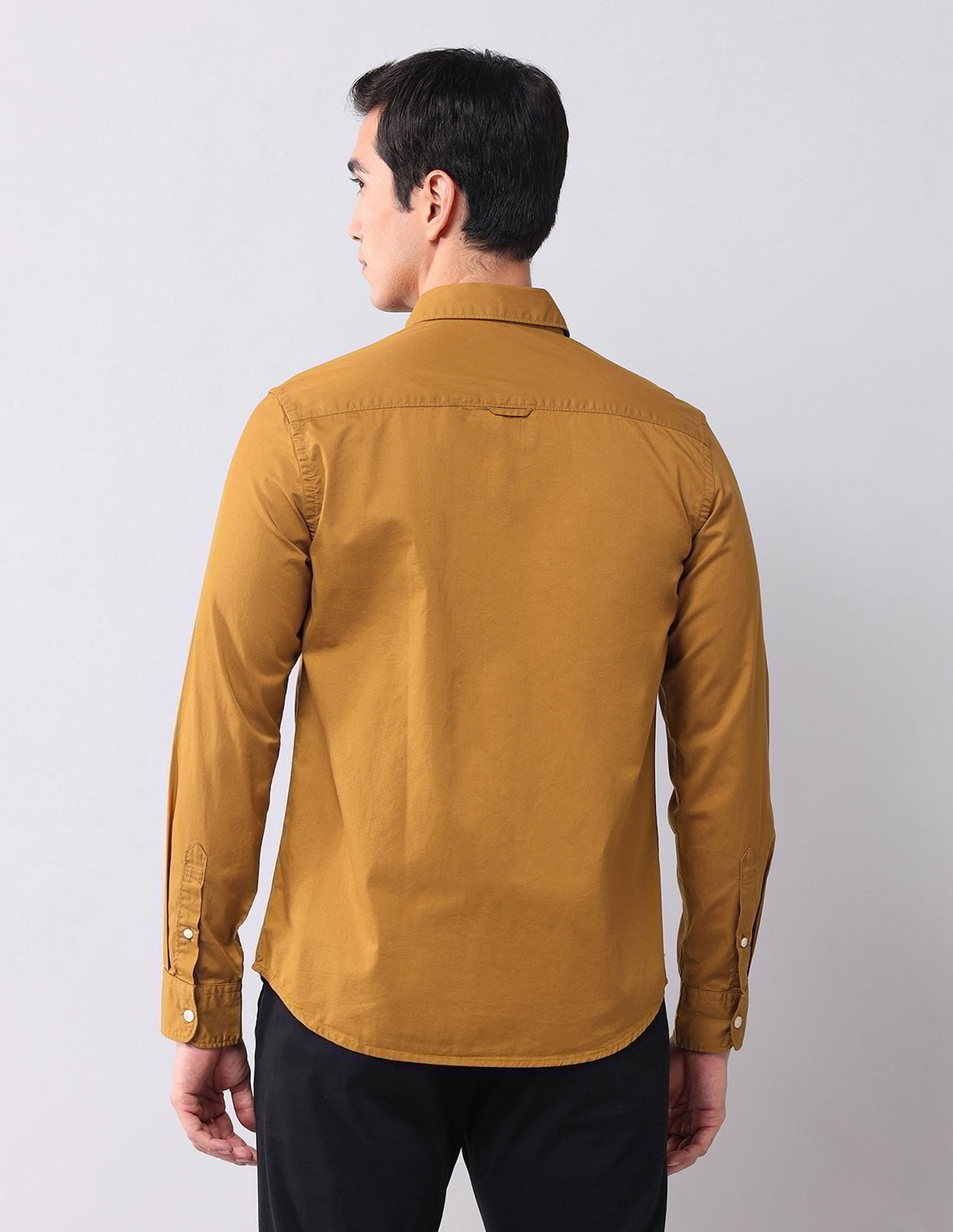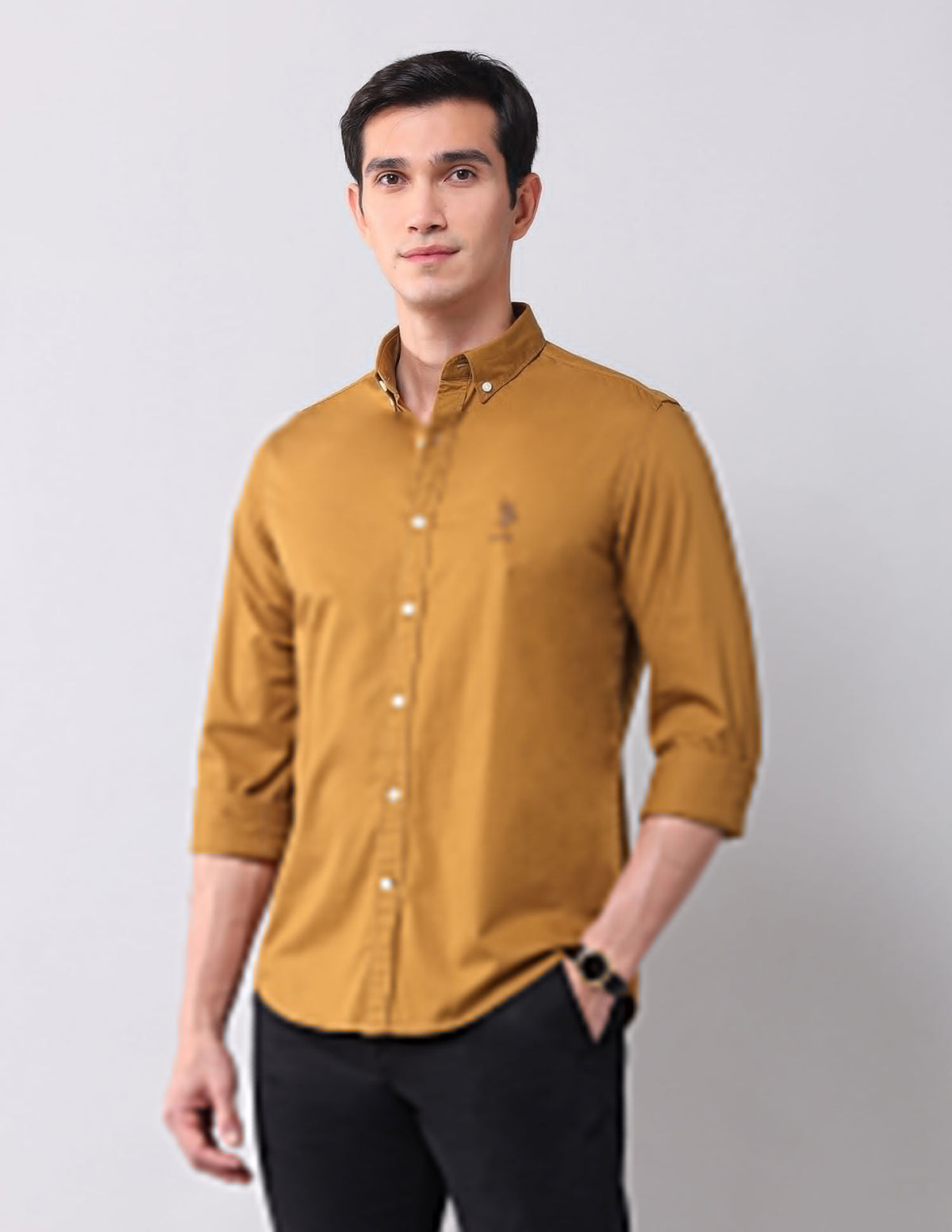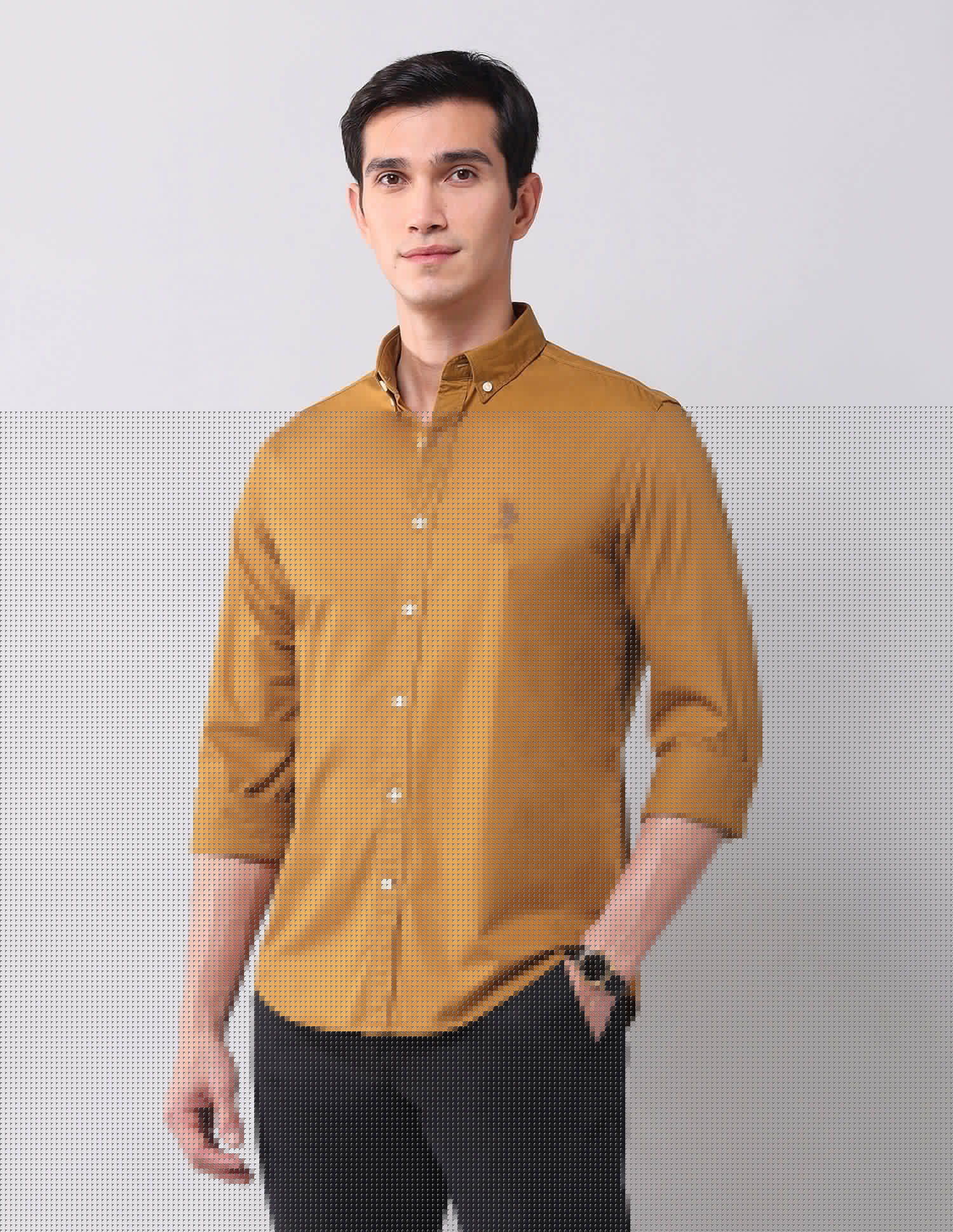 | Spread collar | Logo at chest | Full button placket | Long sleeves with rounded cuffs | Curved hemline | Solid pattern | Twill weave | Regular fit |