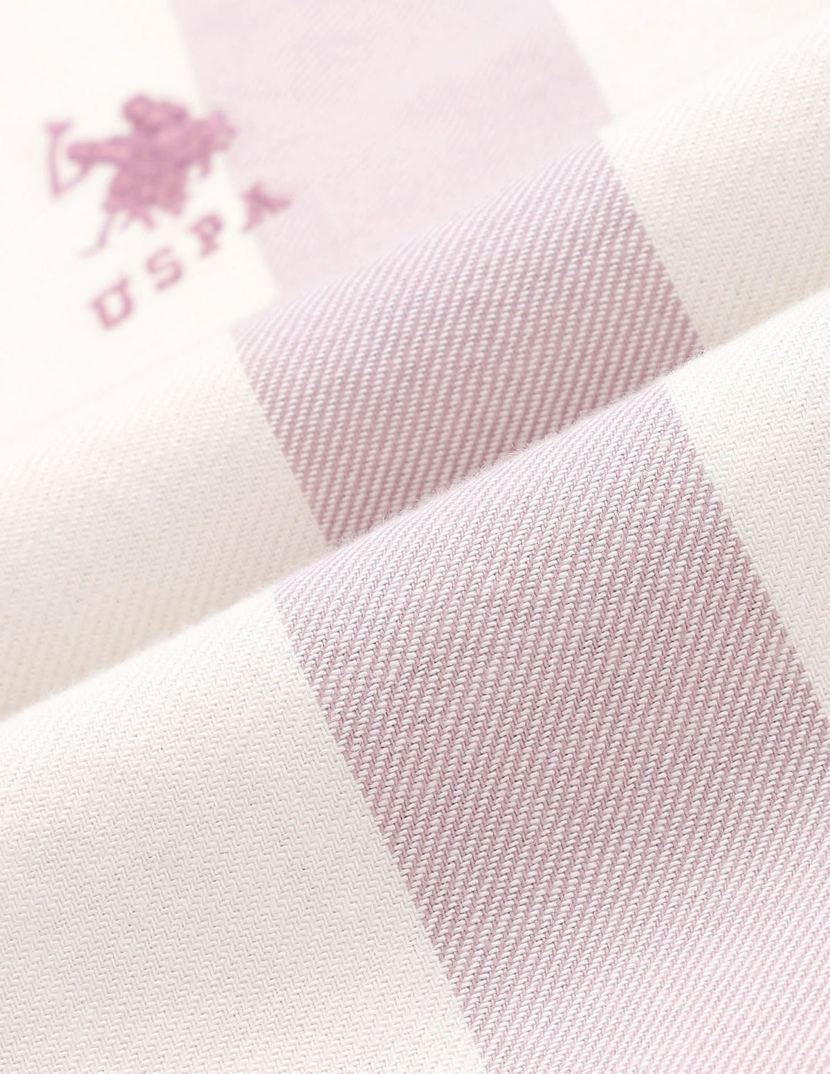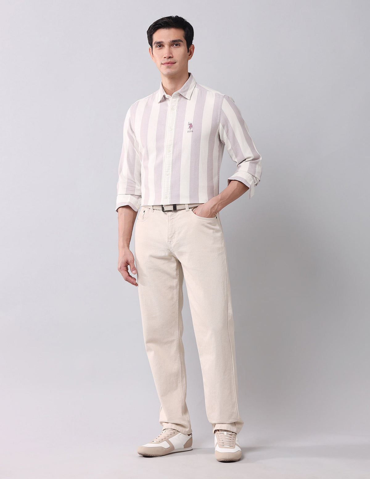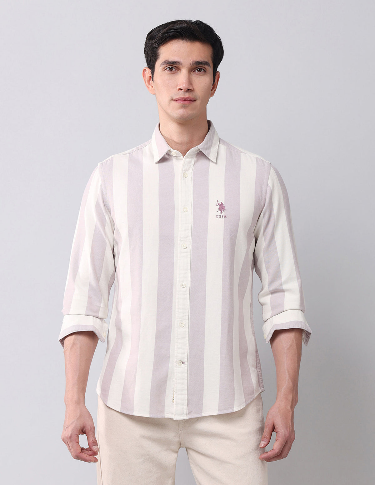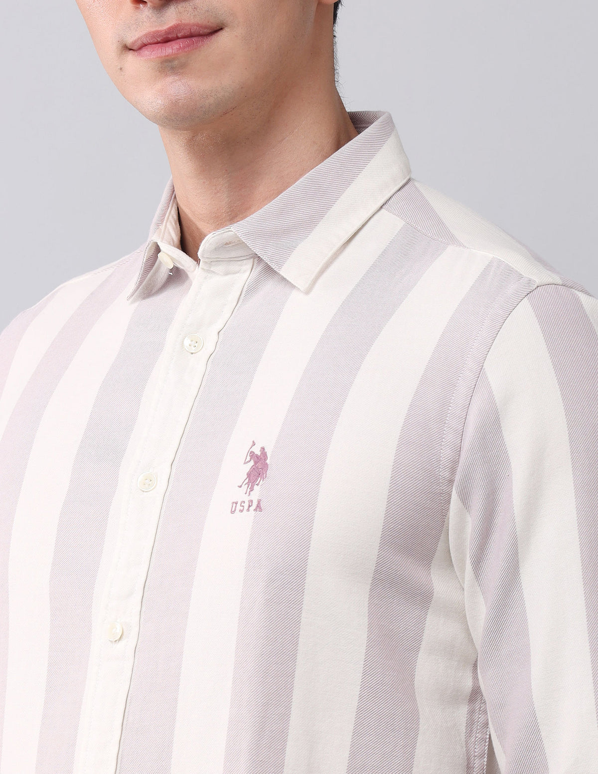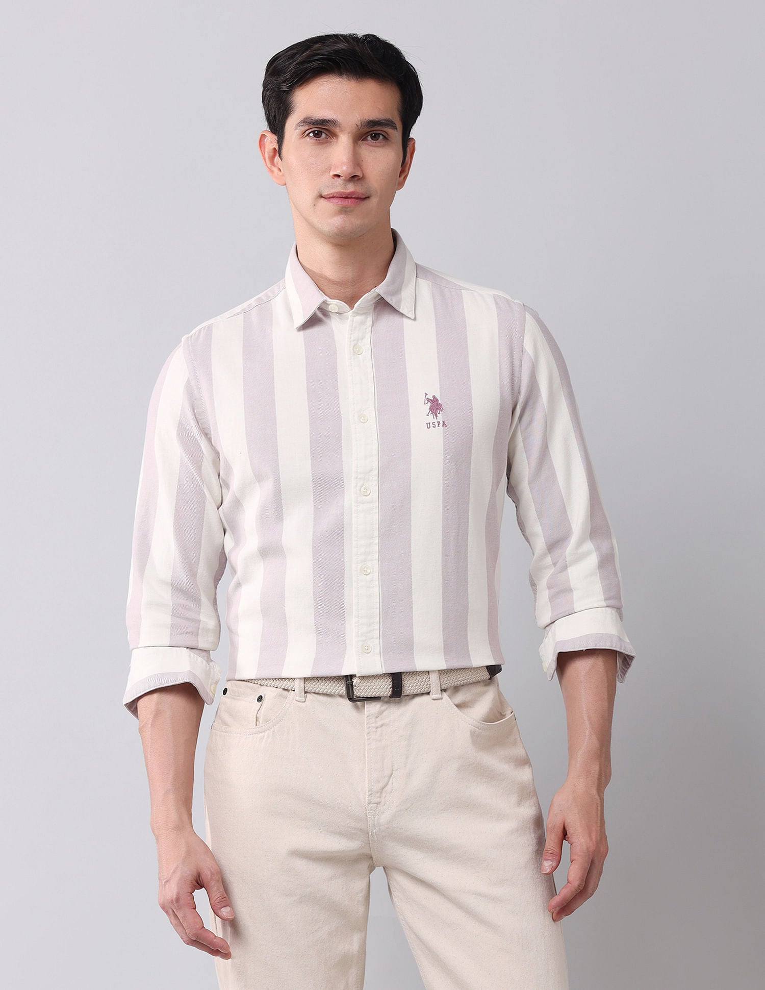 | Spread collar | Logo at chest | Full button placket | Long sleeves with rounded cuffs | Curved hemline | Vertical striped pattern | Twill weave | Regular fit |