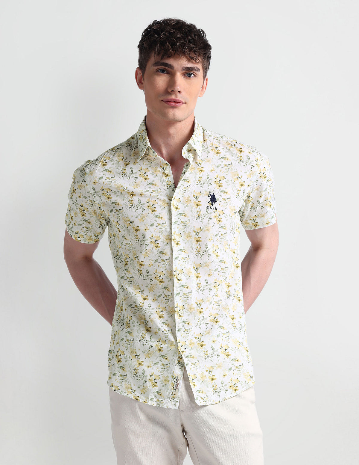 | Semi-cutaway collar | Logo at chest | Full button placket | Short sleeves | Curved hemline | Floral printed pattern | Regular weave | Slim fit
