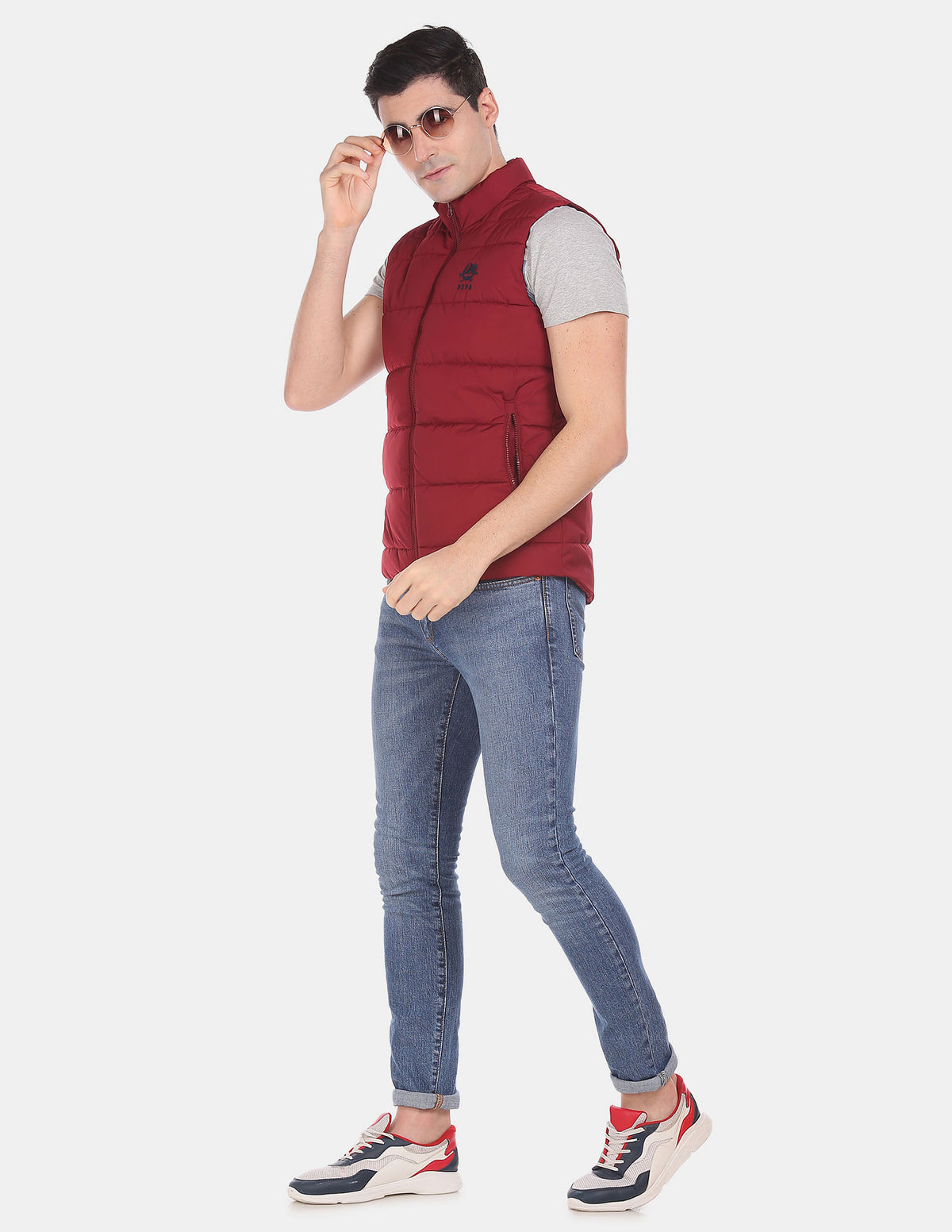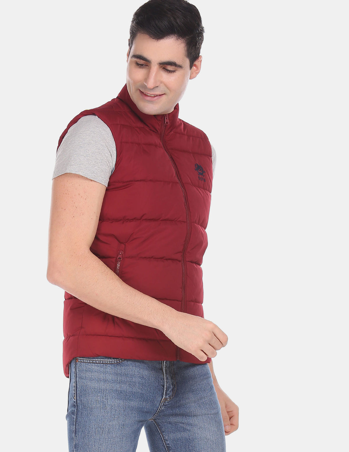 | Stand collar | Full zip-up front | Sleeveless | Embroidered branding on chest | Two zipper pockets at waist | Quilted | Fully lined | | The model is 6ft2in tall and is wearing a size M