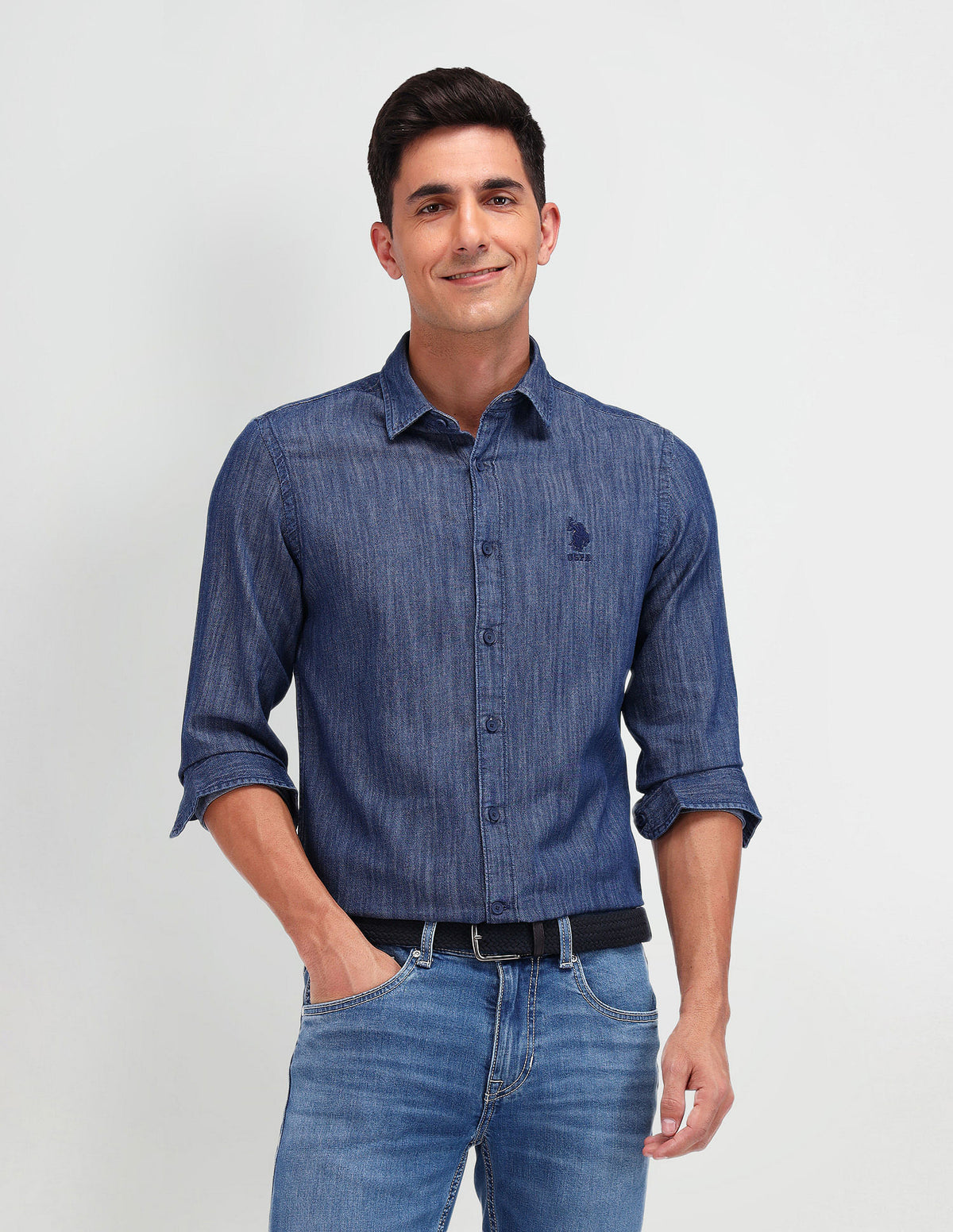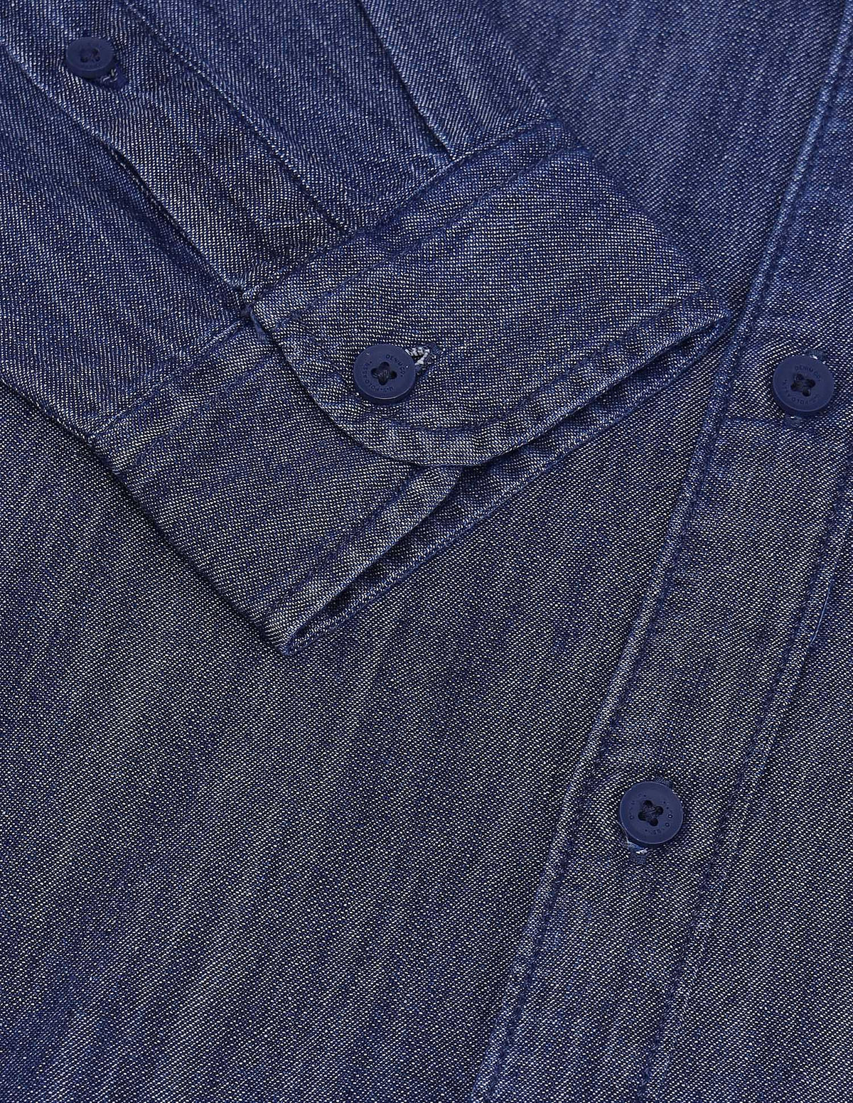 | Spread collar | Embroidered logo at chest | Full button placket | Long sleeves with rounded cuffs | Curved hemline | Heathered pattern | Chambray weave | Slim fit |