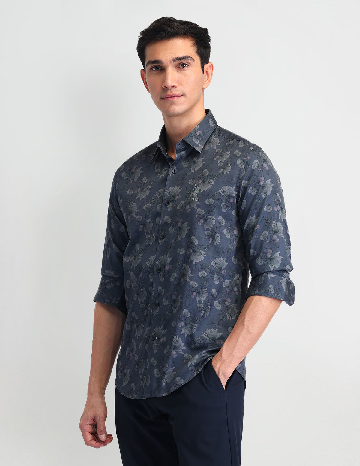 | Semi-cutaway collar | Logo at chest | Full button placket | Long sleeves with rounded cuffs | Curved hemline | Floral printed pattern | Poplin weave | Slim fit |