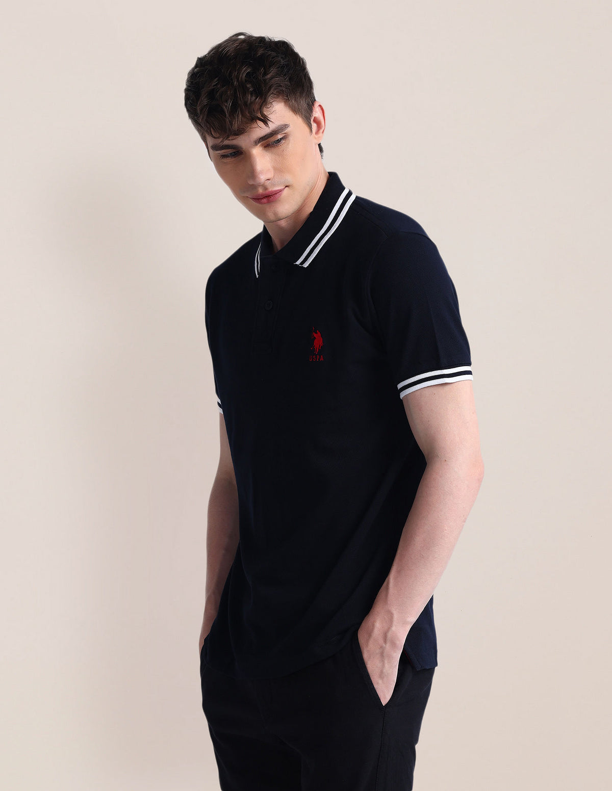 | Polo collar | Logo at chest | Short button placket | Short sleeves with ribbed hems | Uneven vented hem | Solid pattern | Knitted | Slim fit