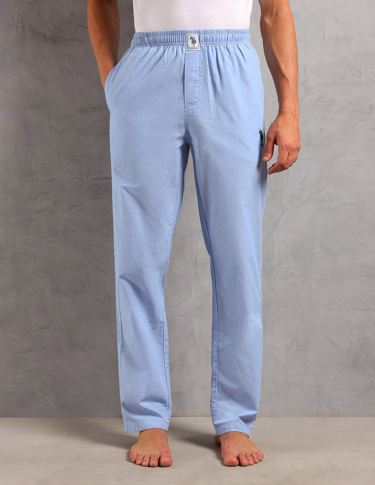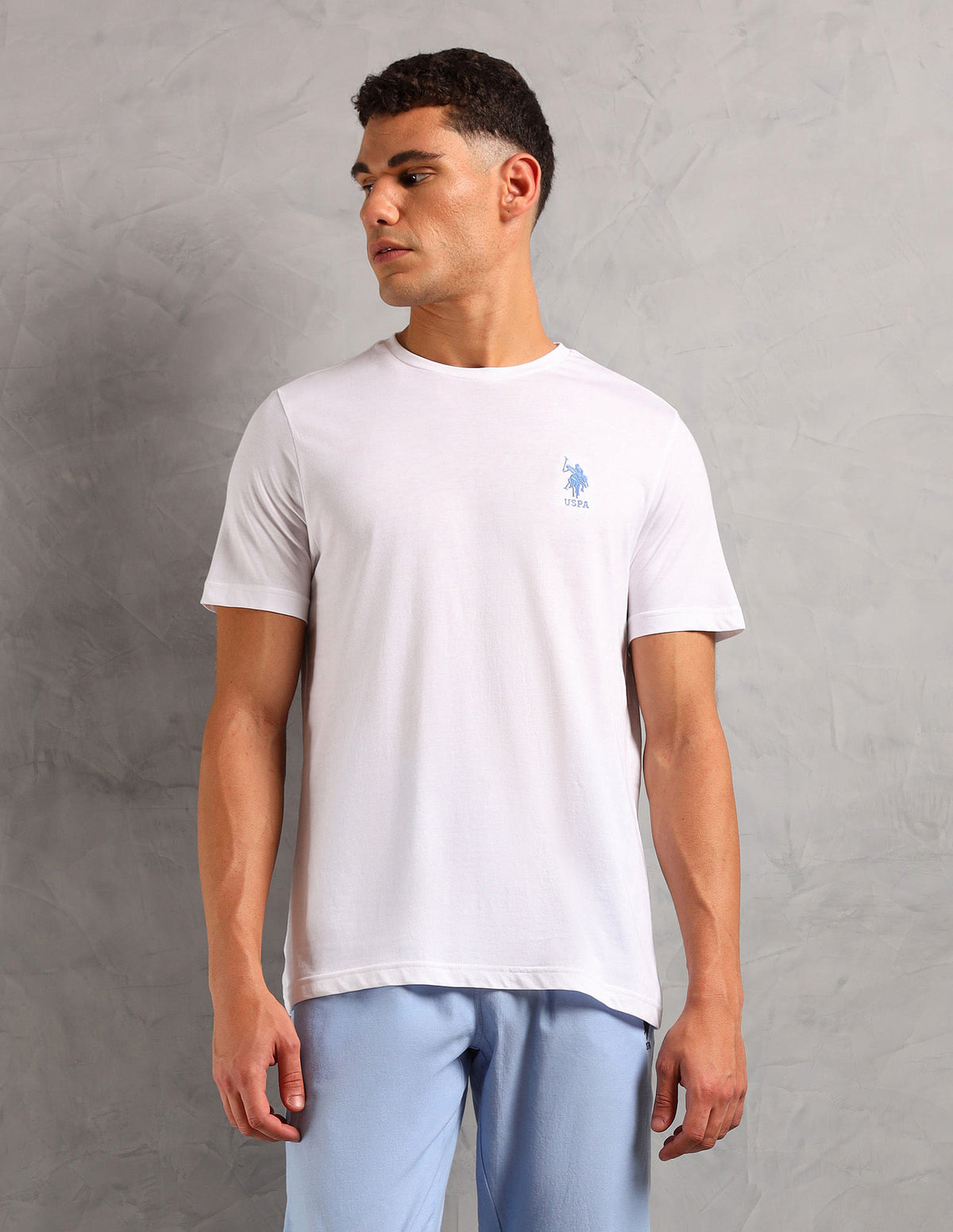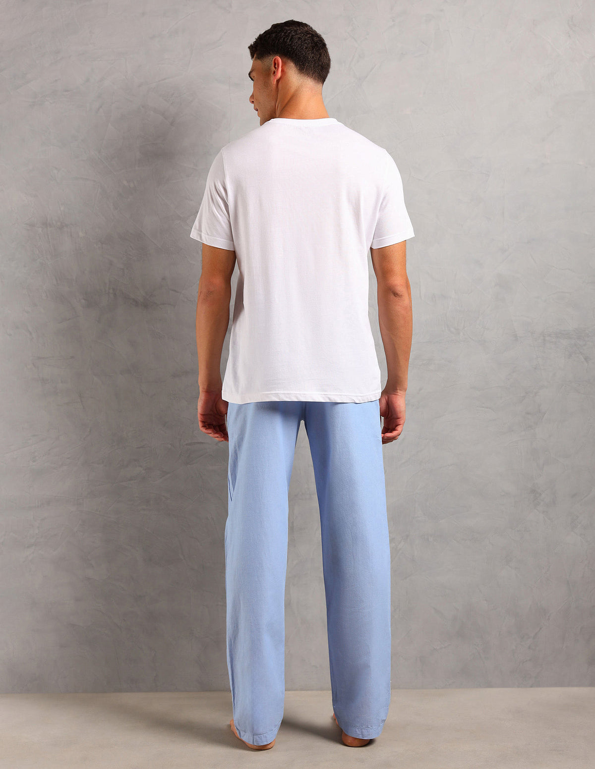 | T-Shirt | Ribbed crew neck | Embroidered logo at chest | Short sleeves | Straight hemline | Solid pattern | Knitted | Trousers | Mid-rise waist | Slip-on closure | Two pockets | Flat front | Solid pattern | Regular fit | Country Of Origin - India