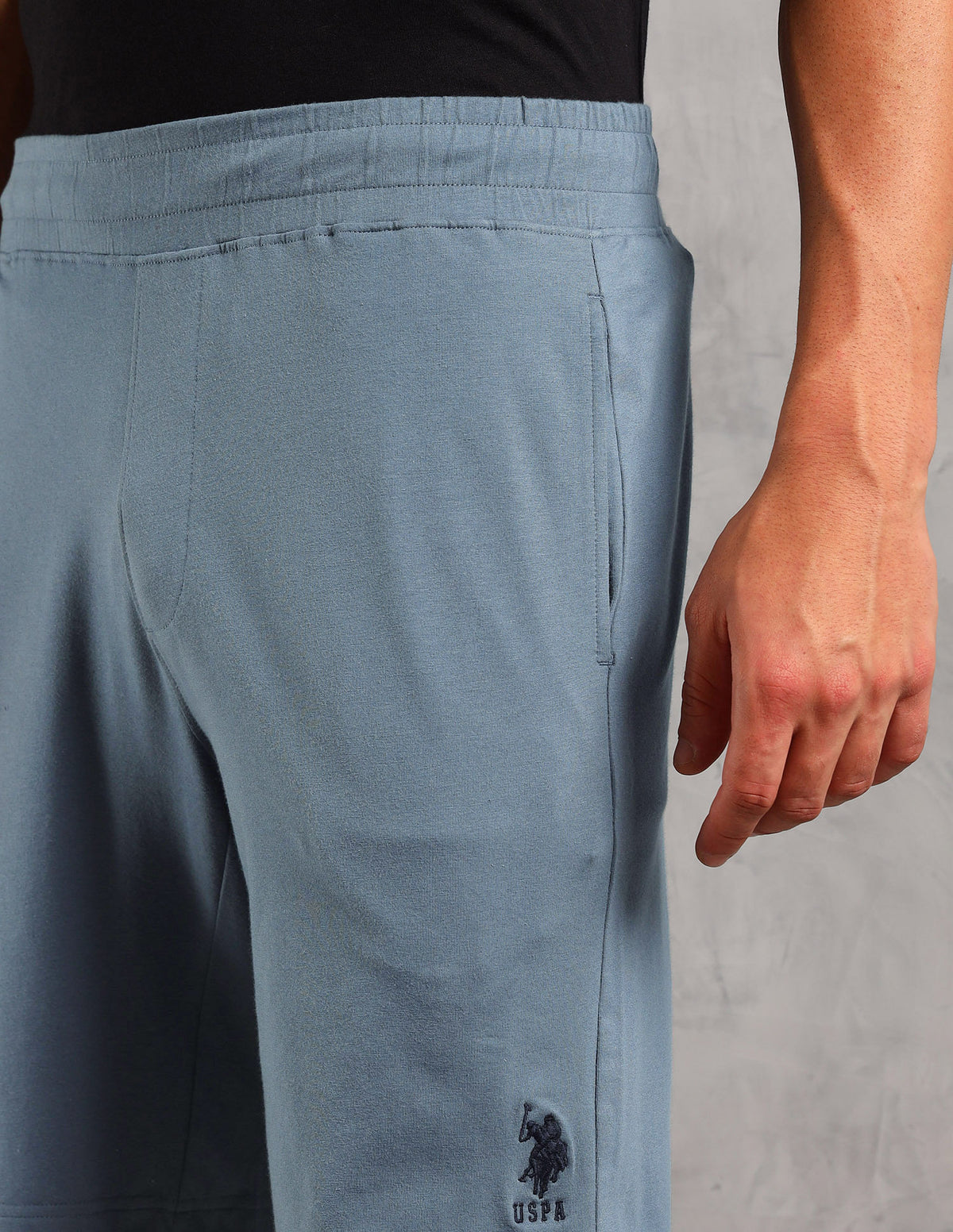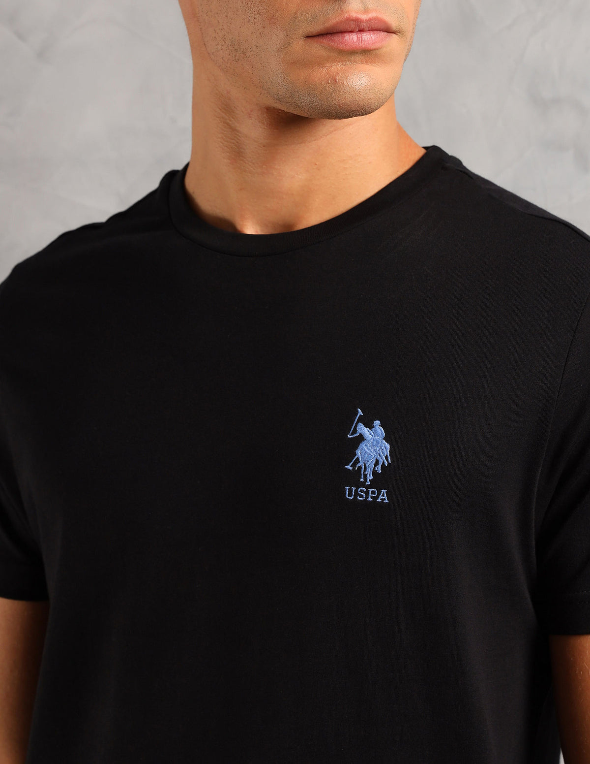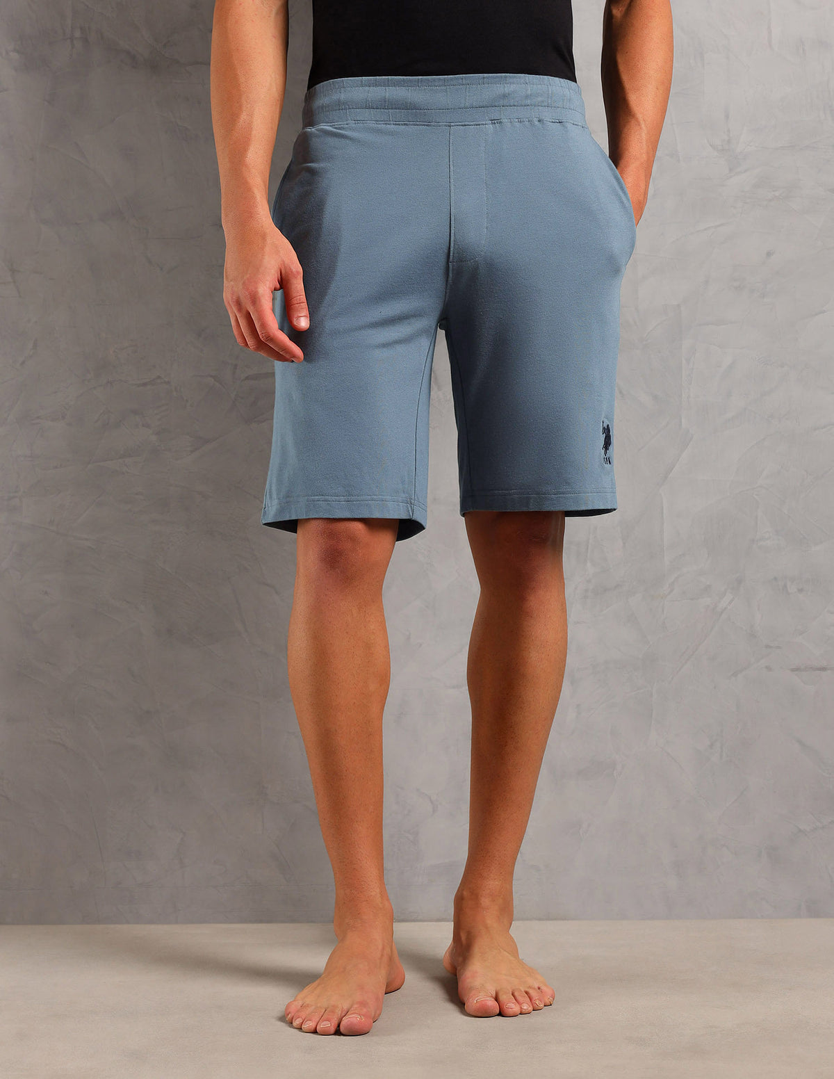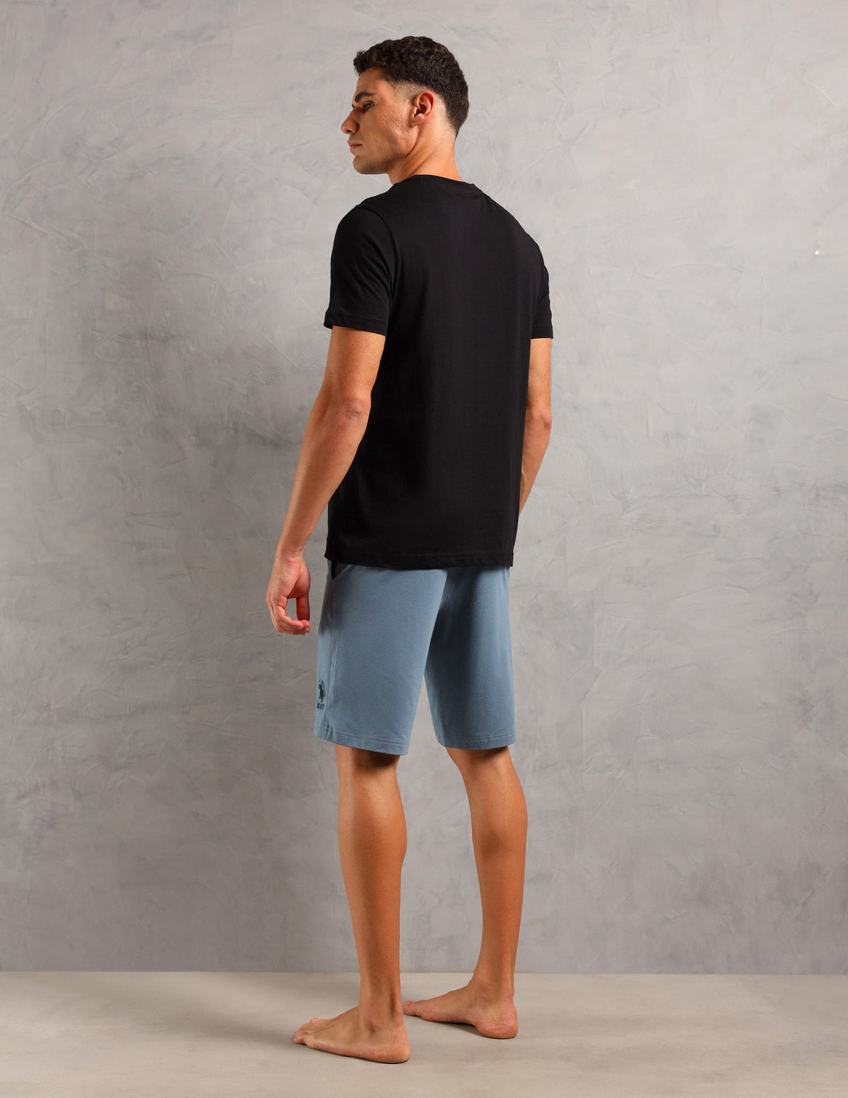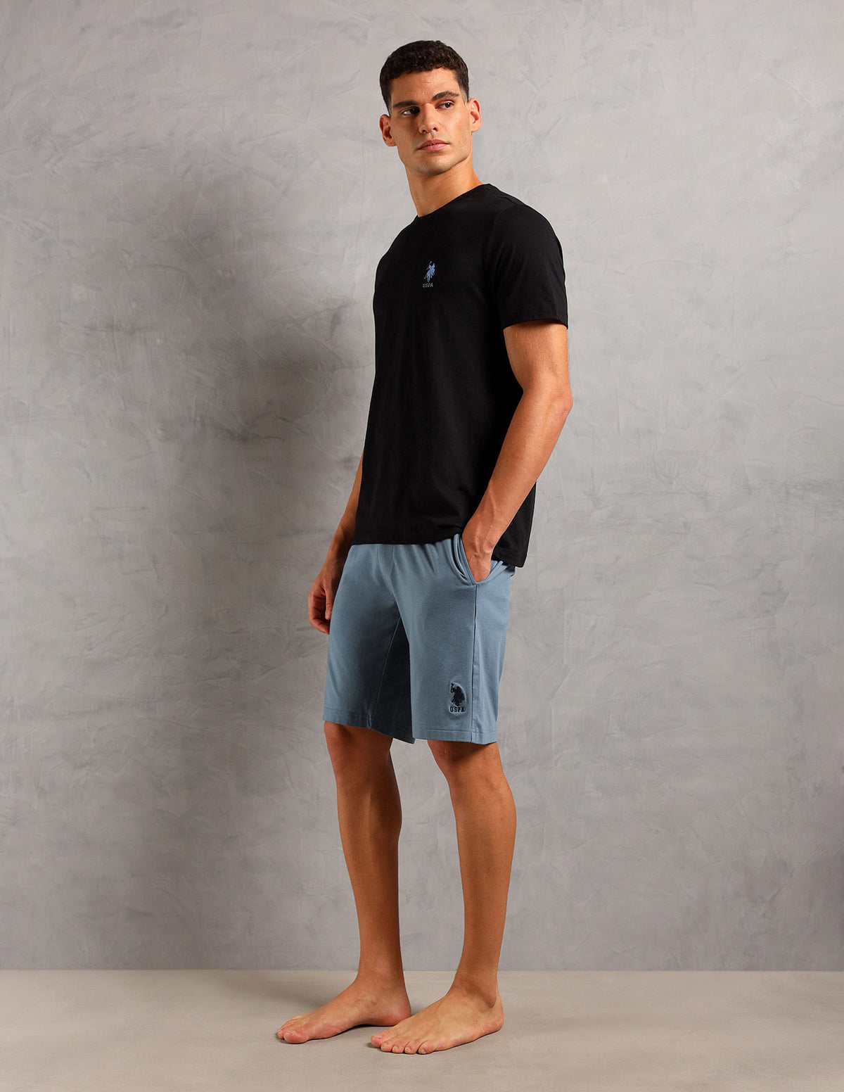 | T-Shirt | Ribbed crew neck | Embroidered logo at chest | Short sleeves | Straight hemline | Solid pattern | Knitted | Shorts | Mid-rise waist | Slip-on closure | Three pockets | Solid pattern | Regular fit | Country Of Origin - India