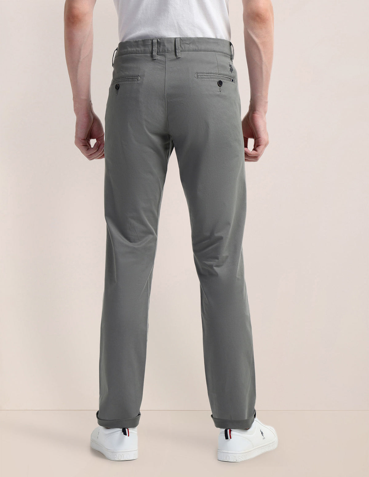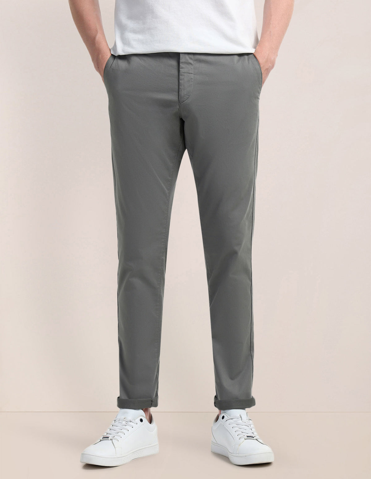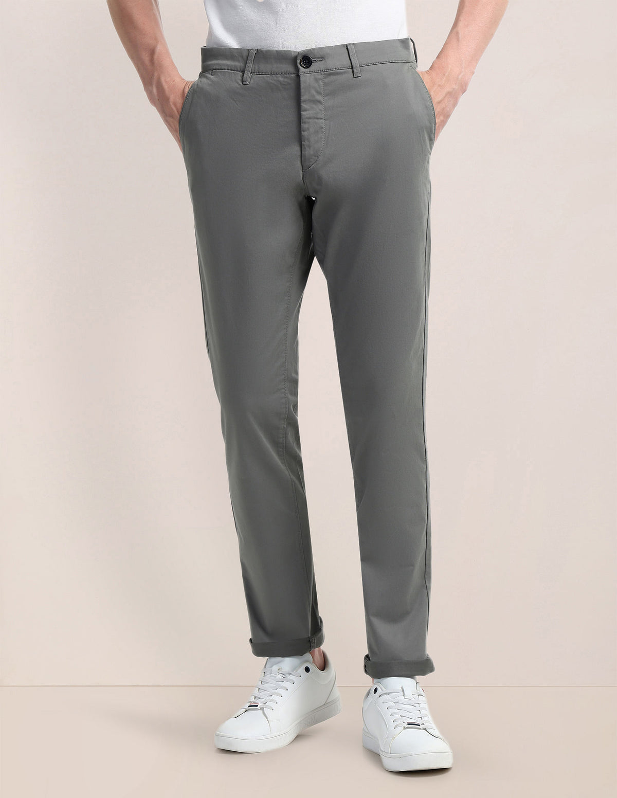 | Mid rise | Button and zip fly closure | Four pockets | Flat front | Solid pattern | Regular weave | Denver slim fit