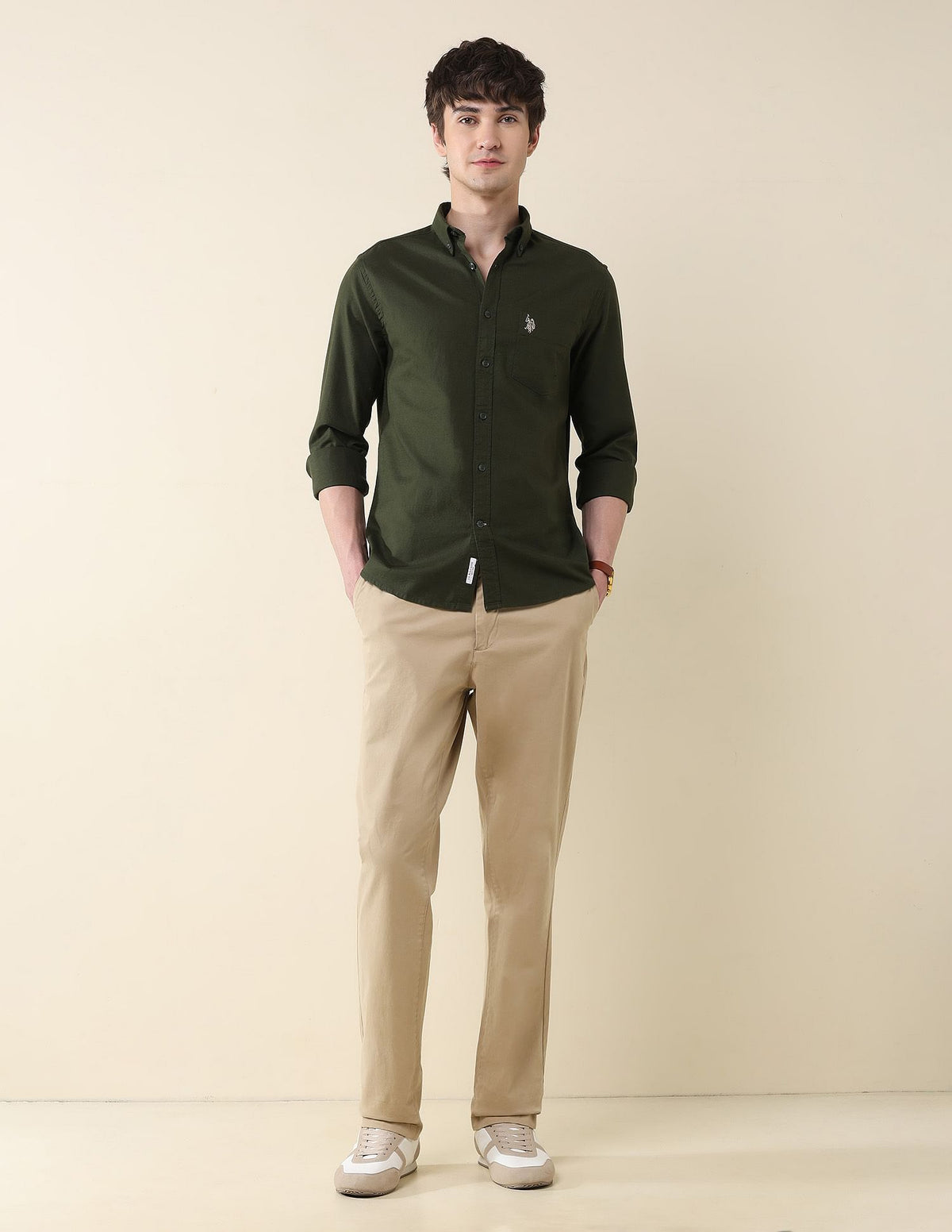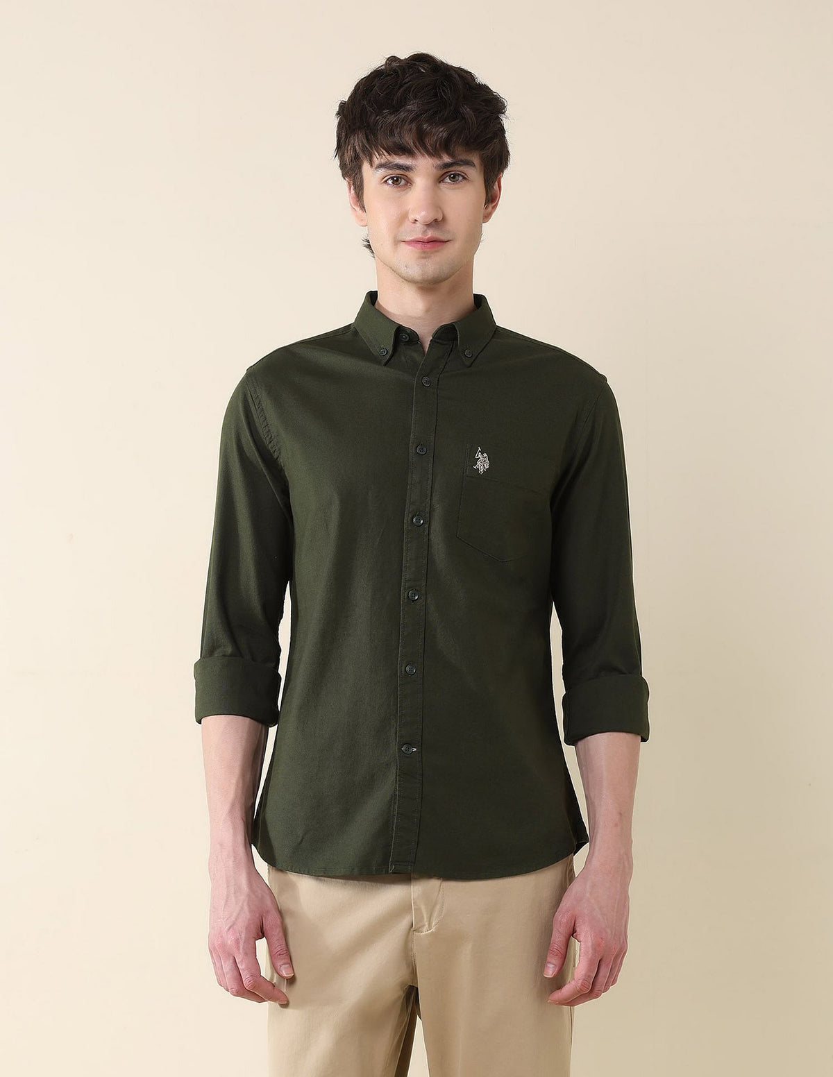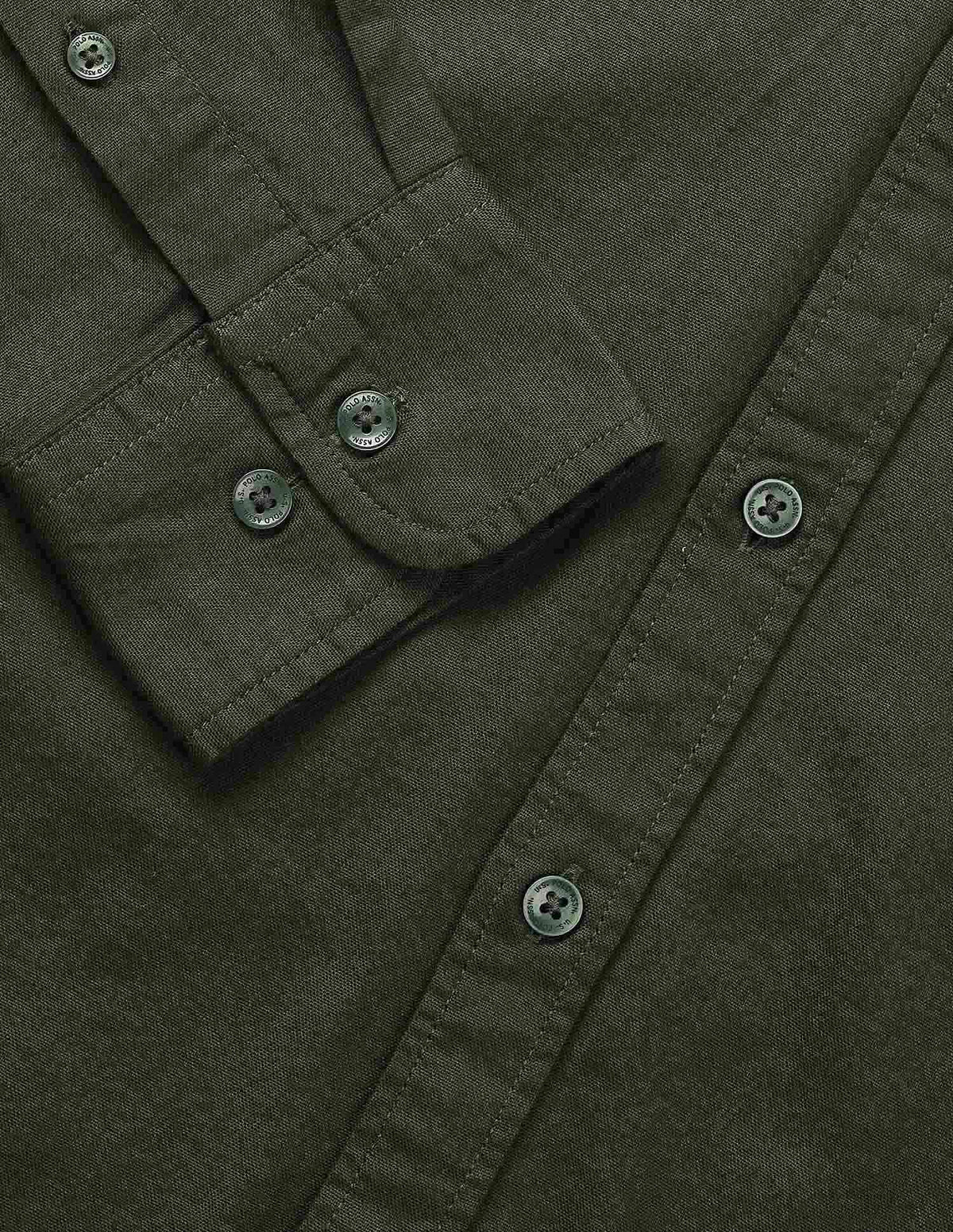 | Button-down collar | Chest patch pocket with logo | Full button placket | Long sleeves with rounded cuffs | Curved hemline | Solid pattern | Oxford weave | Tailored fit |