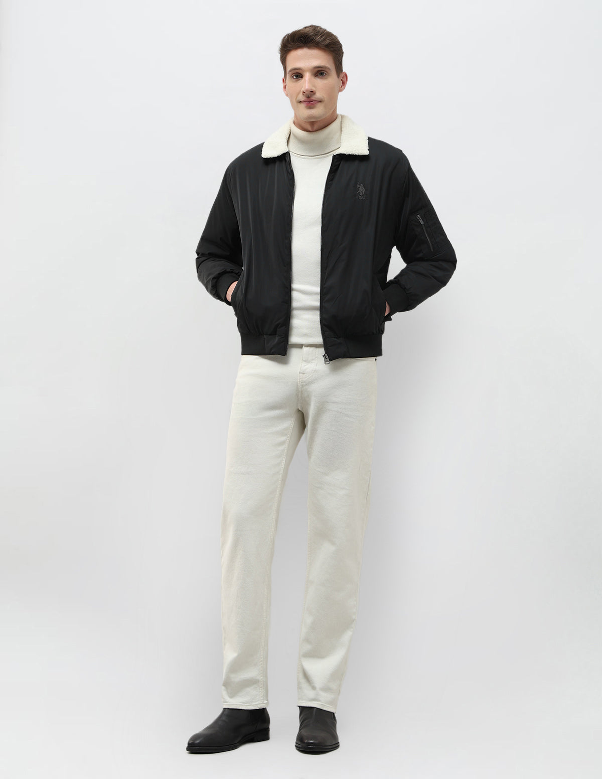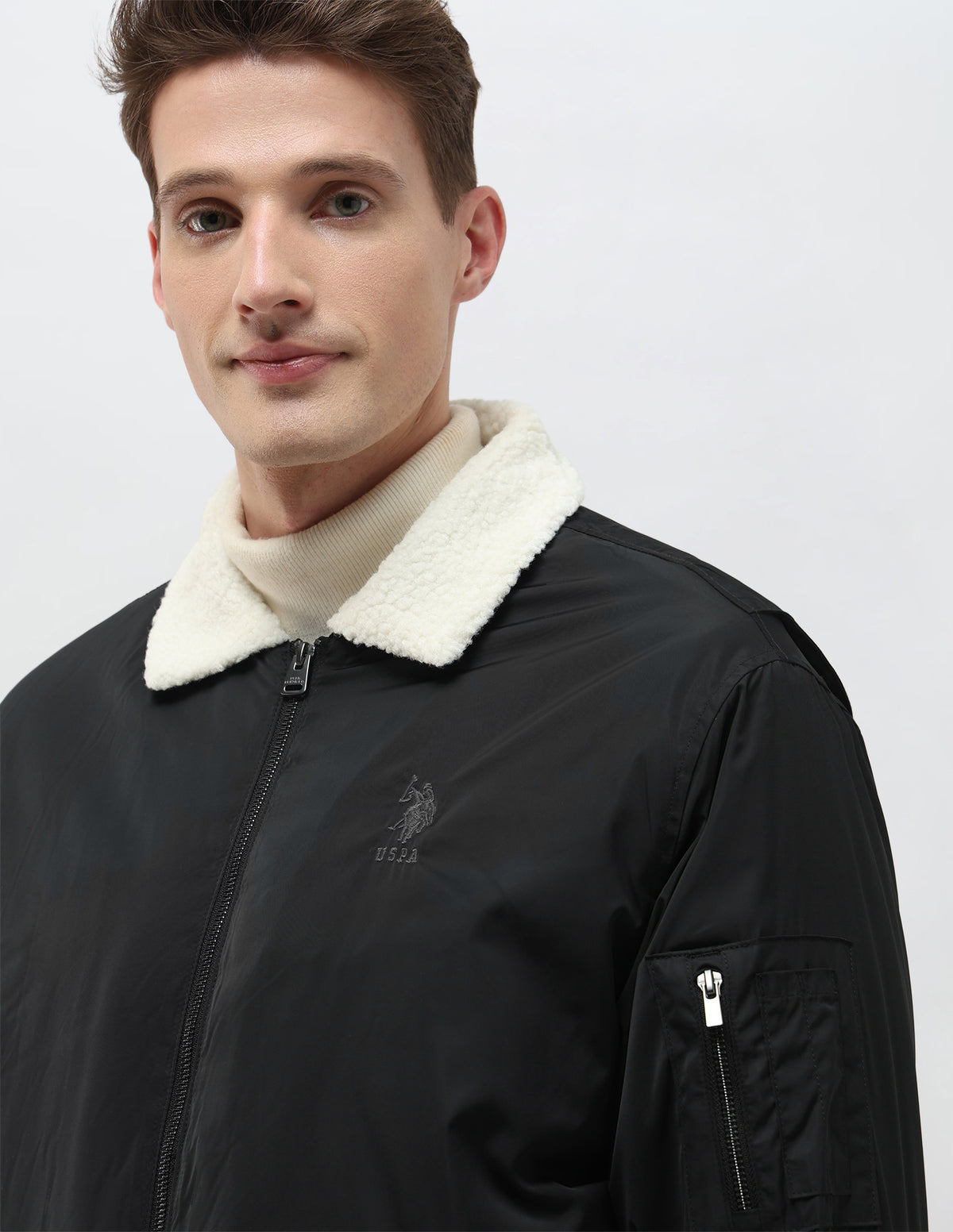 - Three-pocket styling featuring two side flap pockets and one zip pocket at sleeve