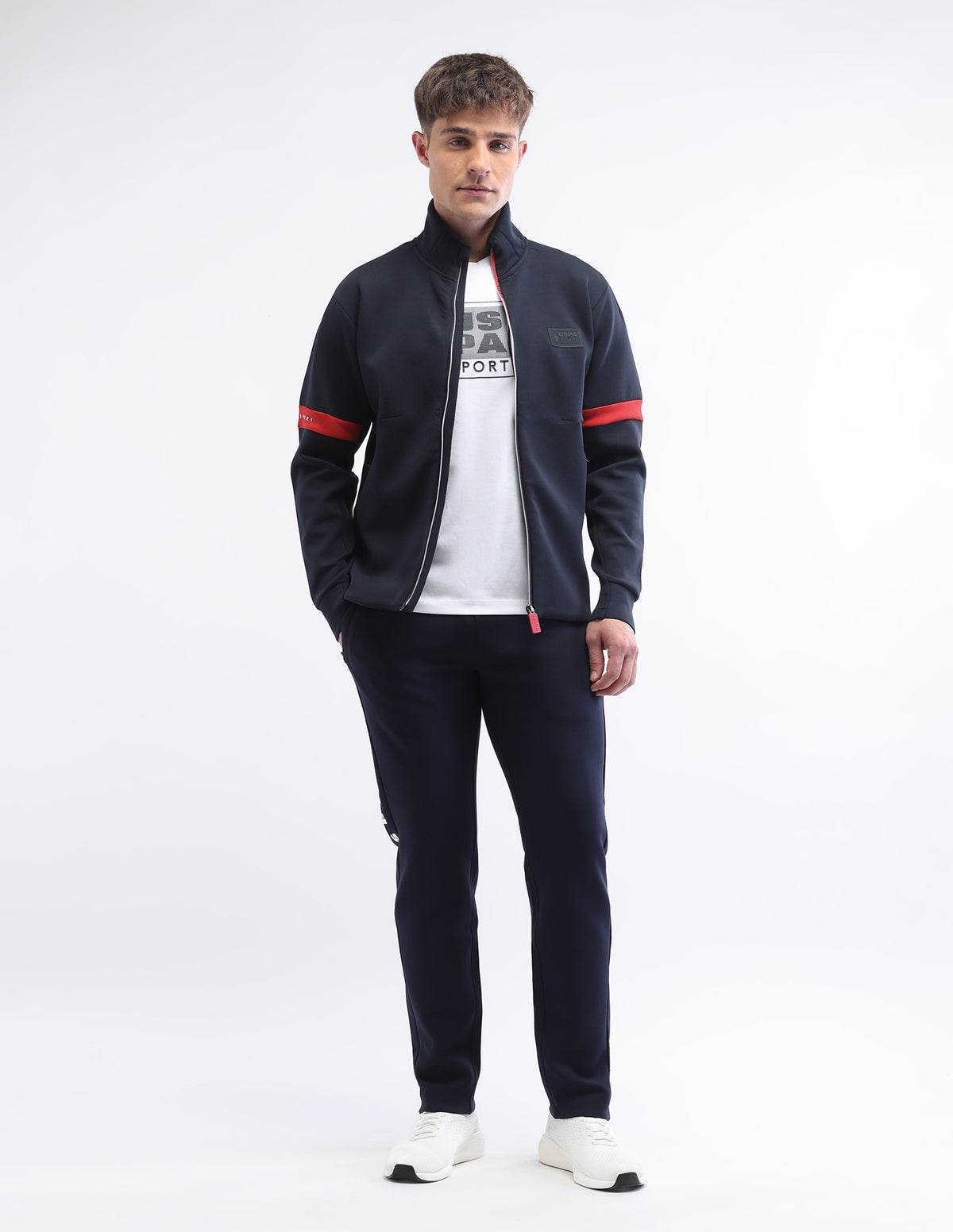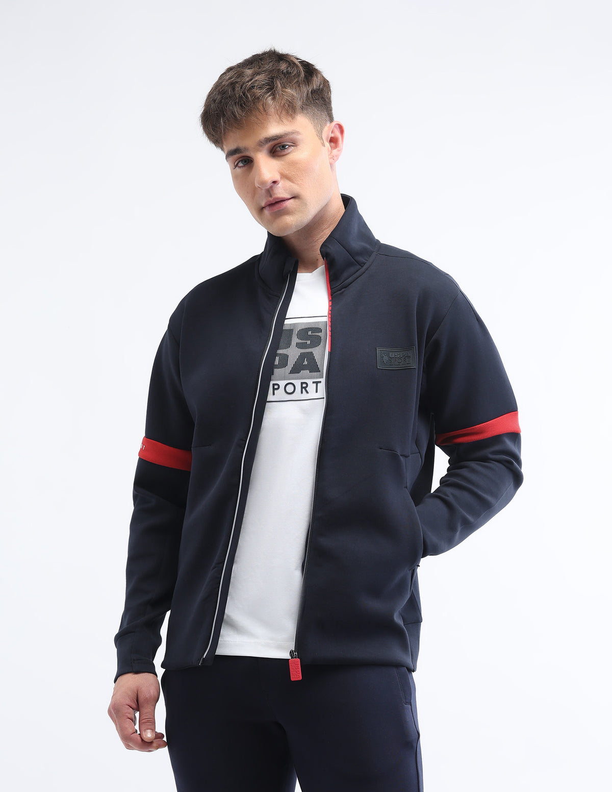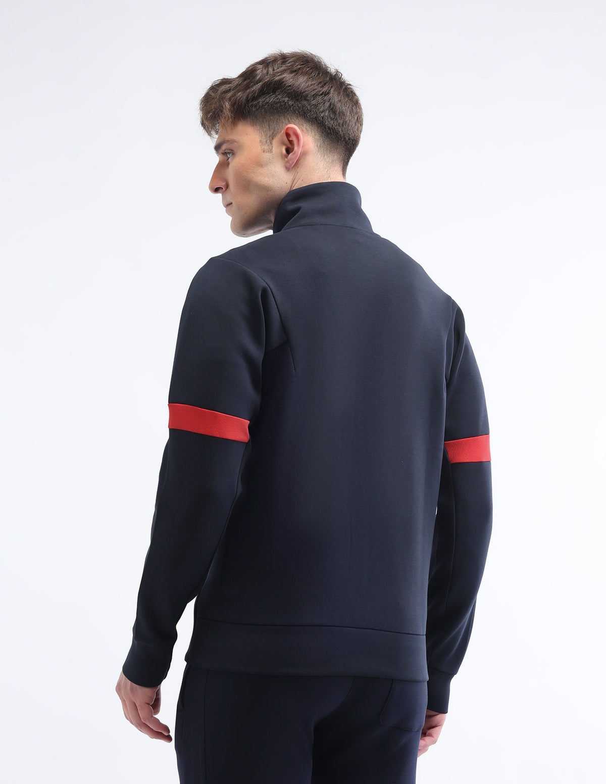 - Contrast stripes on sleeves