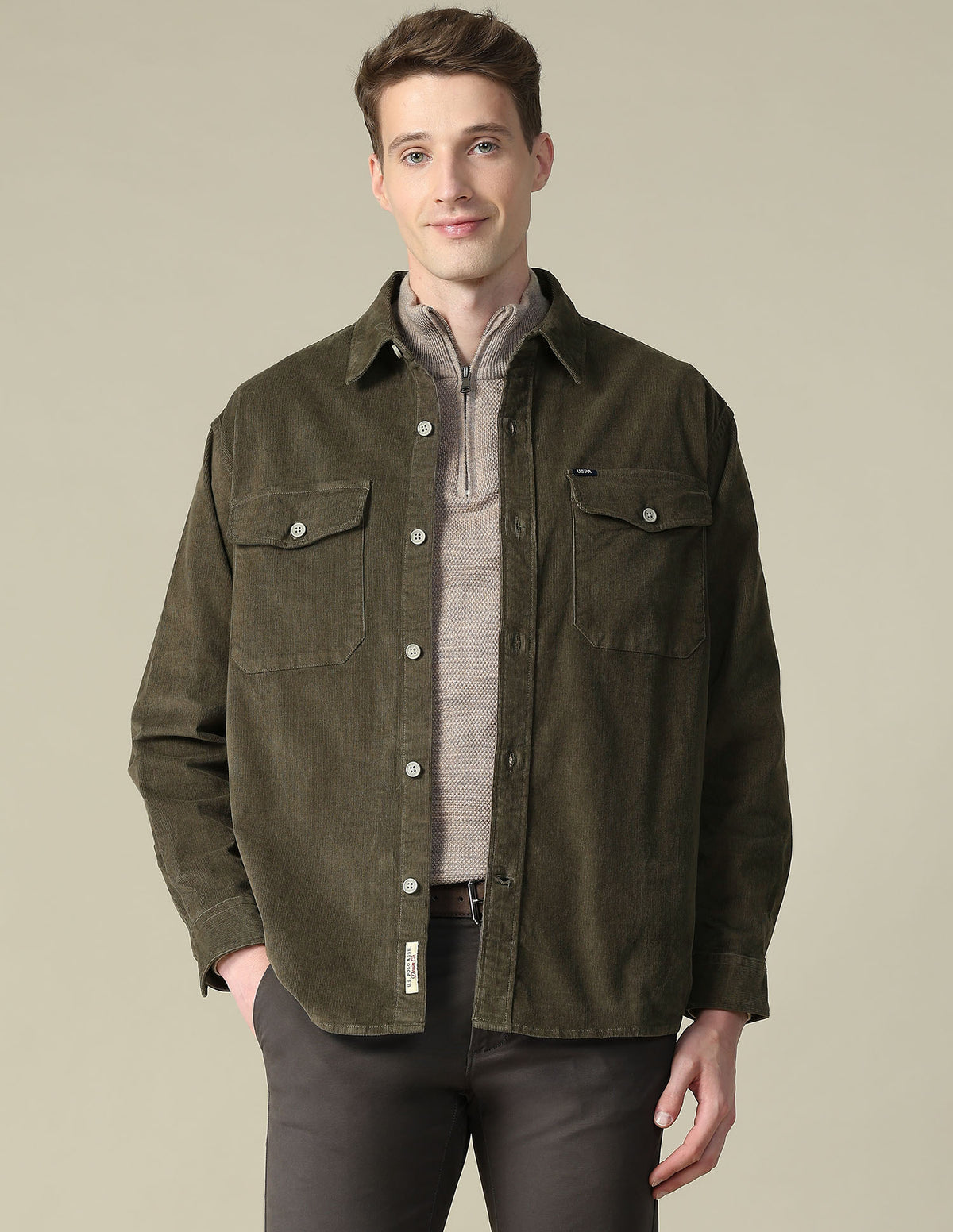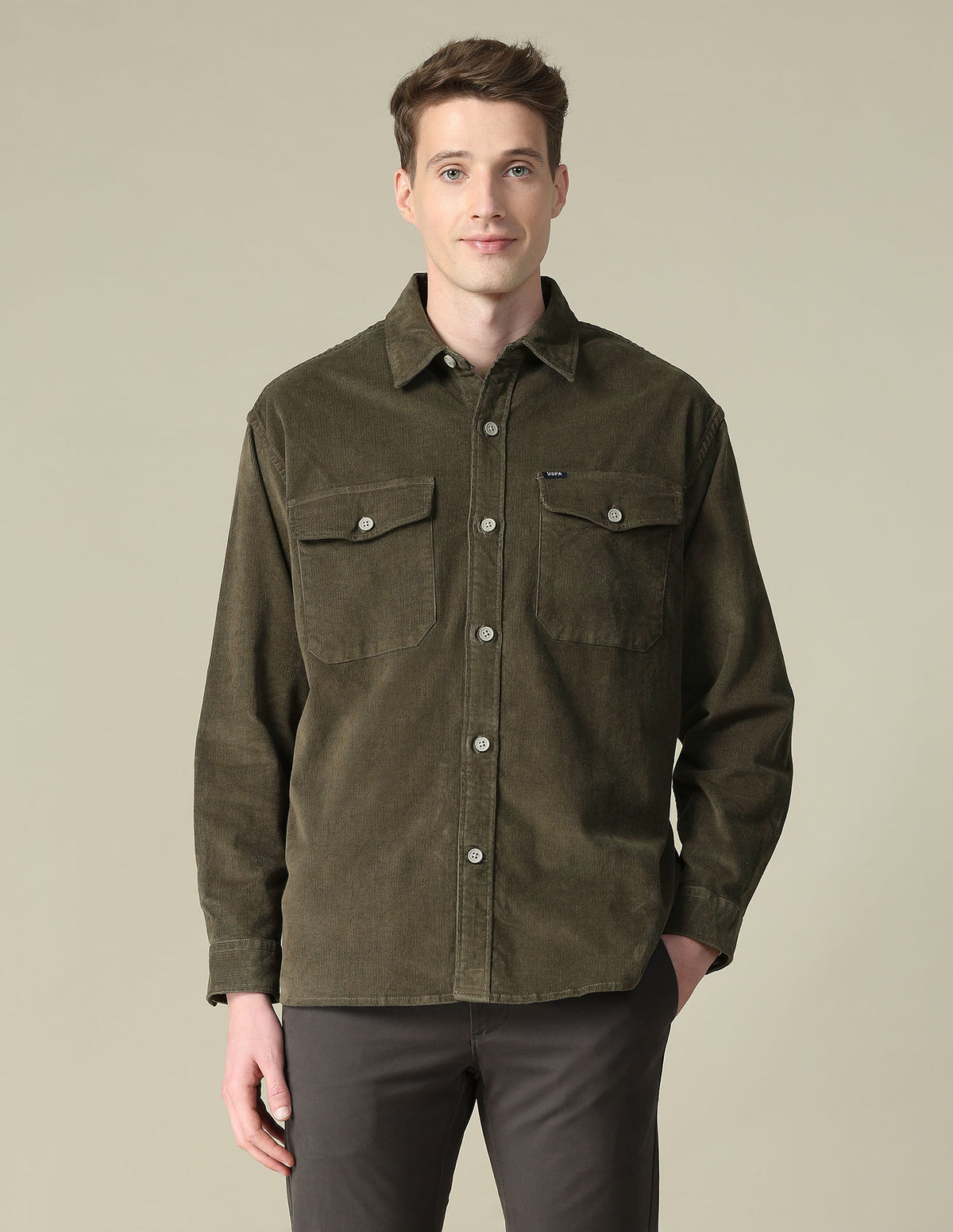 Story: This men's solid shirt features a double pocket design, offering casual practicality with a clean, refined look for everyday wear and relaxed occasions.