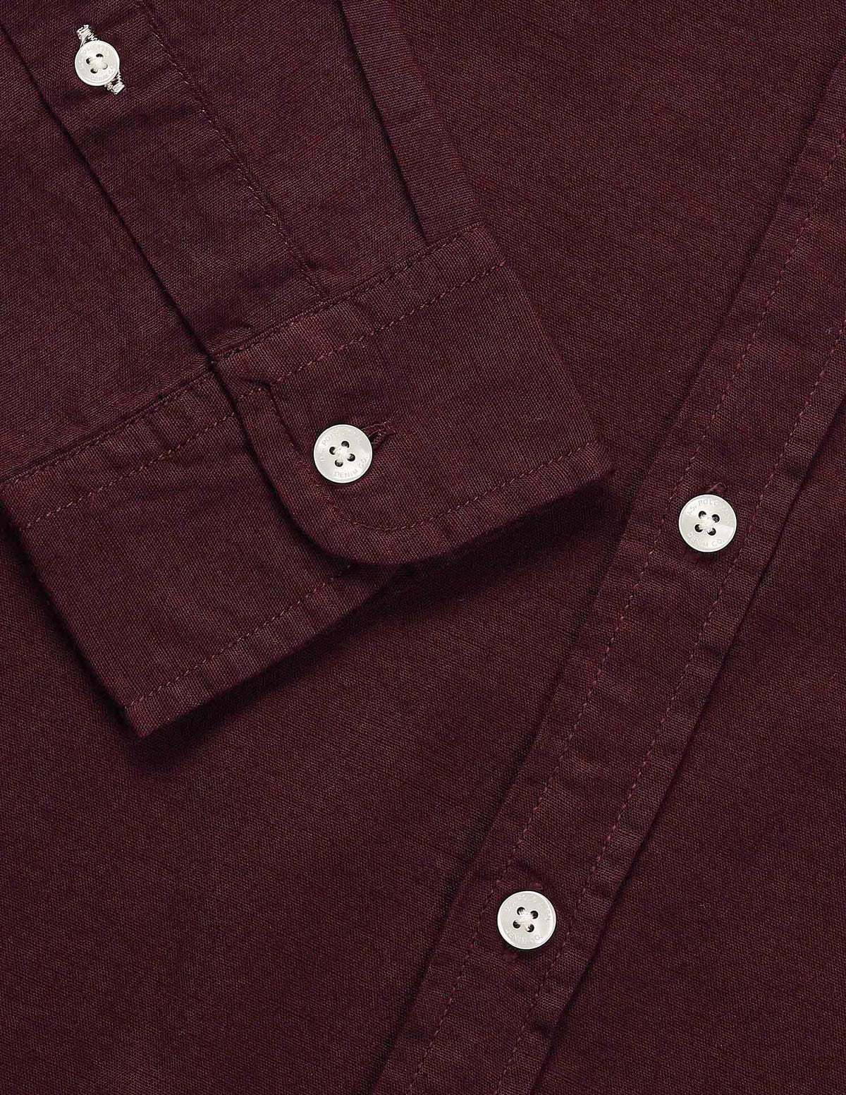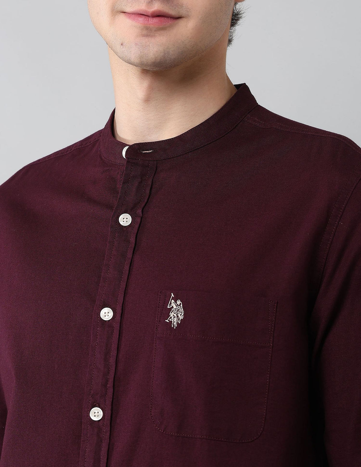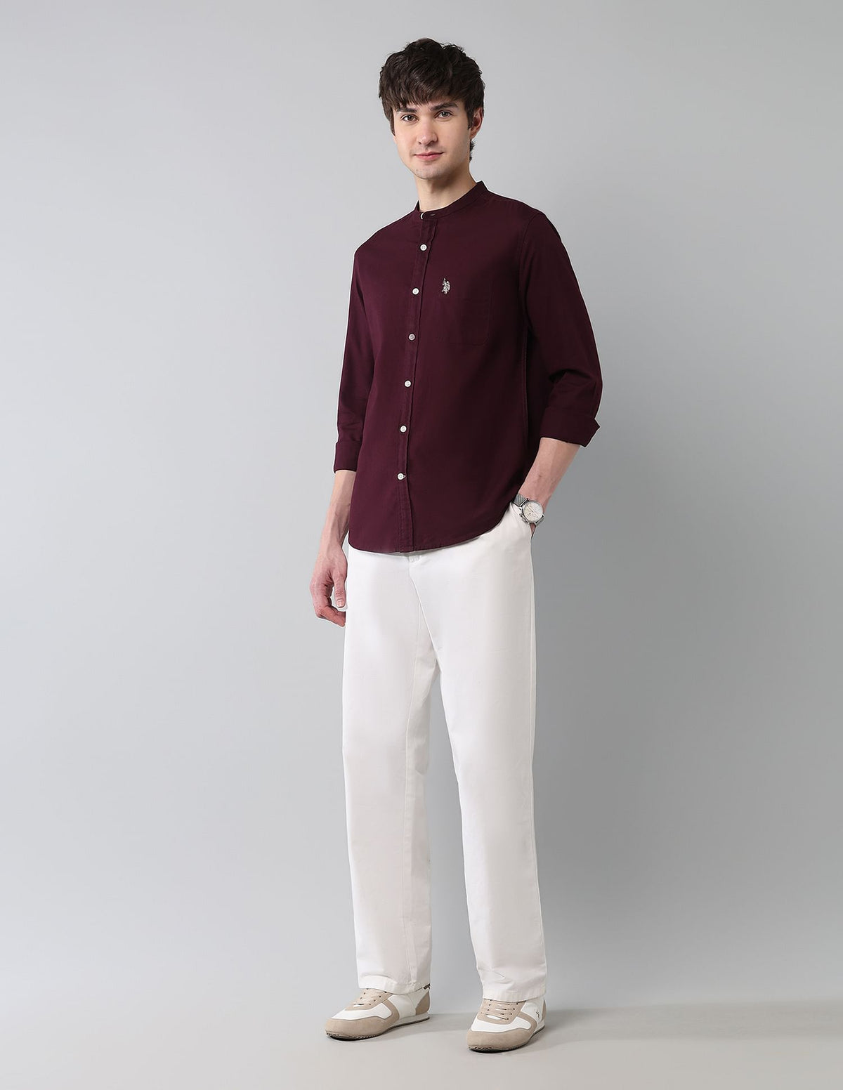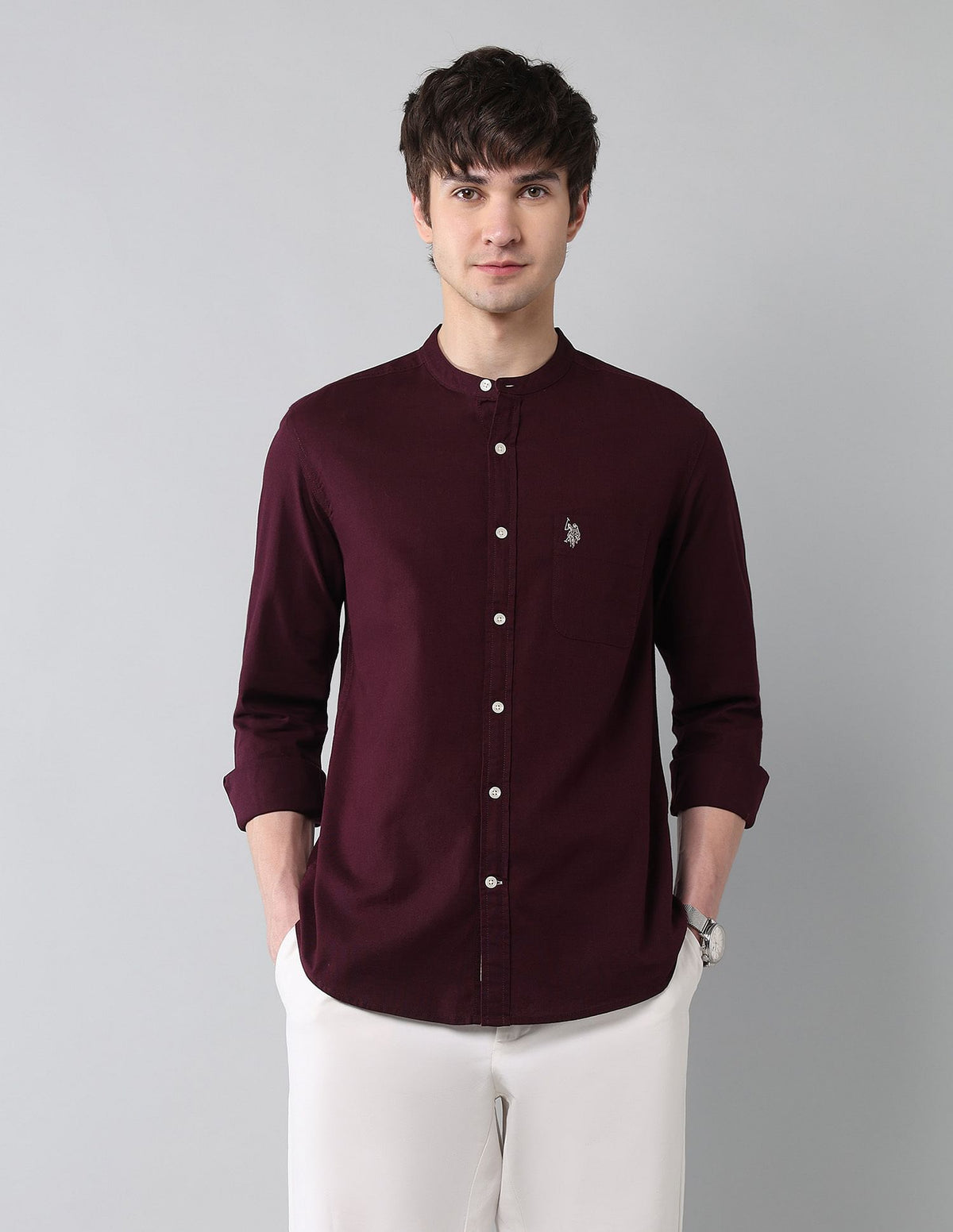 | Mandarin collar | Chest patch pocket with logo | Full button placket | Long sleeves with rounded cuffs | Curved hemline | Solid pattern | Twill weave | Regular fit |