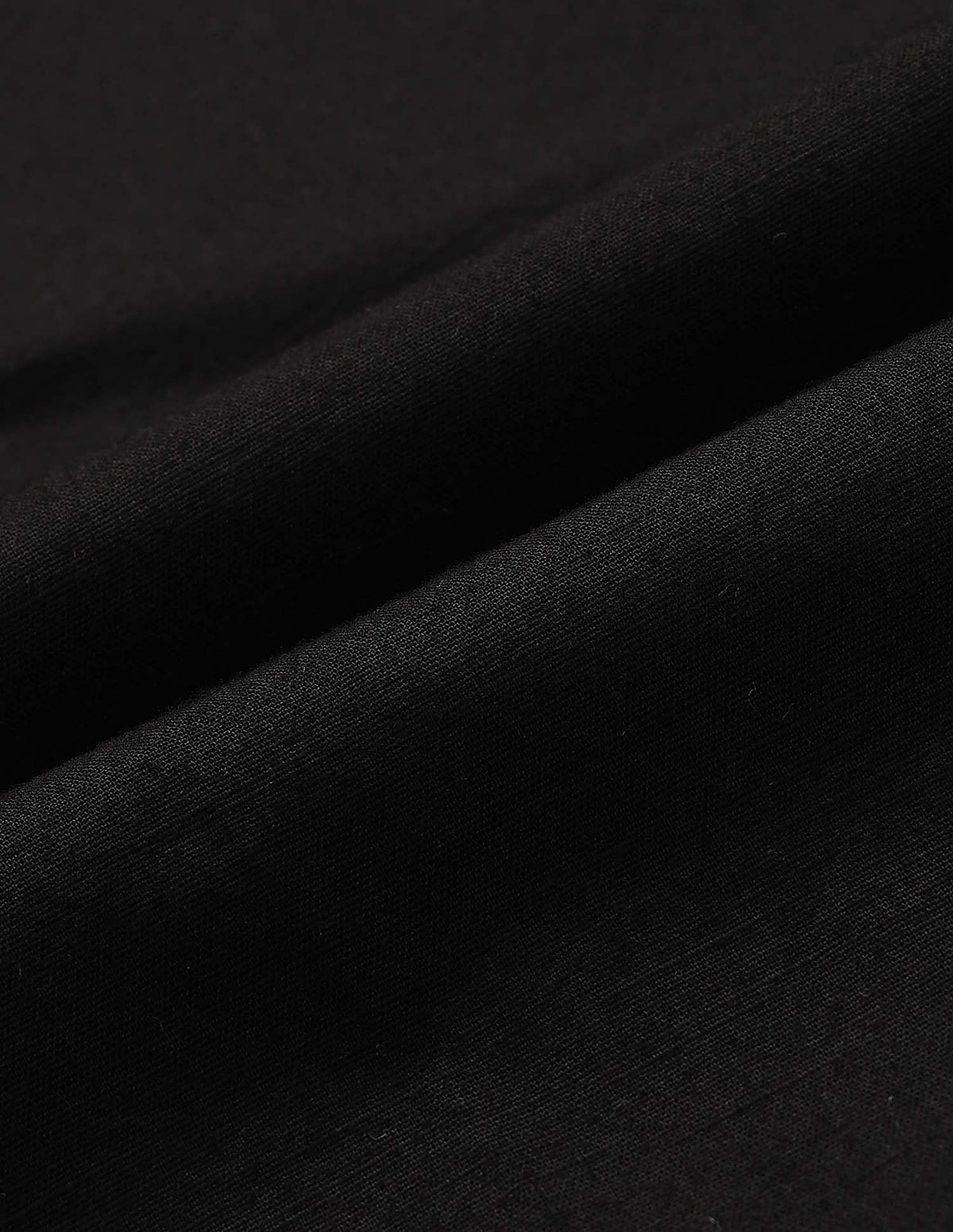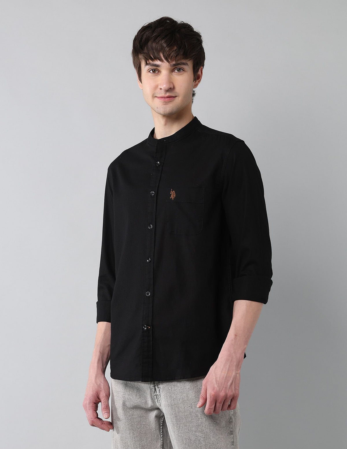 | Mandarin collar | Chest patch pocket with logo | Full button placket | Long sleeves with rounded cuffs | Curved hemline | Solid pattern | Twill weave | Regular fit |