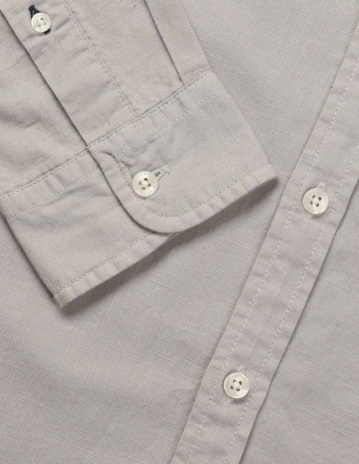 | Mandarin collar | Chest patch pocket with logo | Full button placket | Long sleeves with rounded cuffs | Curved hemline | Solid pattern | Twill weave | Regular fit |