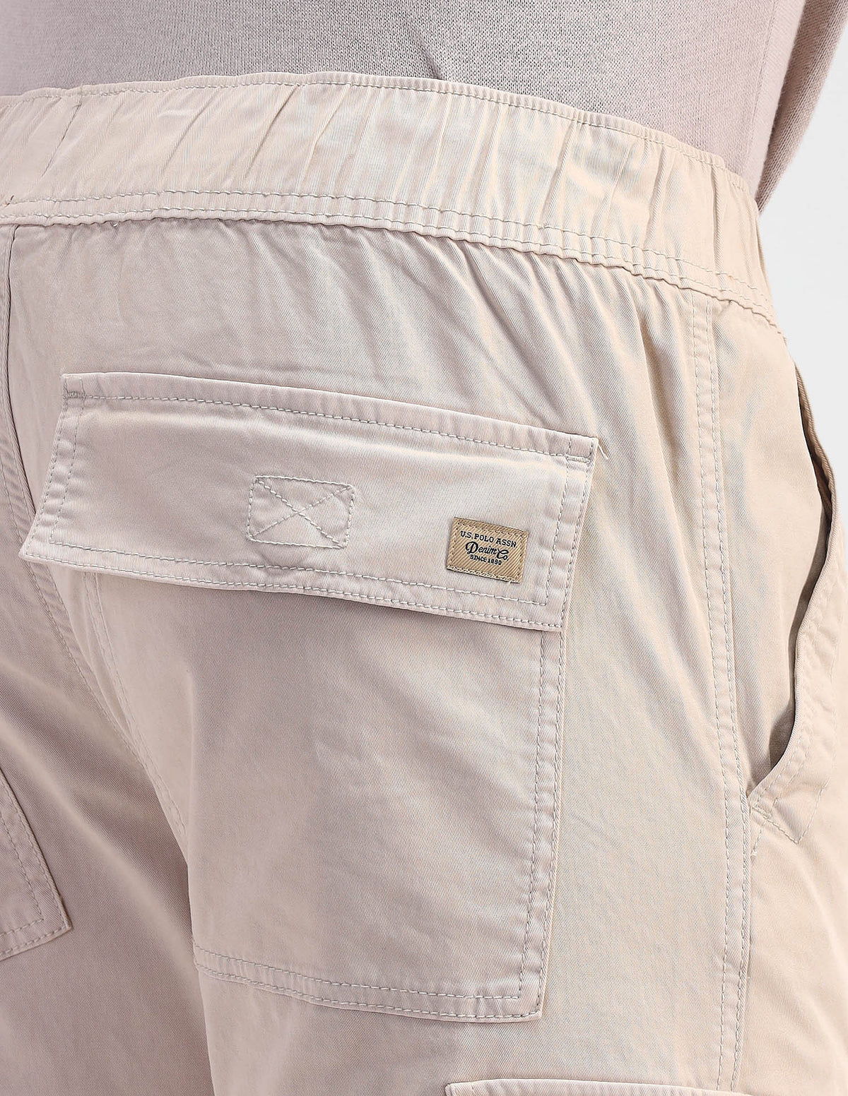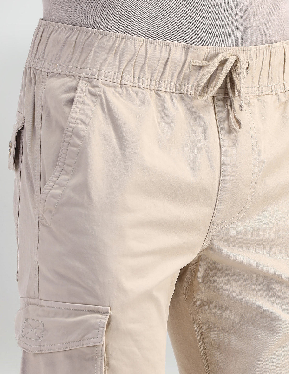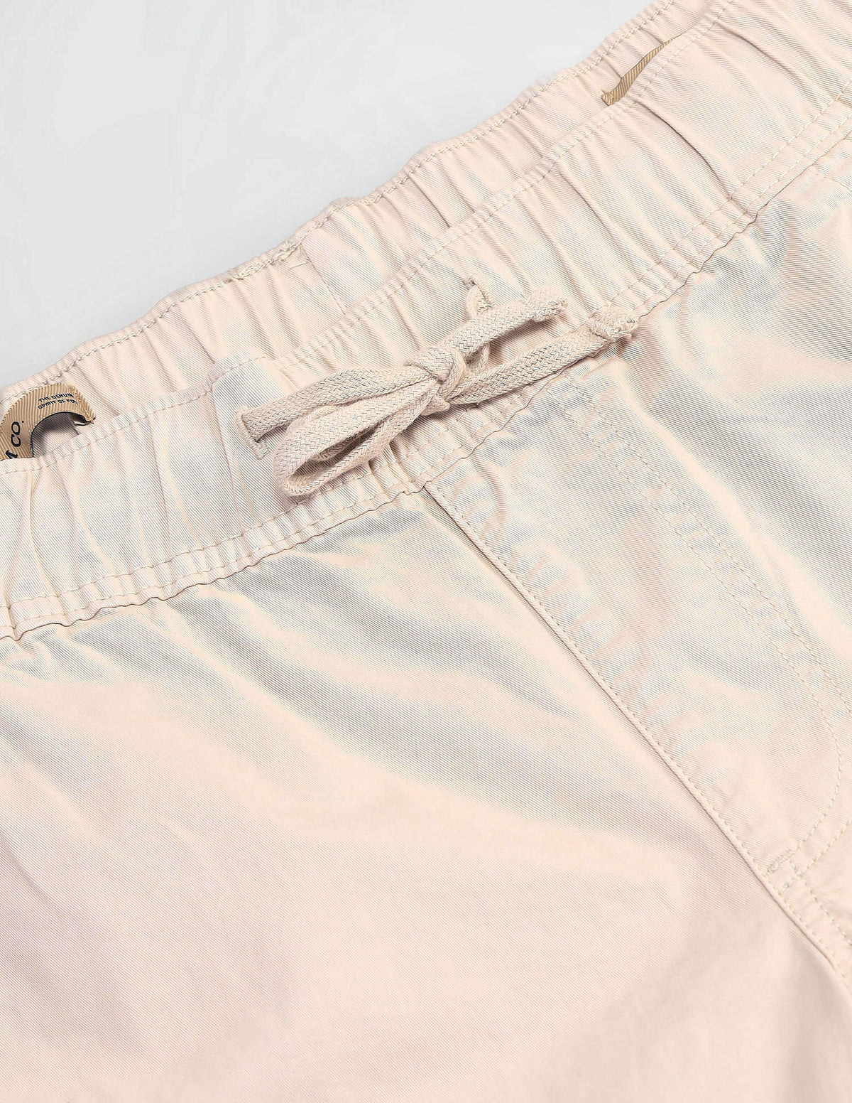 | Mid-rise waist | Drawstring closure | Six pockets | Flat front | Solid pattern | Twill weave | Straight fit |