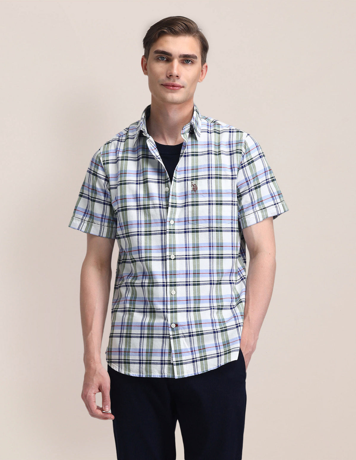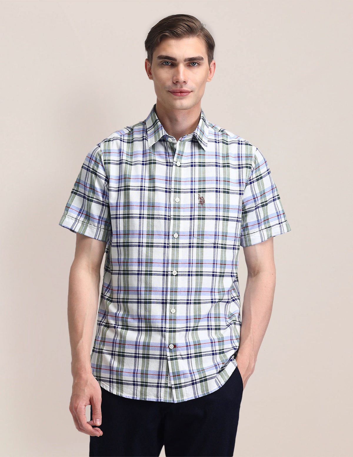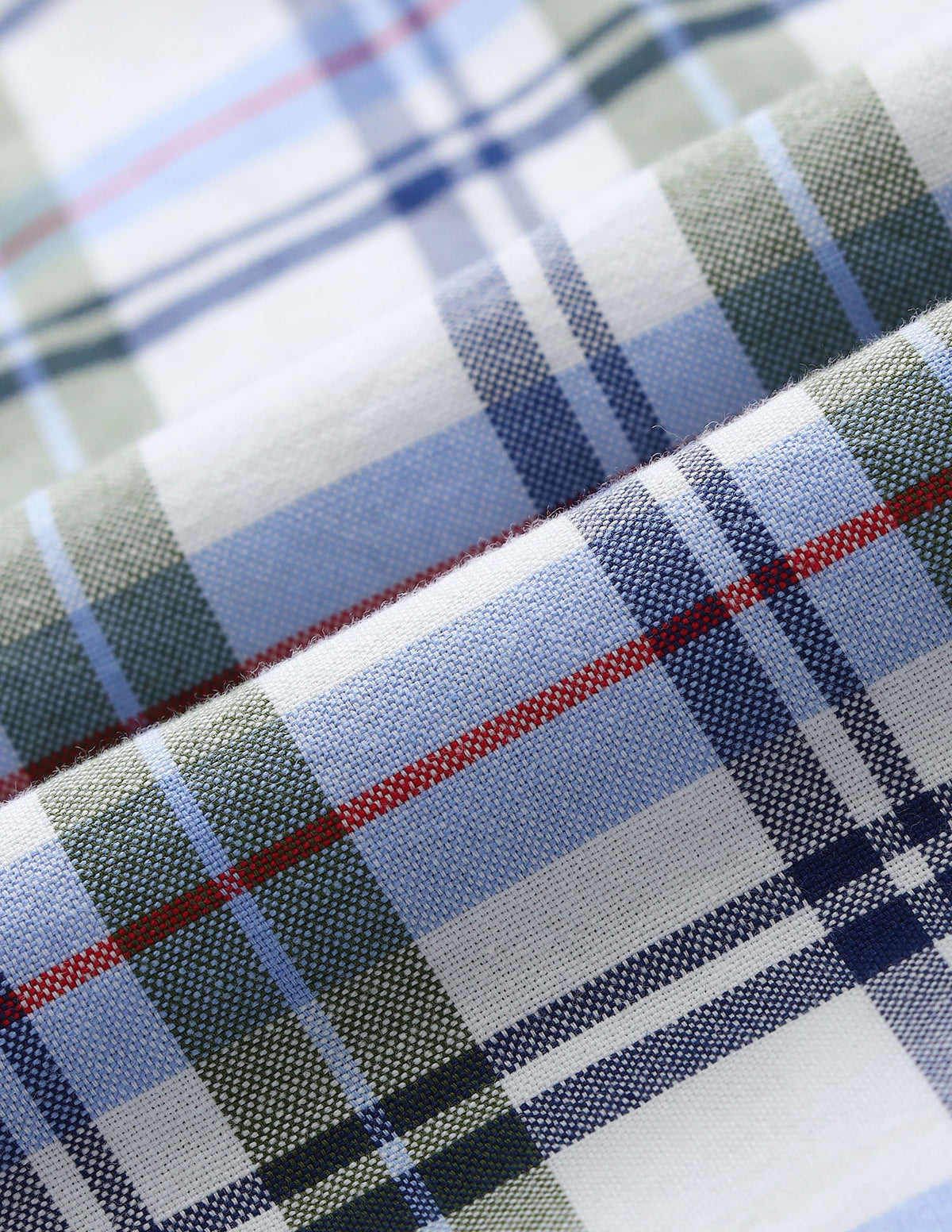 | Semi-cutaway collar | French button placket | Short sleeves | Curved hemline | Tartan checked pattern | Oxford weave | Brand Fit: Tailored Fit | Fit mapping: Regular fit