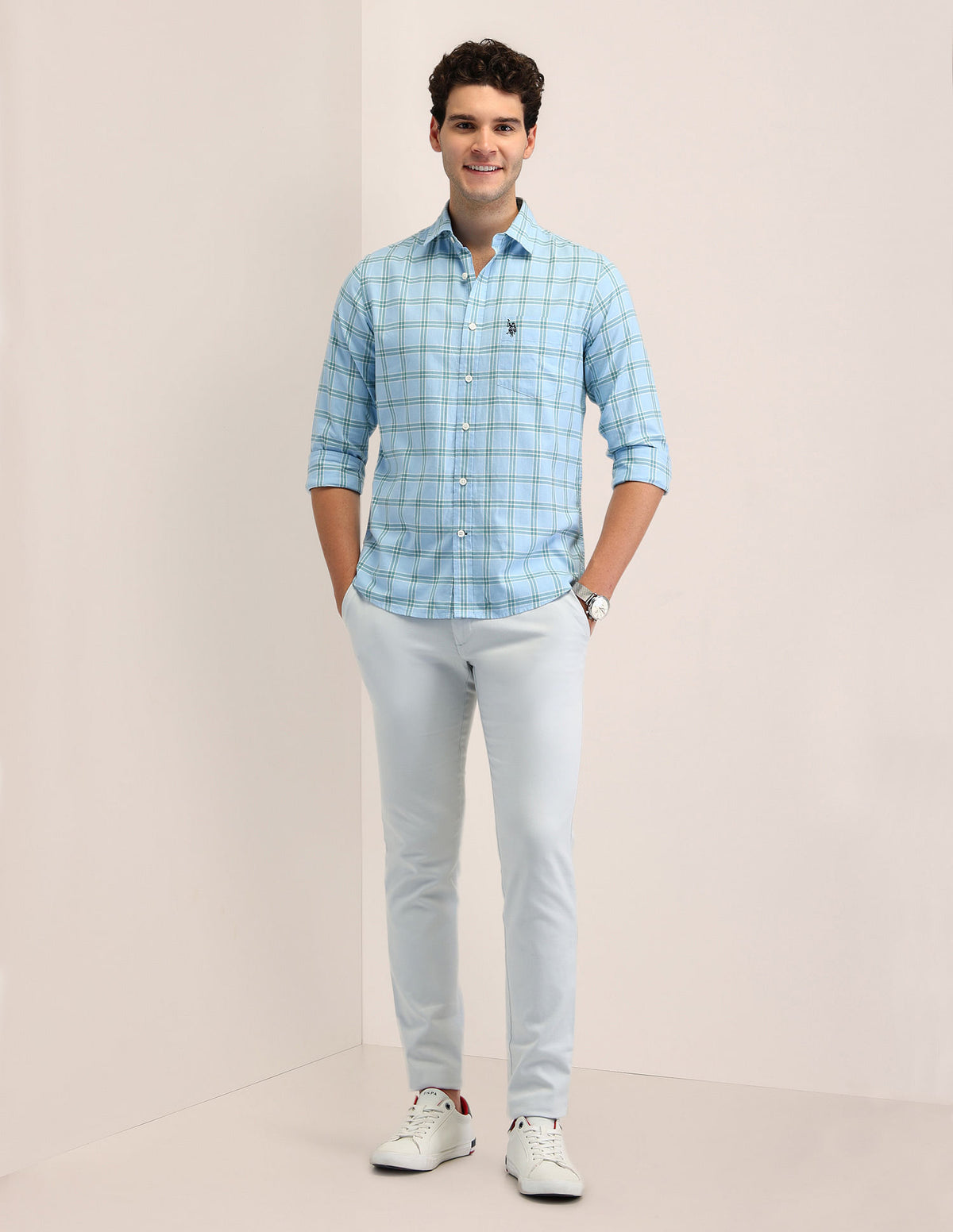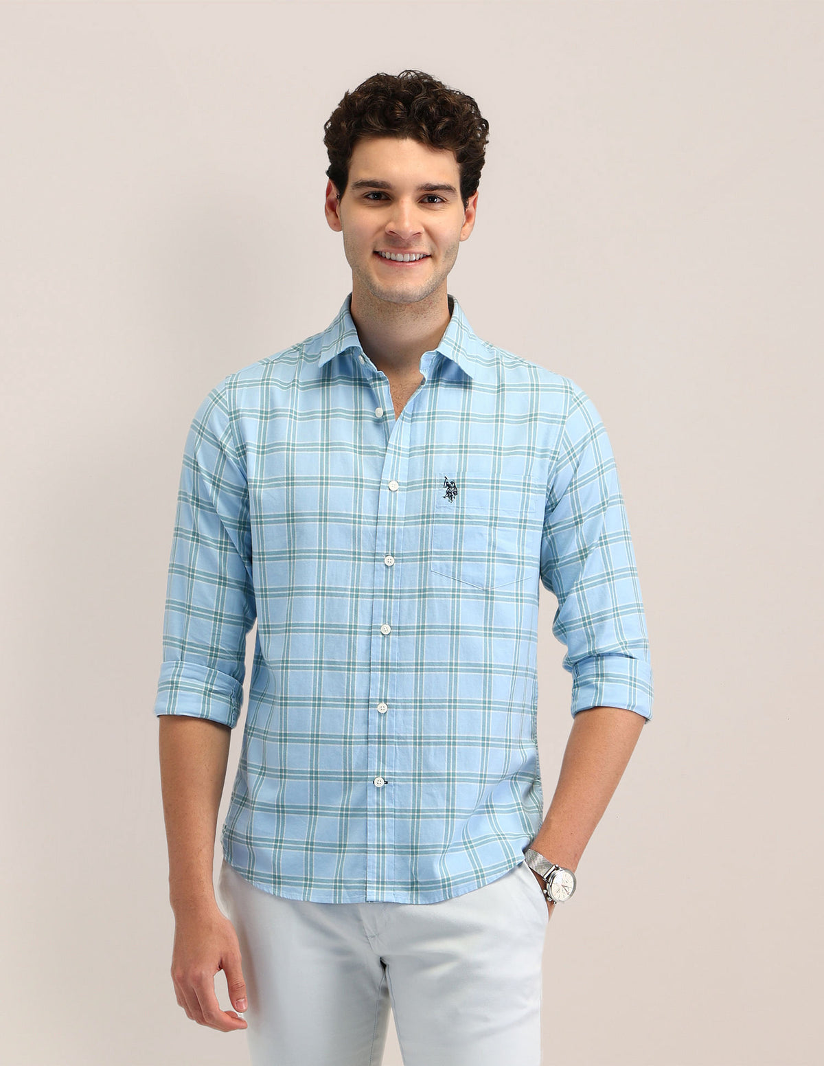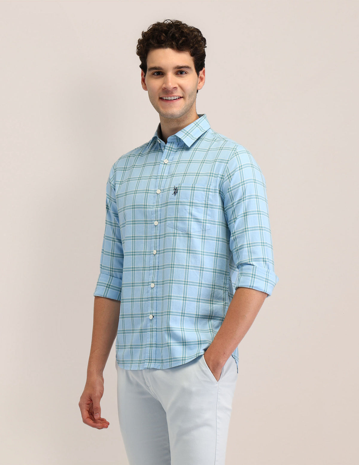 | Semi-spread collar | Logo at chest | Full button placket | Long sleeves with rounded cuffs | Curved hemline | Tartan checked pattern | Dobby weave | Tailored fit |