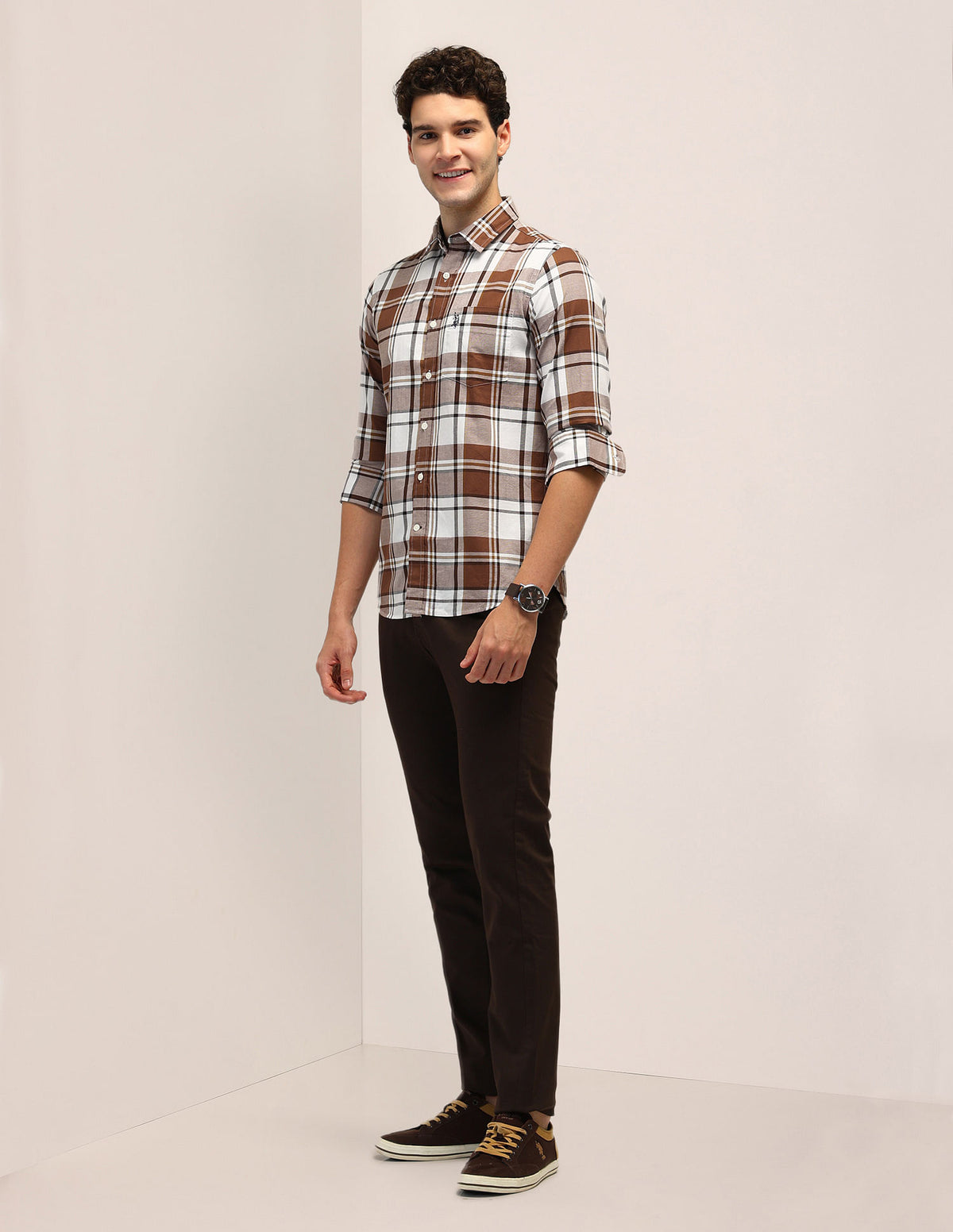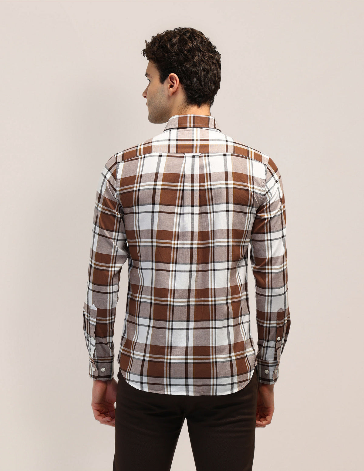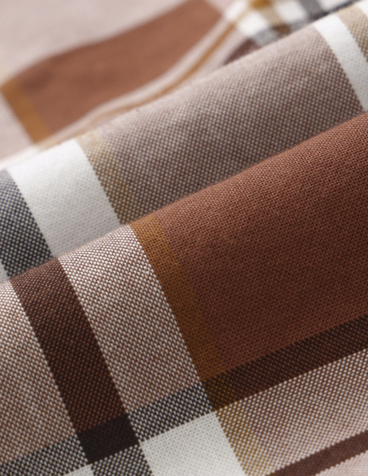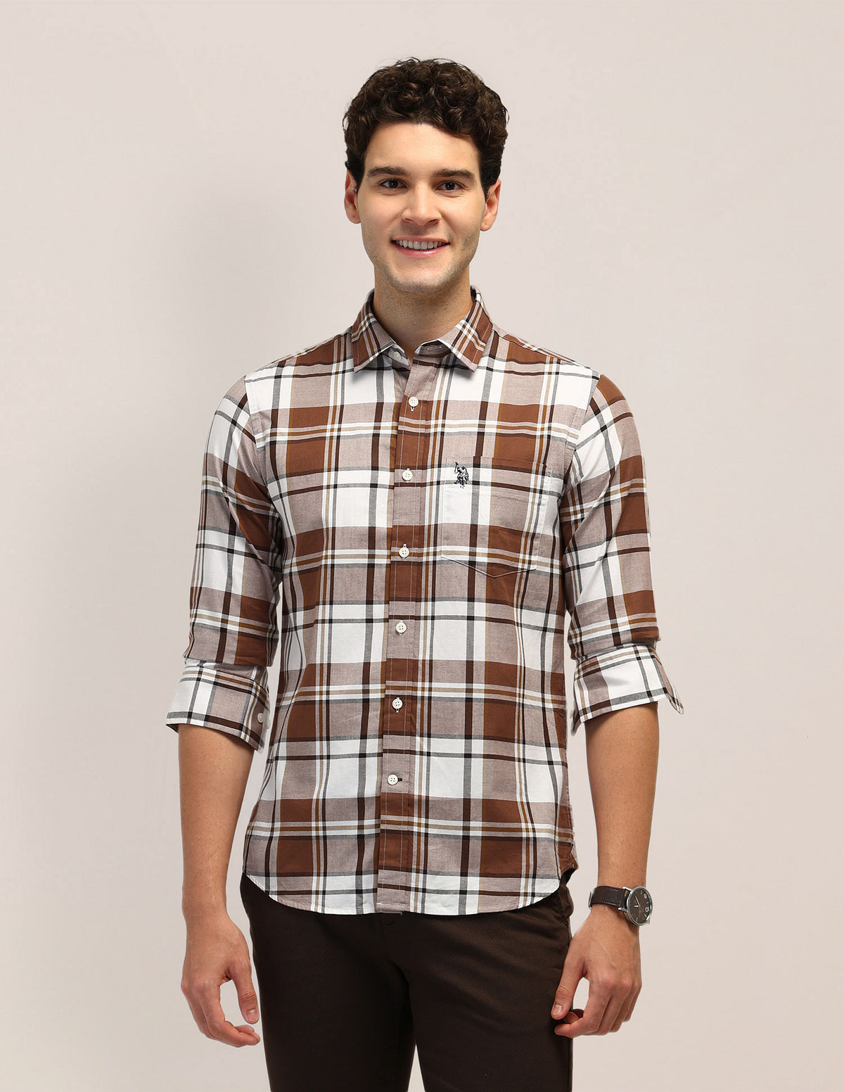 | Semi-spread collar | Logo at chest | Full button placket | Long sleeves with rounded cuffs | Curved hemline | Tartan checked pattern | Dobby weave | Tailored fit |