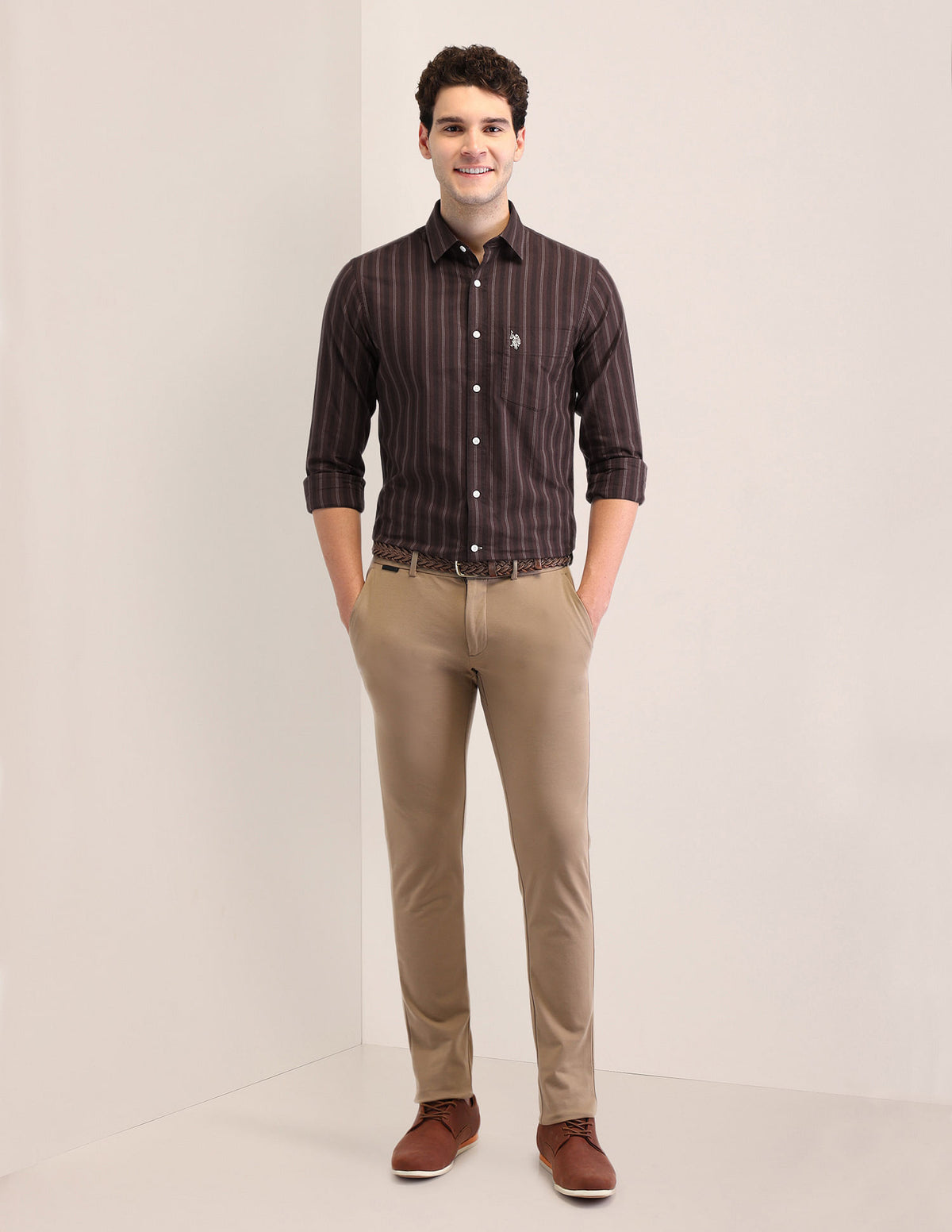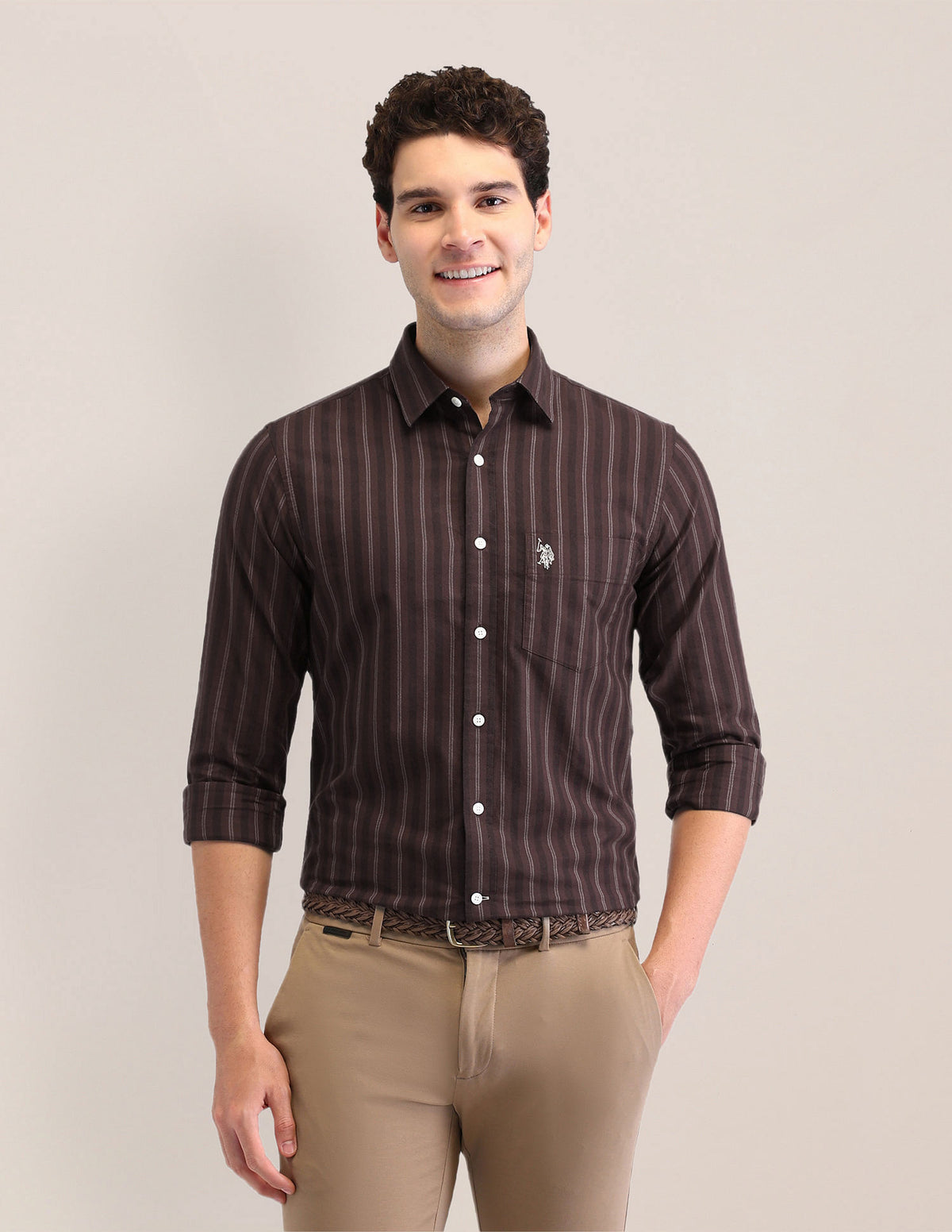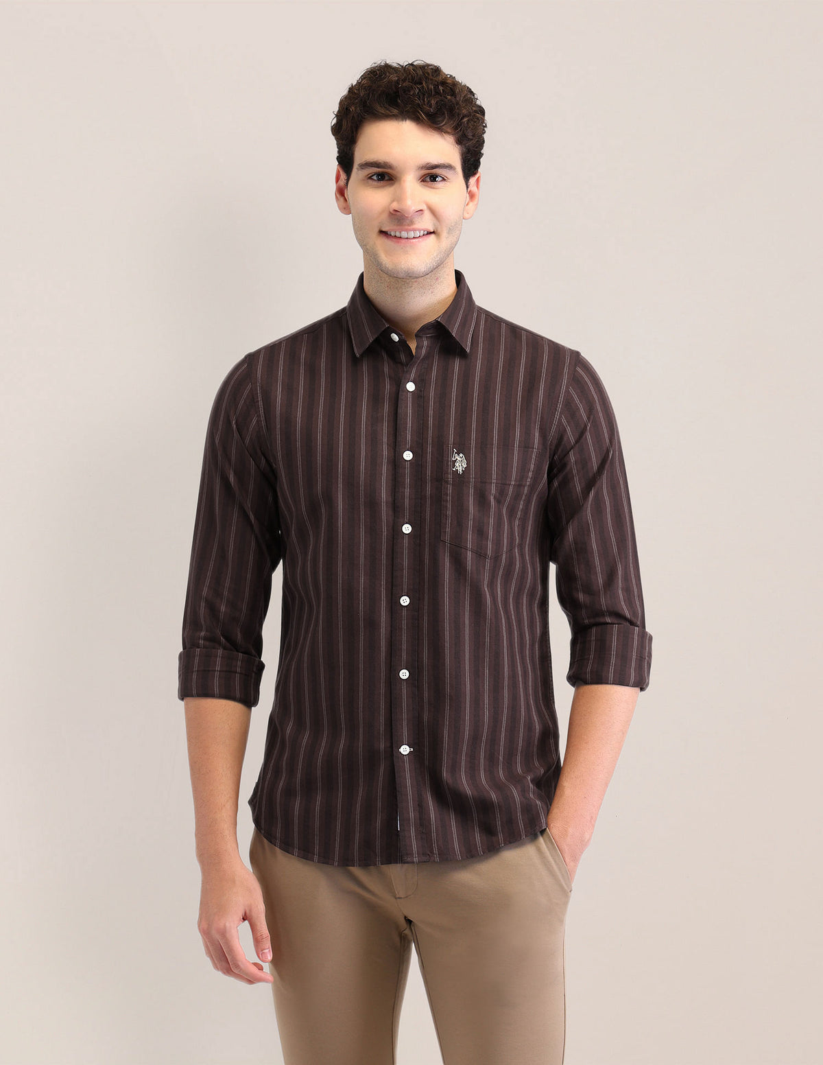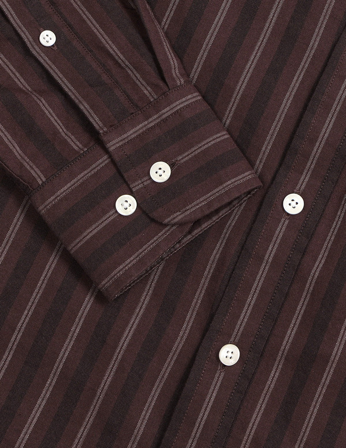 | Semi-spread collar | Logo at chest | Full button placket | Long sleeves with rounded cuffs | Curved hemline | Vertical striped pattern | Oxford weave | Tailored fit |