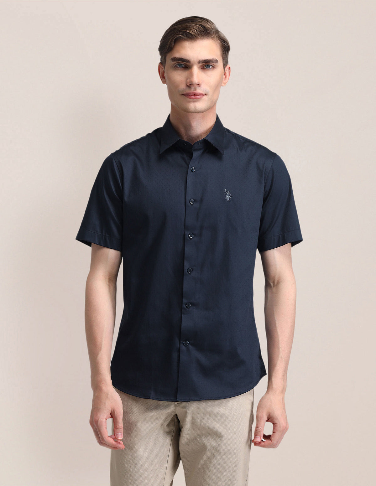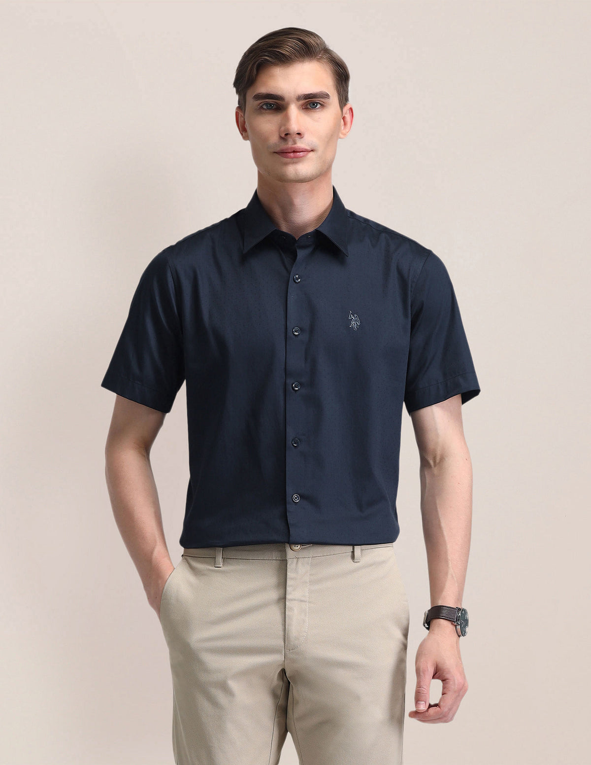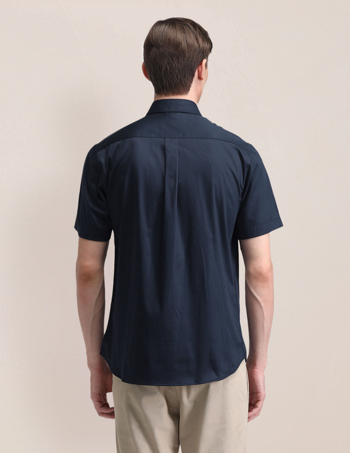 | Semi-cutaway collar | French button placket | Short sleeves | Curved hemline | Solid pattern | Satin weave | Brand fit: Tailored fit | Fit mapping: Regular fit