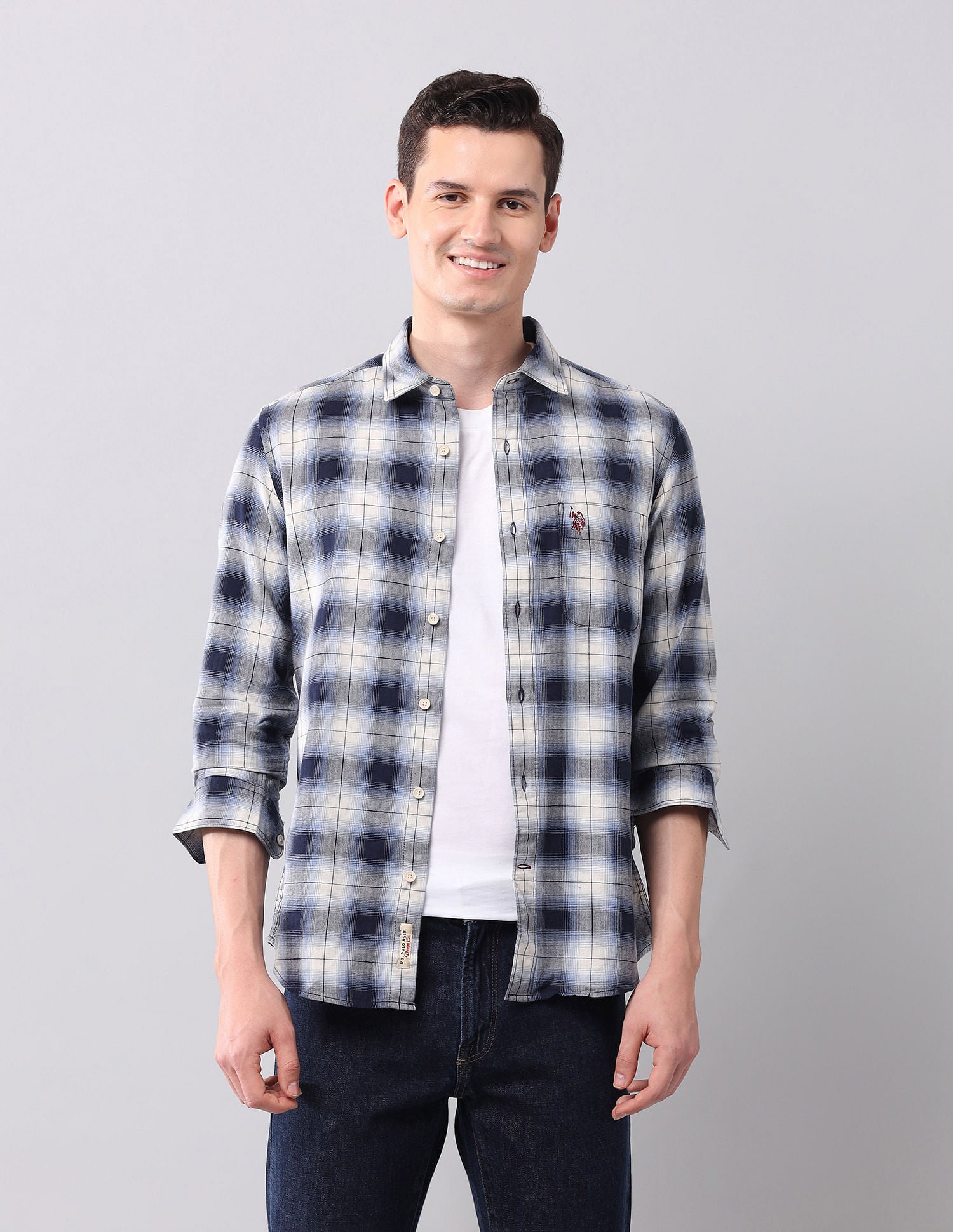 | Semi-cutaway collar | Chest patch pocket | Full button placket | Long sleeves with rounded cuffs | Curved hemline | Tartan checked pattern | Herringbone weave | Regular fit |