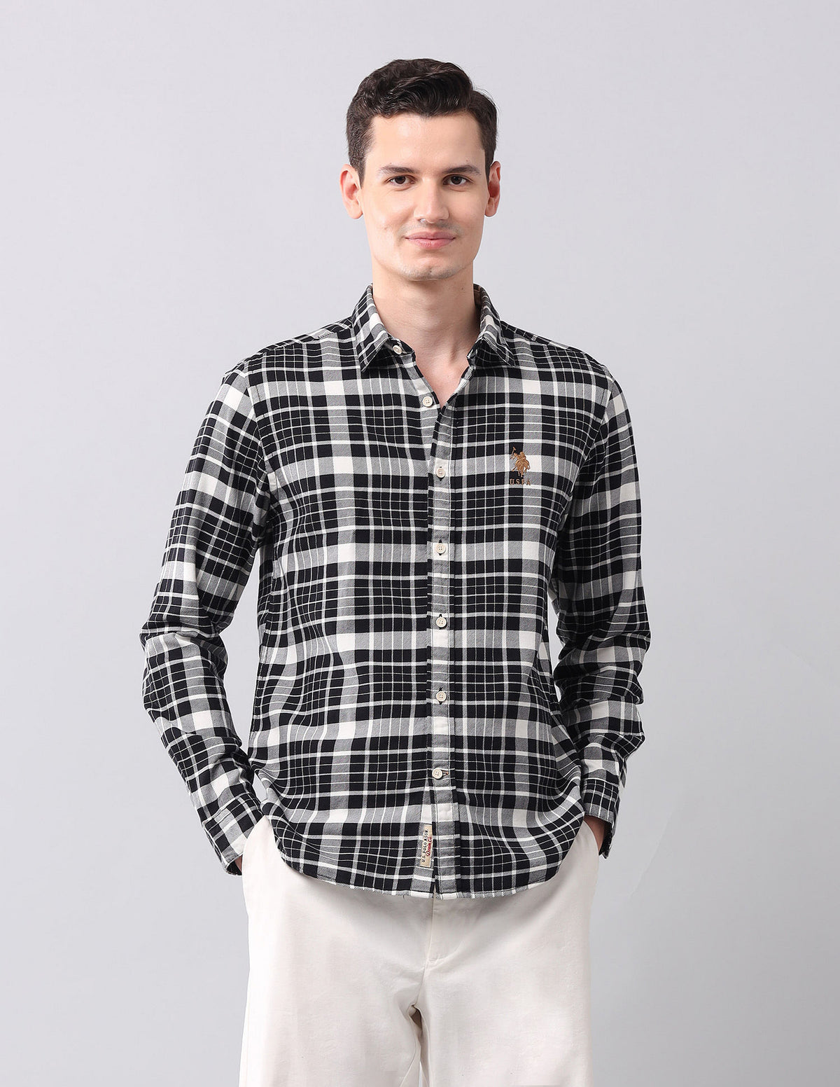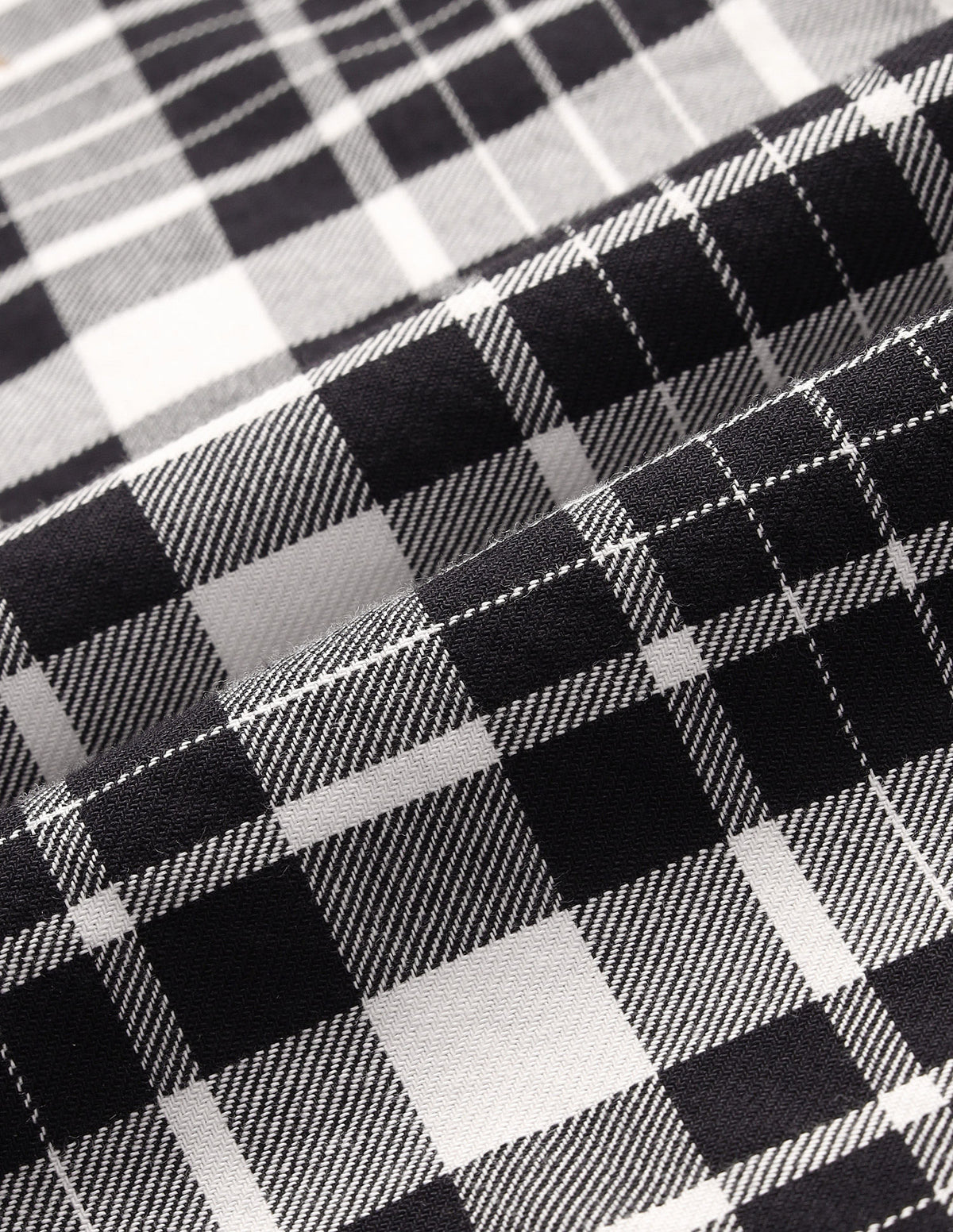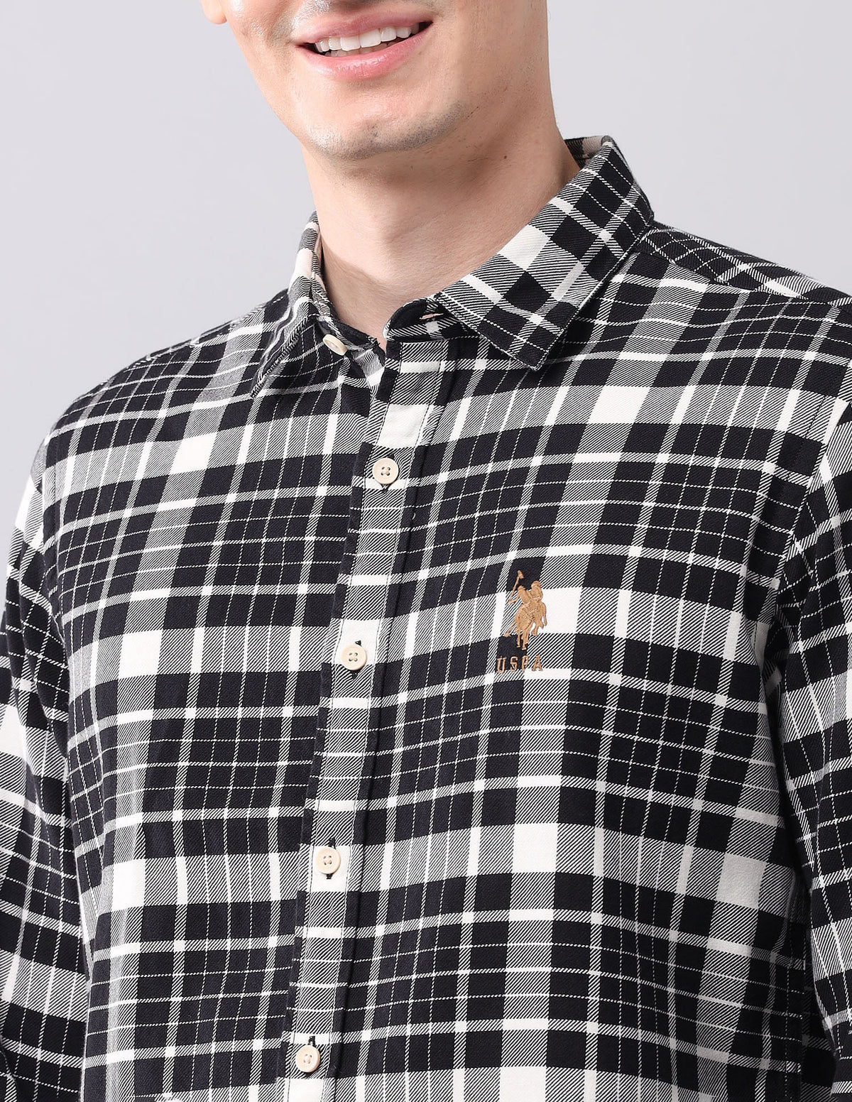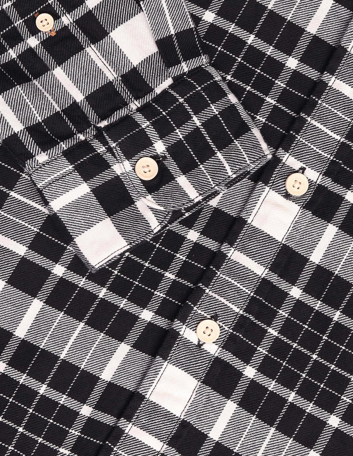 | Semi-cutaway collar | Chest patch pocket | Full button placket | Long sleeves with rounded cuffs | Curved hemline | Tartan checked pattern | Twill weave | Regular fit |
