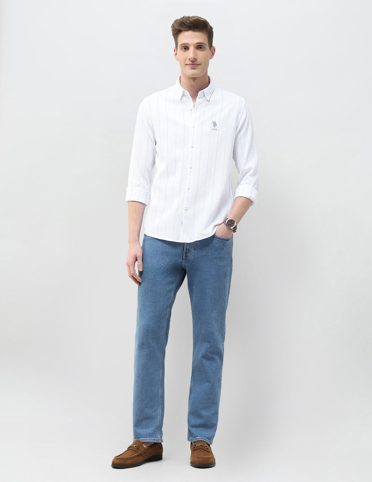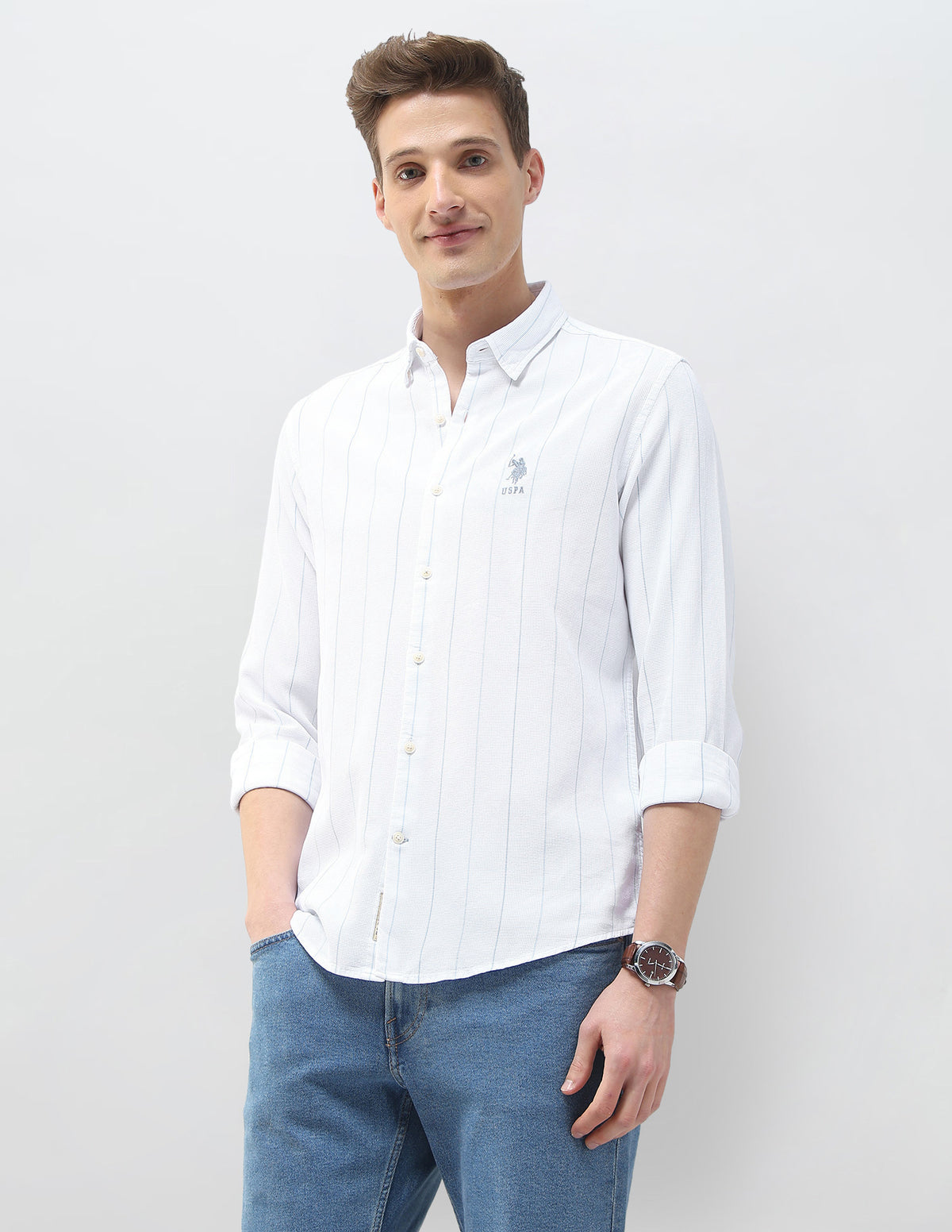 Story: From the Motel On The Coast collection, this men's vertical-striped shirt features yds indigo dobby fabric for refined casual elegance.