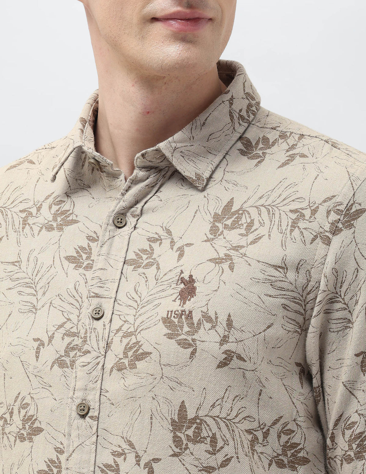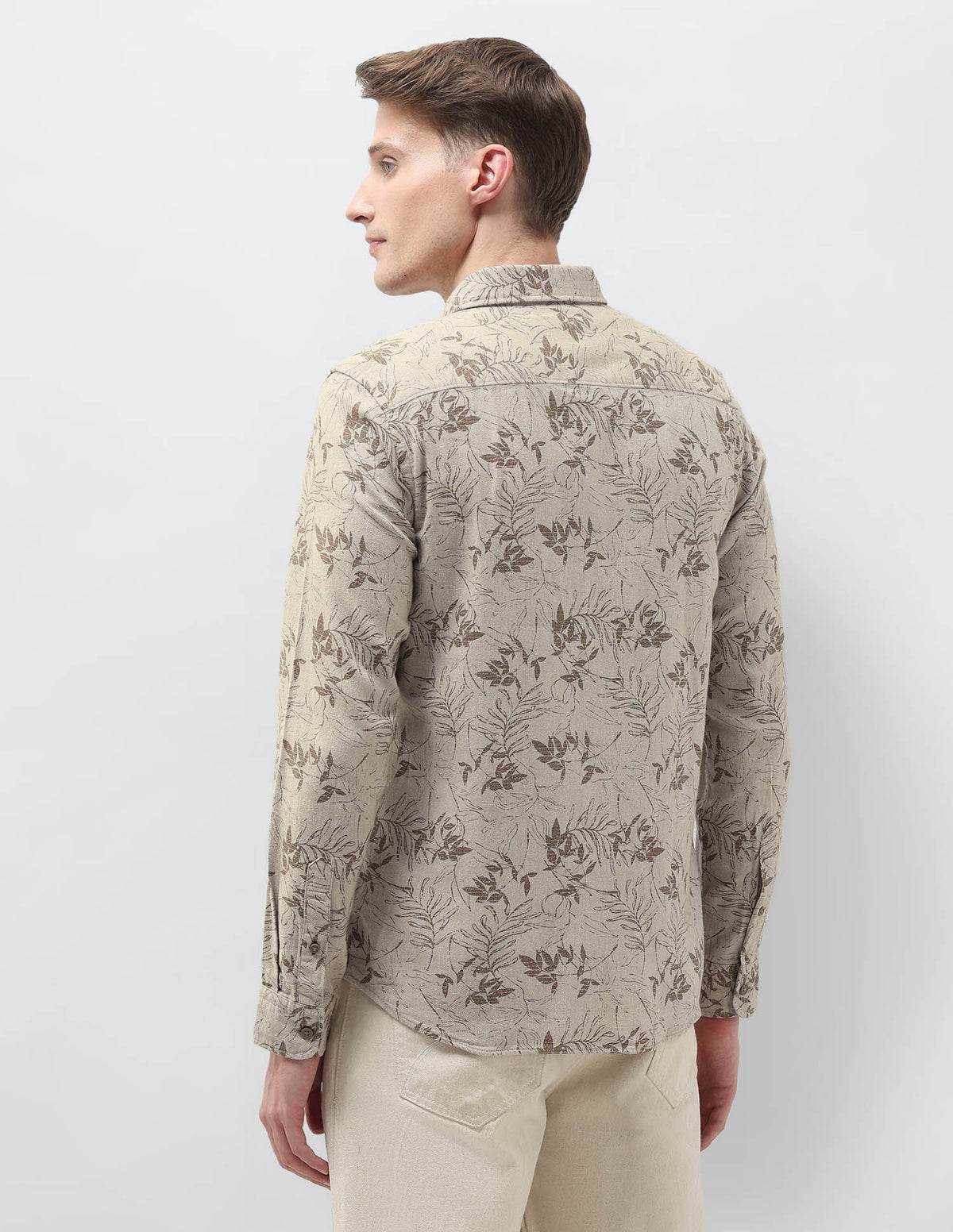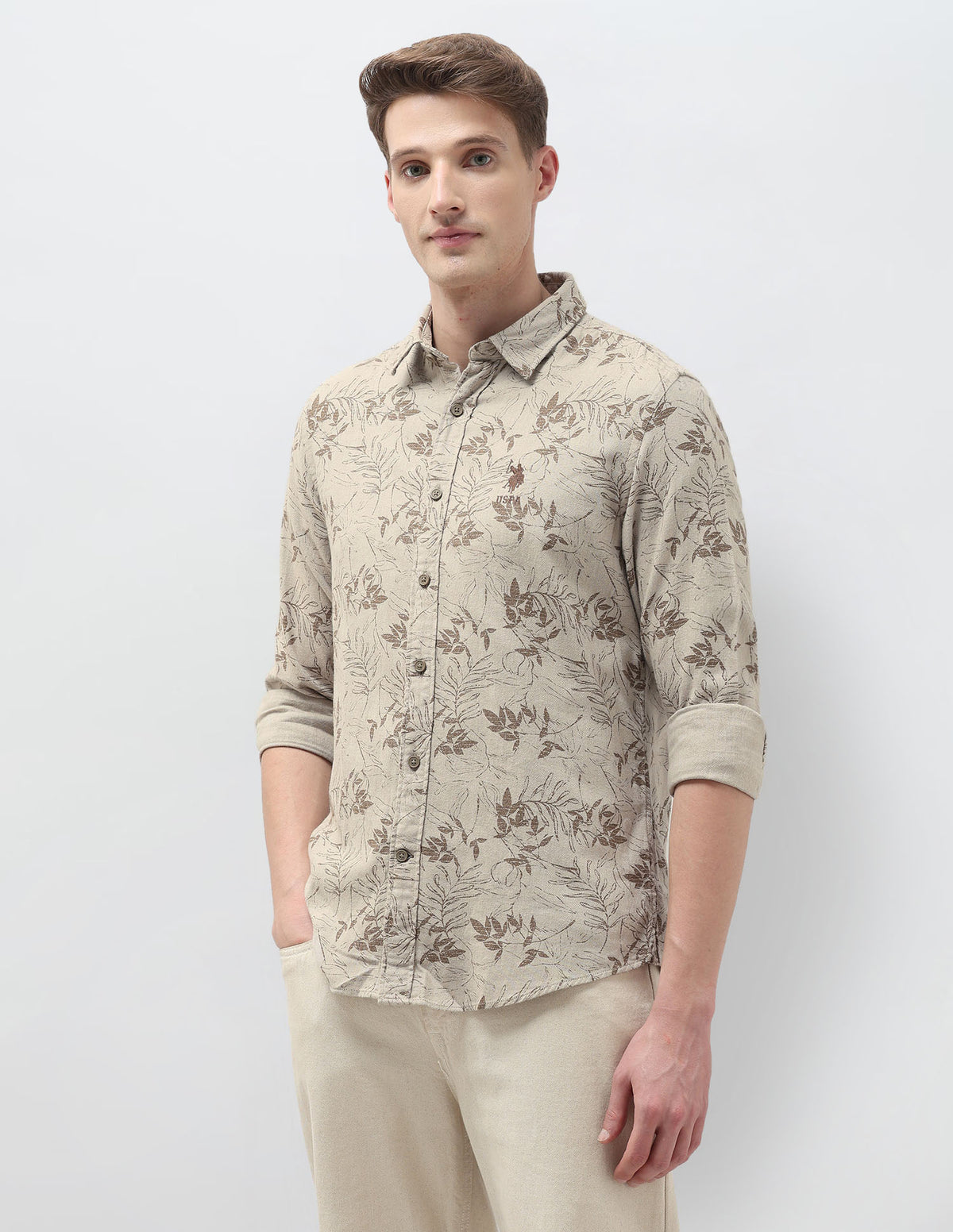 Story: This men's leaf-print shirt captures botanical elegance and casual charm, offering a fresh perspective on everyday style with comfortable, breathable wearability and natural appeal.