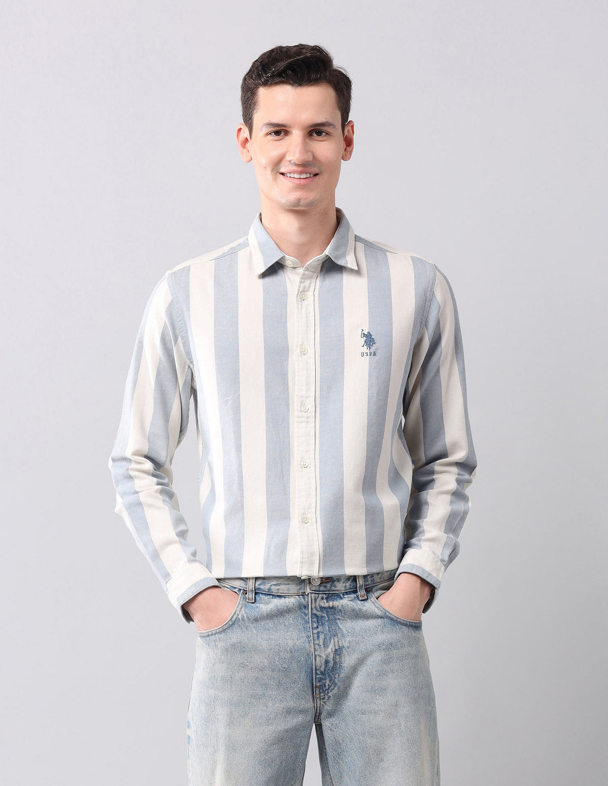 | Semi-cutaway collar | Logo at chest | Full button placket | Long sleeves with rounded cuffs | Curved hemline | Vertical striped pattern | Twill weave | Regular fit |
