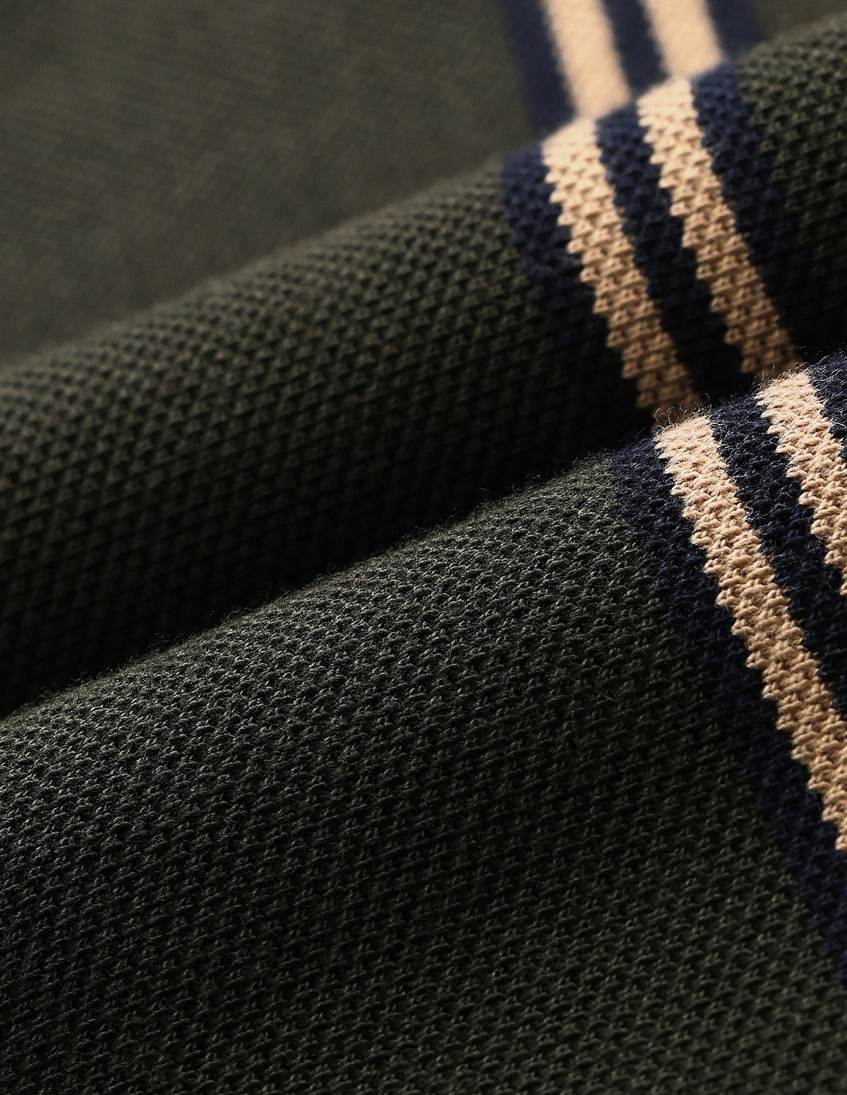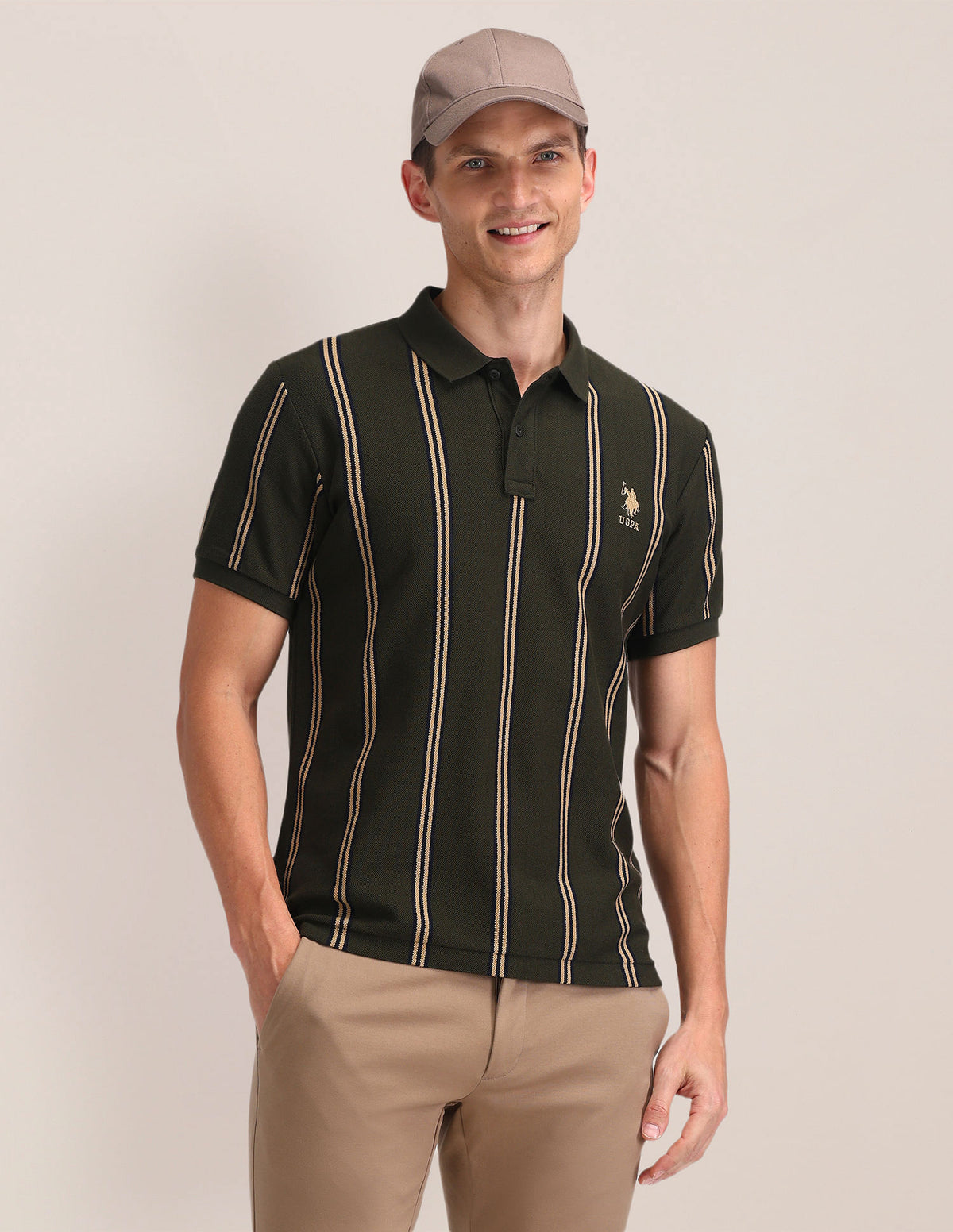 | Polo collar | Logo at chest | Short button placket | Short sleeves | Ribbed collar and sleeve hems | Uneven vented hem | Vertical striped pattern | Pique knit | Slim fit