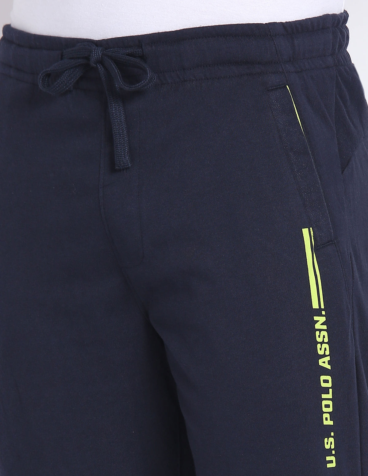 - Solid pattern with bold contrast branding on left leg