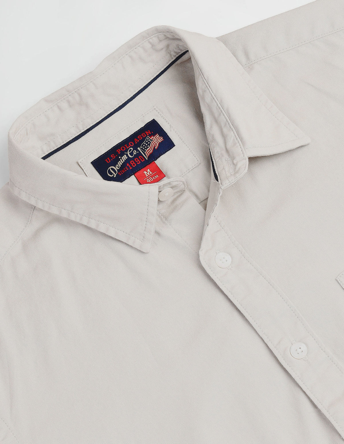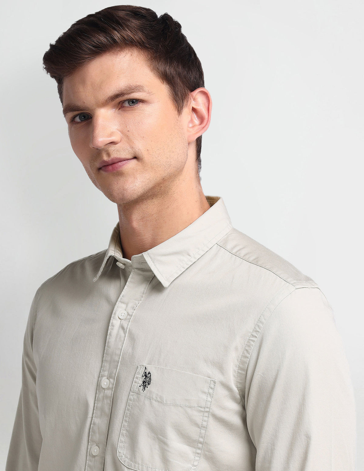 | Semi-cutaway collar | Chest patch pocket | Full button placket | Long sleeves with rounded cuffs | Curved hemline | Solid pattern | Twill weave | Slim fit | Country Of Origin - India| AW-24